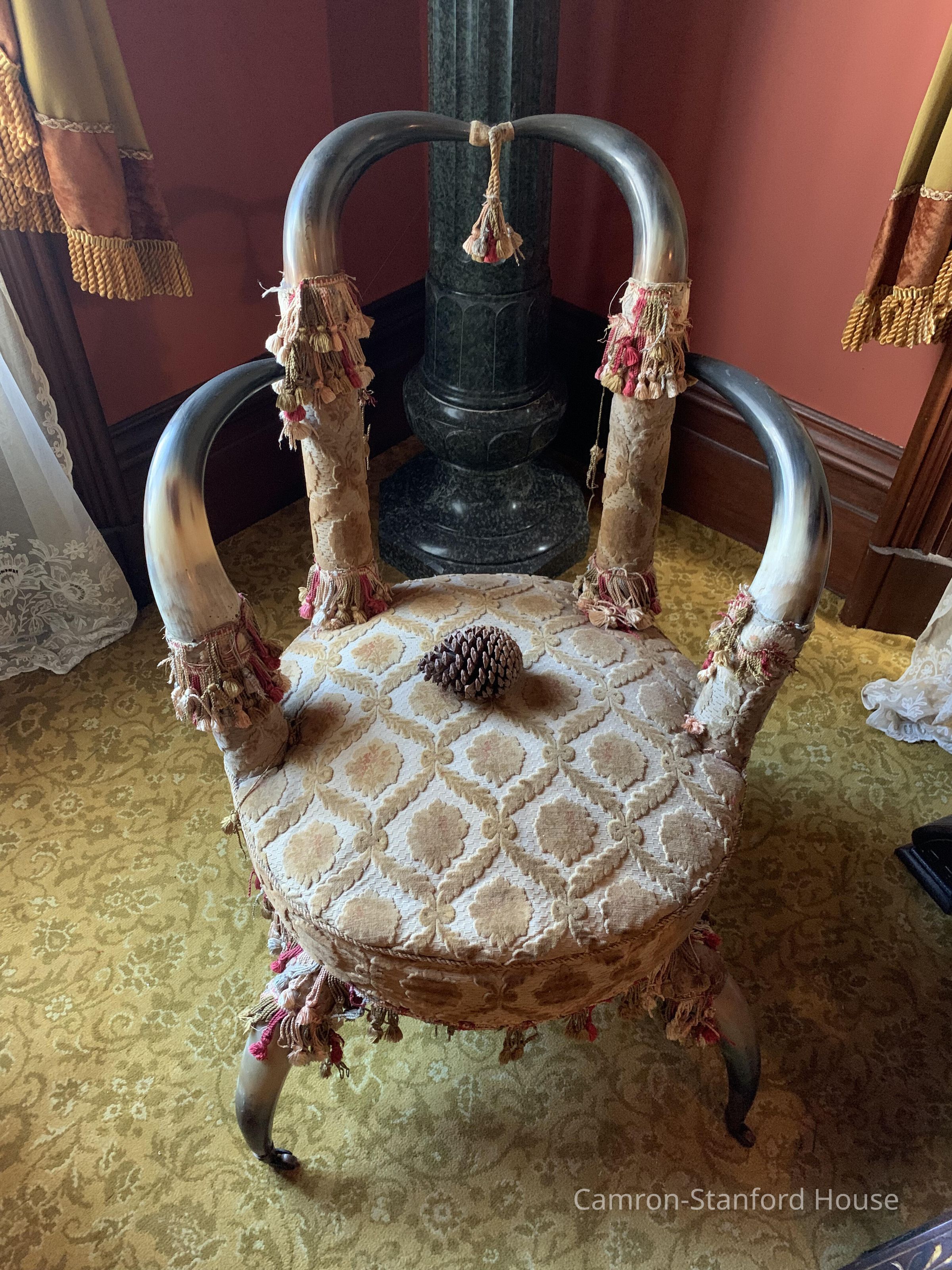 Nineteenth-century steer horn armchair with cut velvet upholstery. Originally from the estate of Polish Opera Singer Ganna Walska, who created the Lotusland botanical gardens at her mansion in Montecito, California.