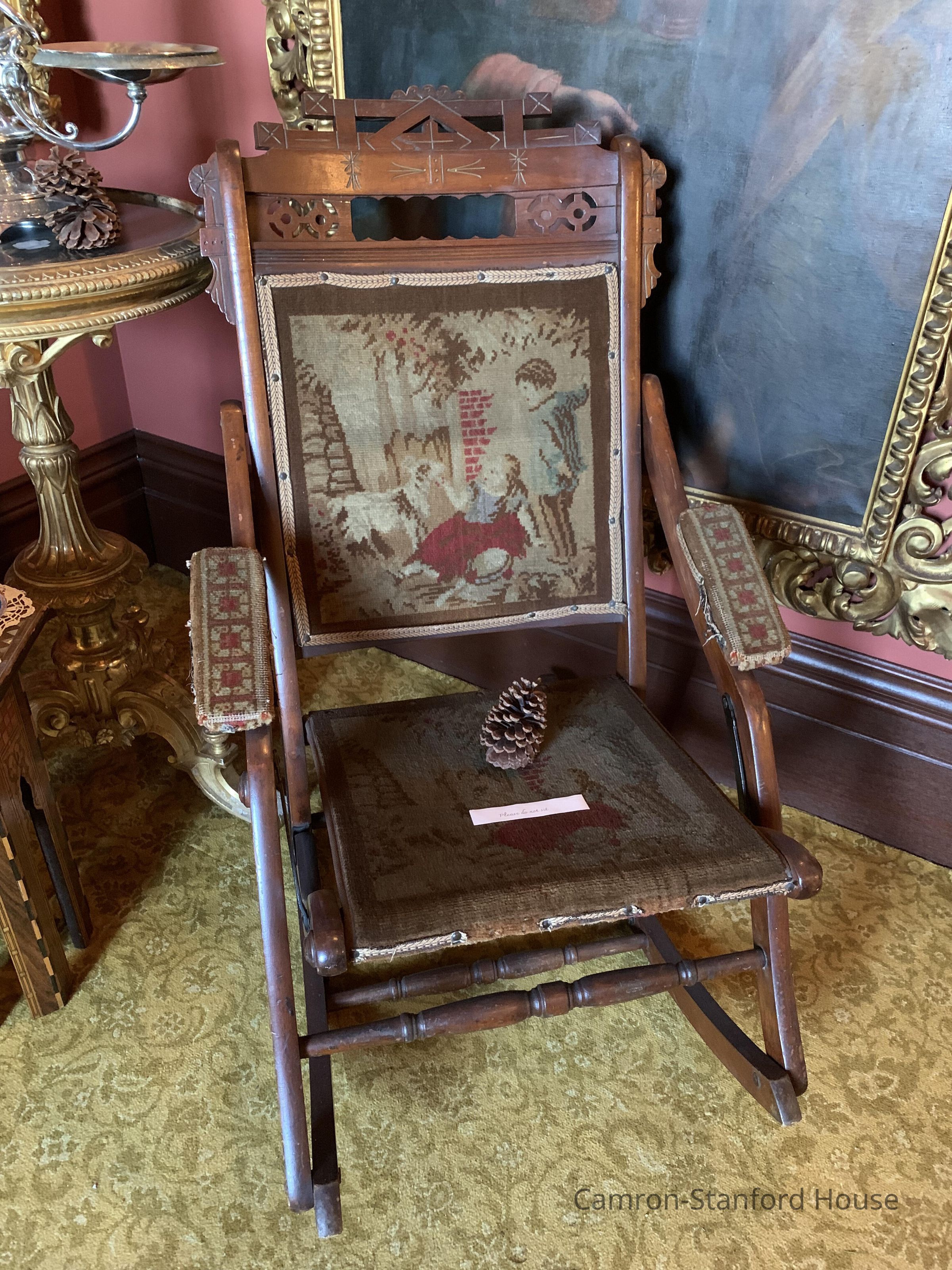 Wooden rocking chair with fabric back and seat panels. Panels show a scene with a two children and a dog. The artwork on the fabric panels was created using needlepoint.