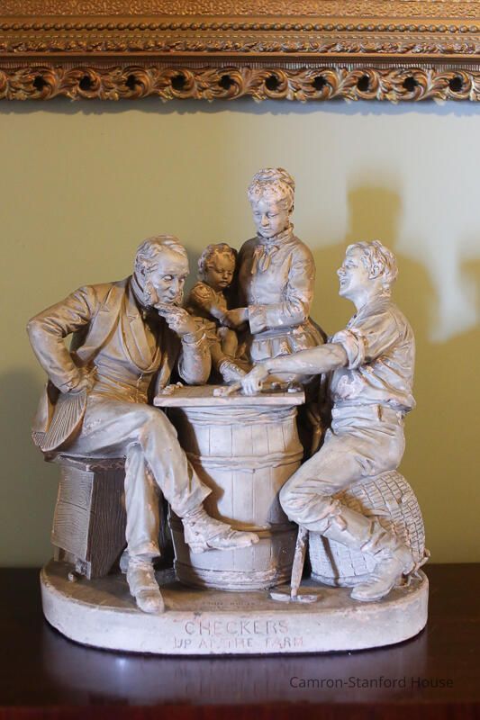 Polychrome (Painted plaster) sculpture depicting a group scene of two men seated playing checkers while a woman and child overlook. Men are seated at a larger make-shift barrel table. One man is seated on a smaller barrel while another is seated on a stool or crate.