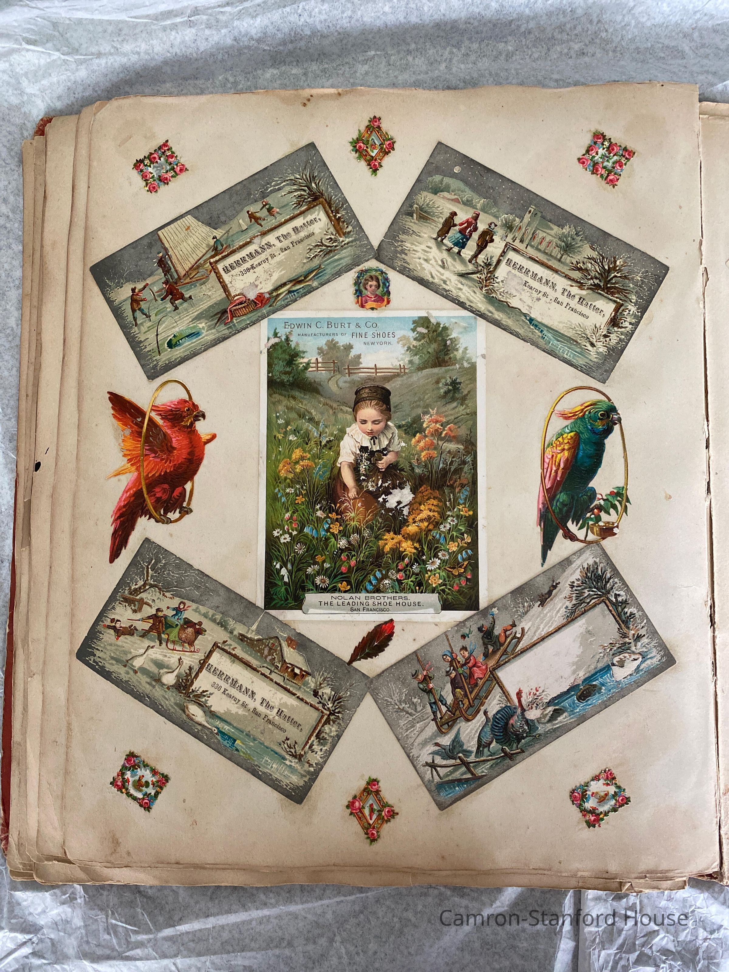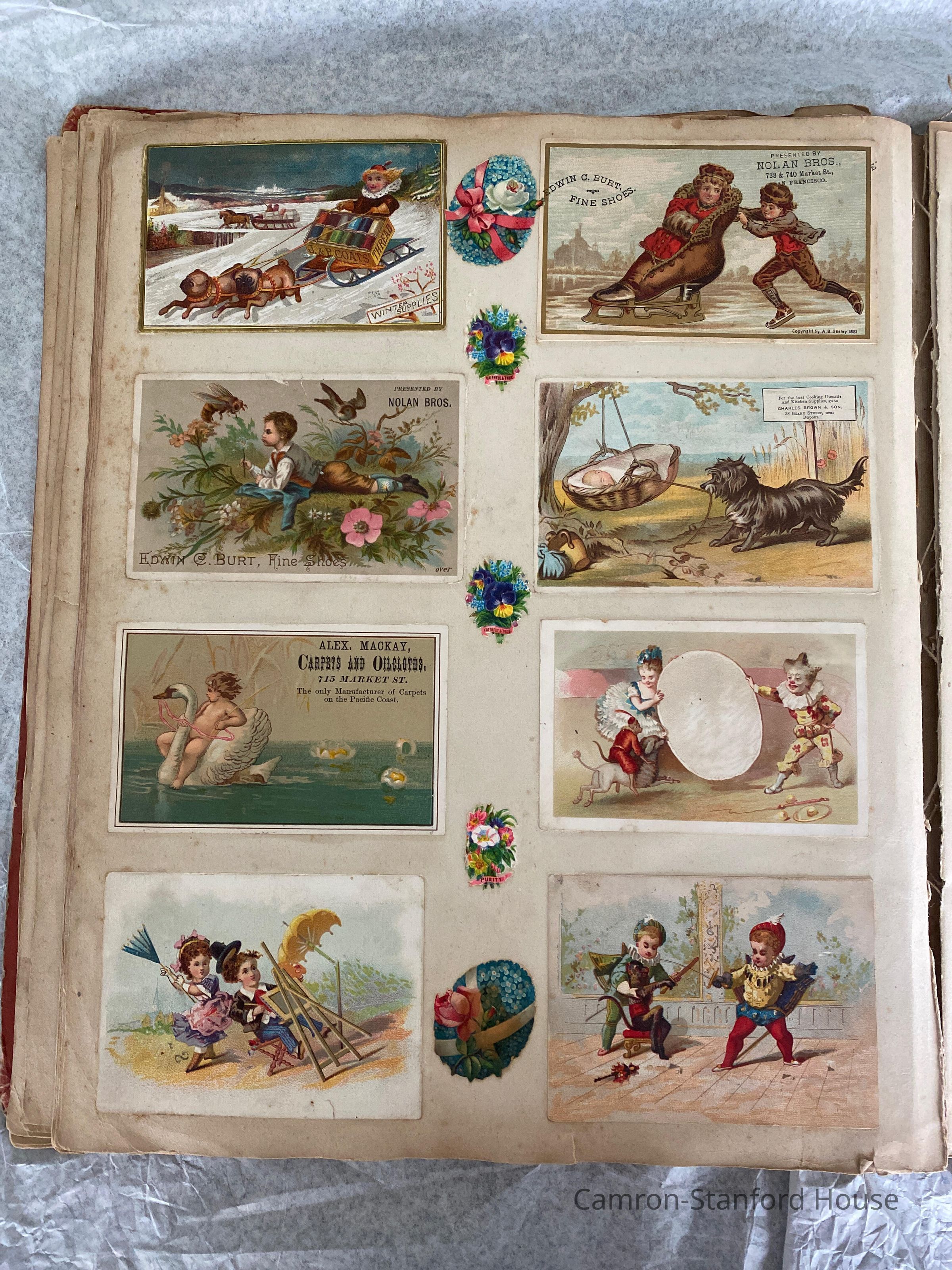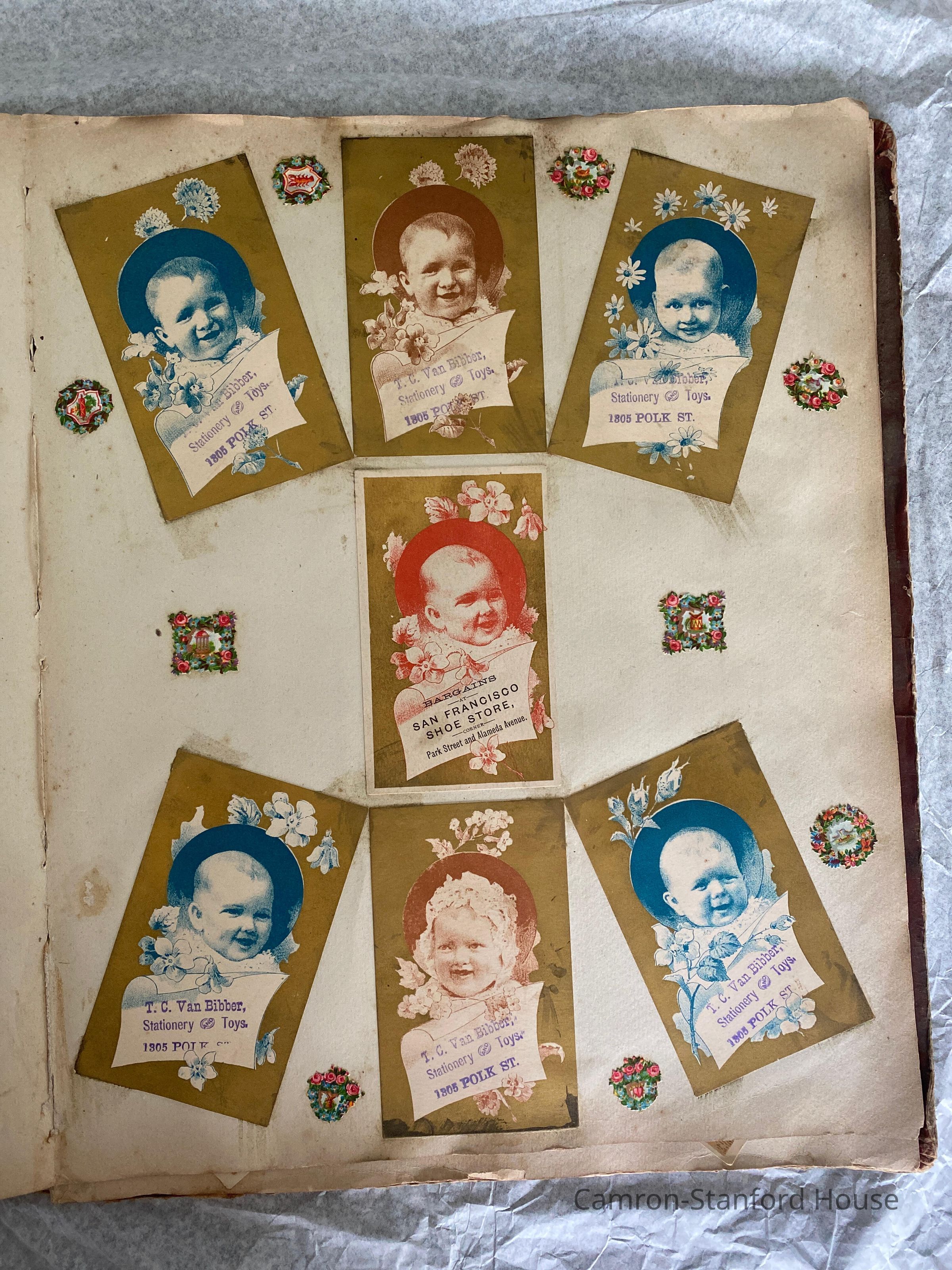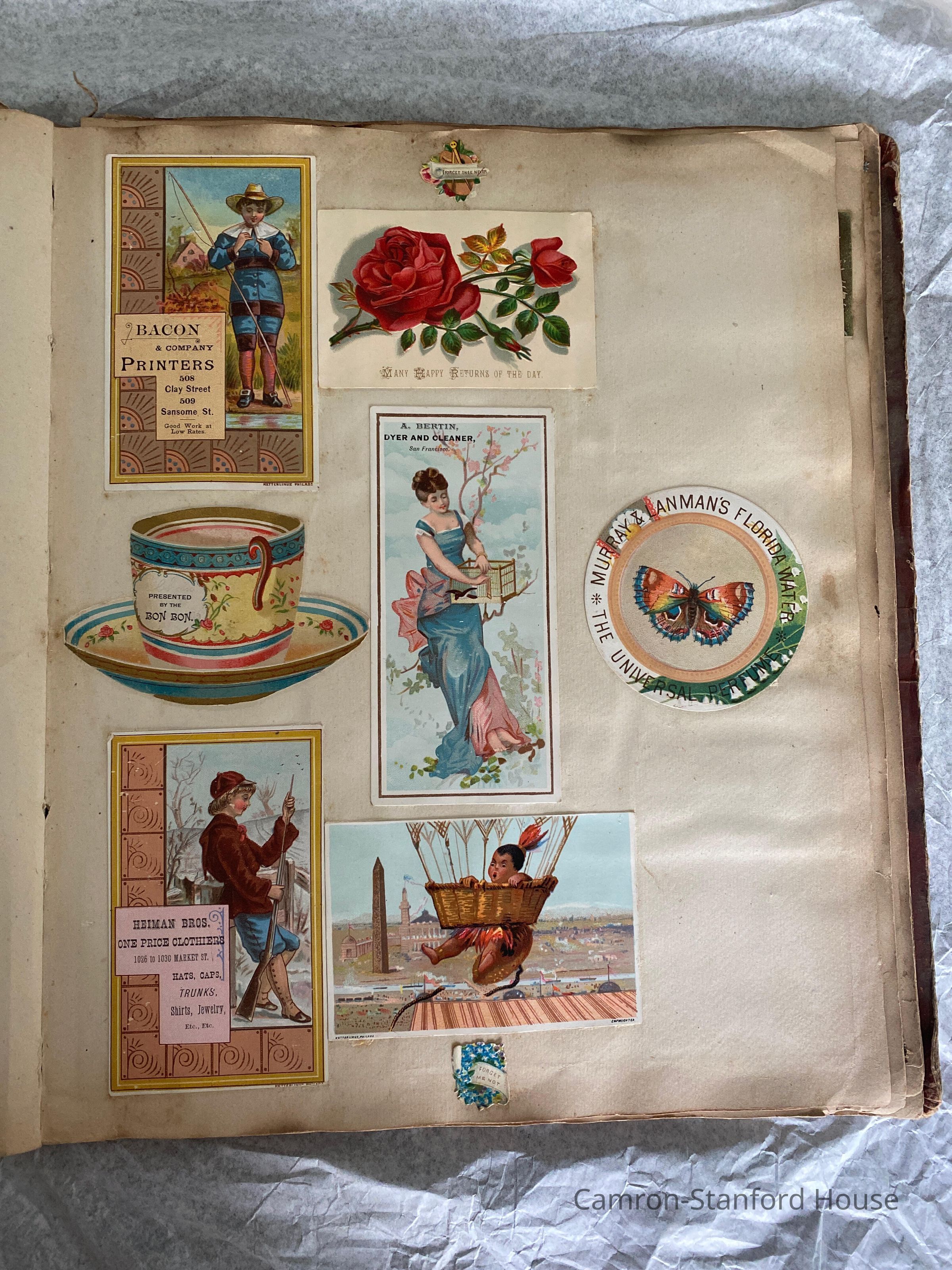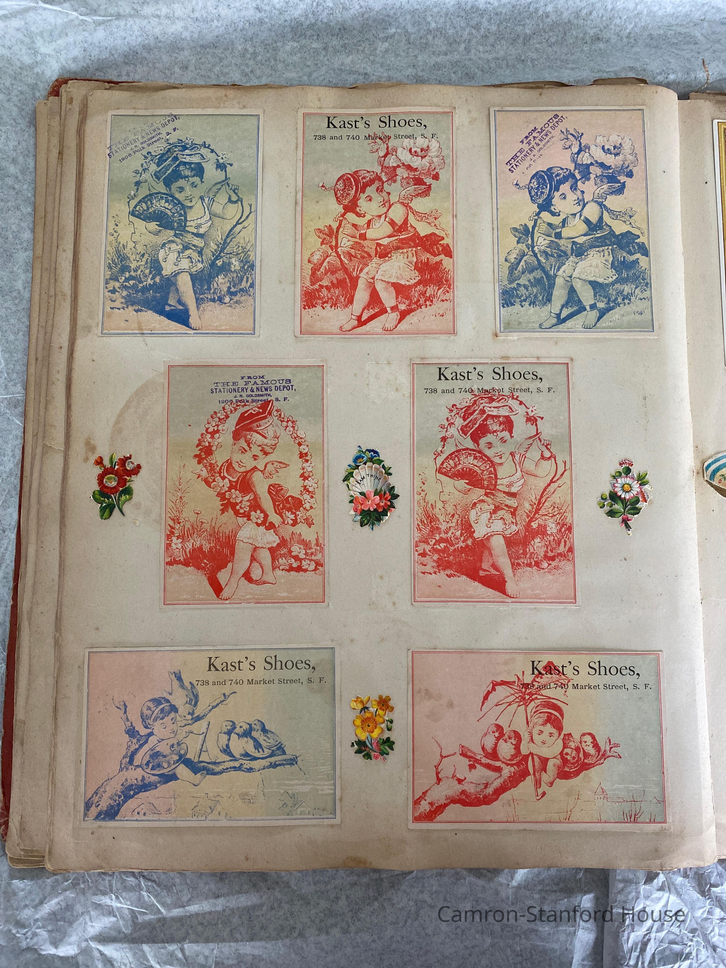 A scrapbook containing over five hundred 19th century trade cards, postcards, and other printed advertisements and ephemera. The majority of the pieces on the pages of this scrapbook are advertisements from San Francisco businesses.