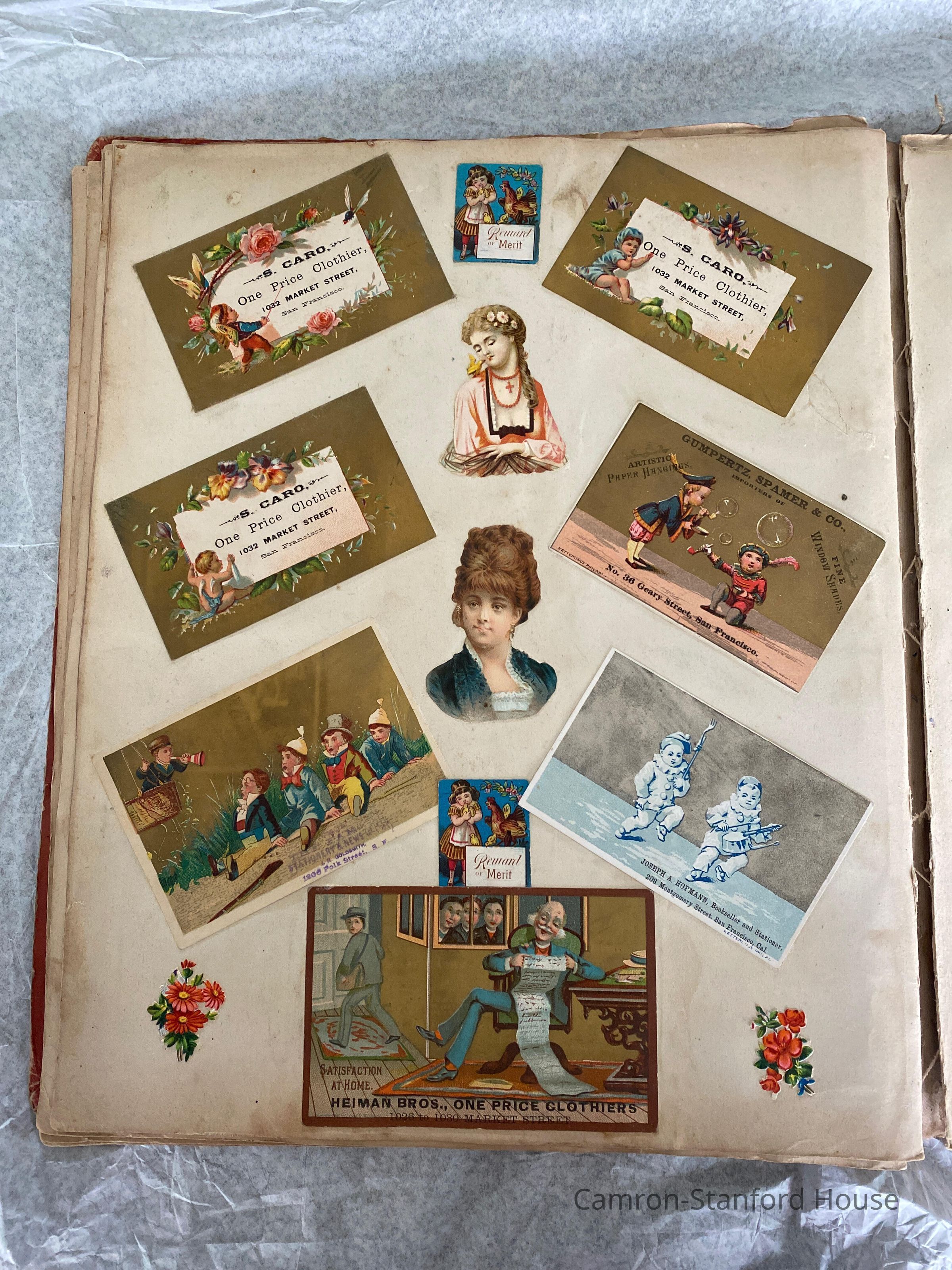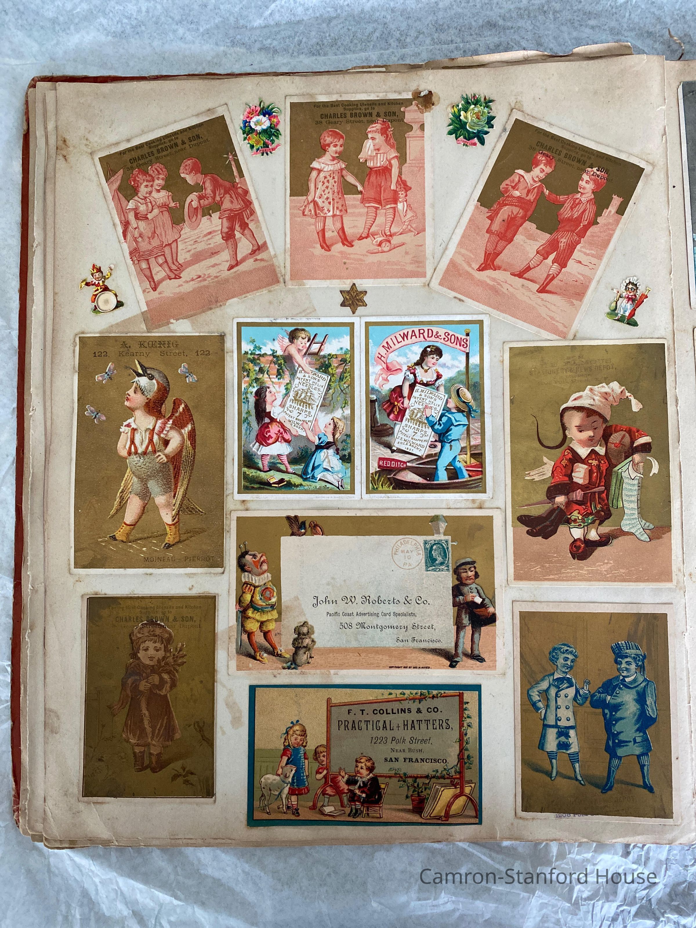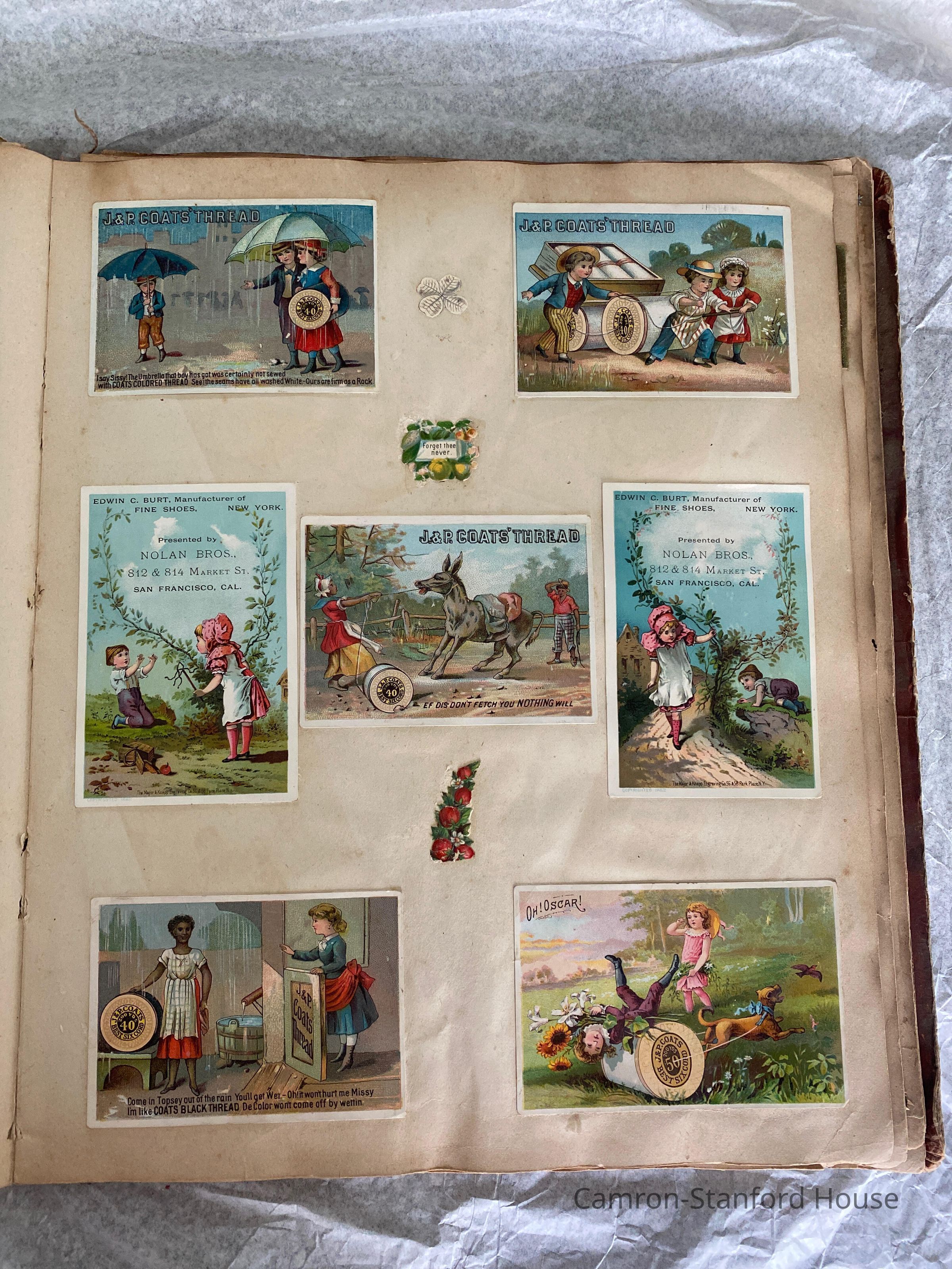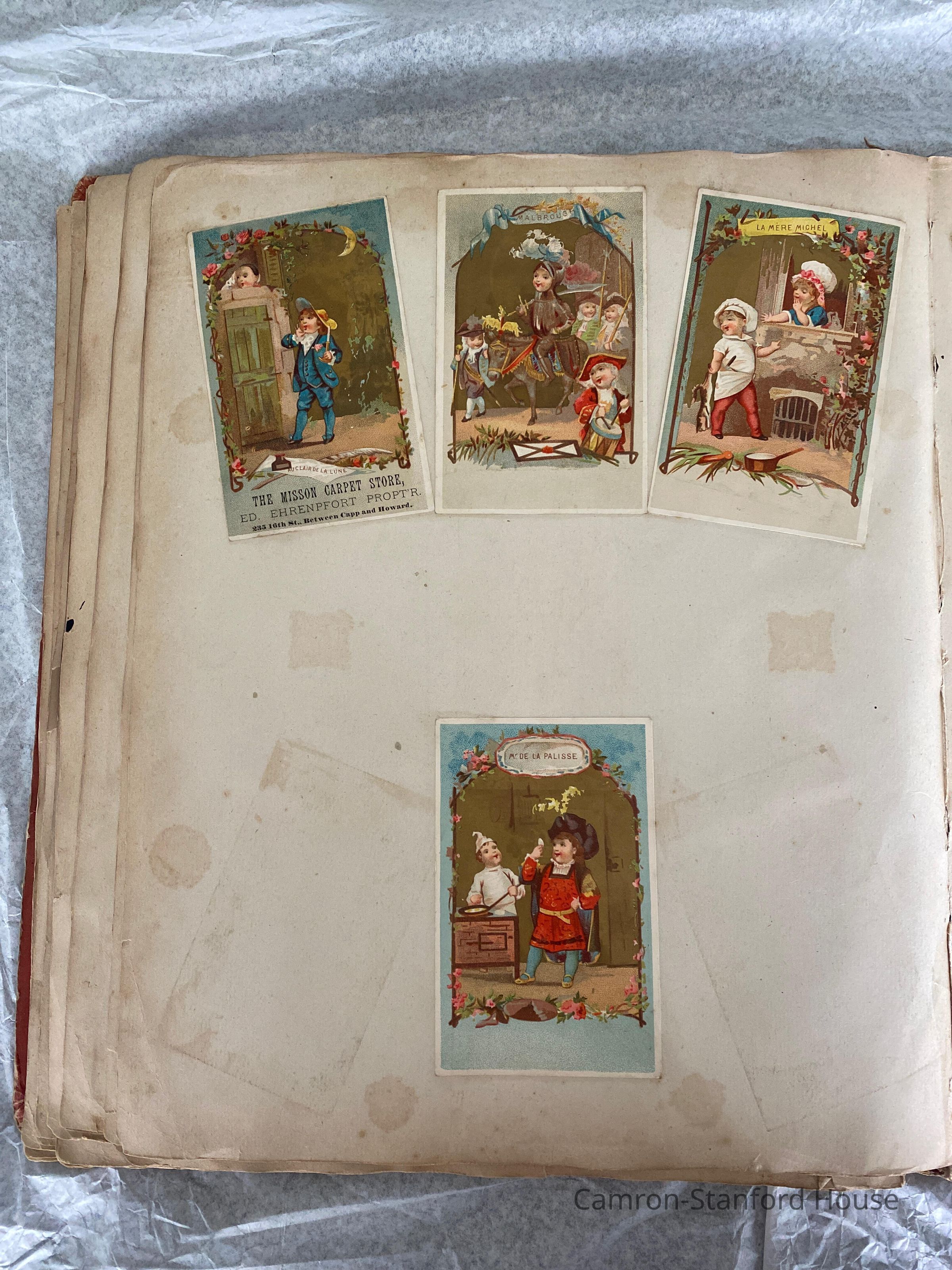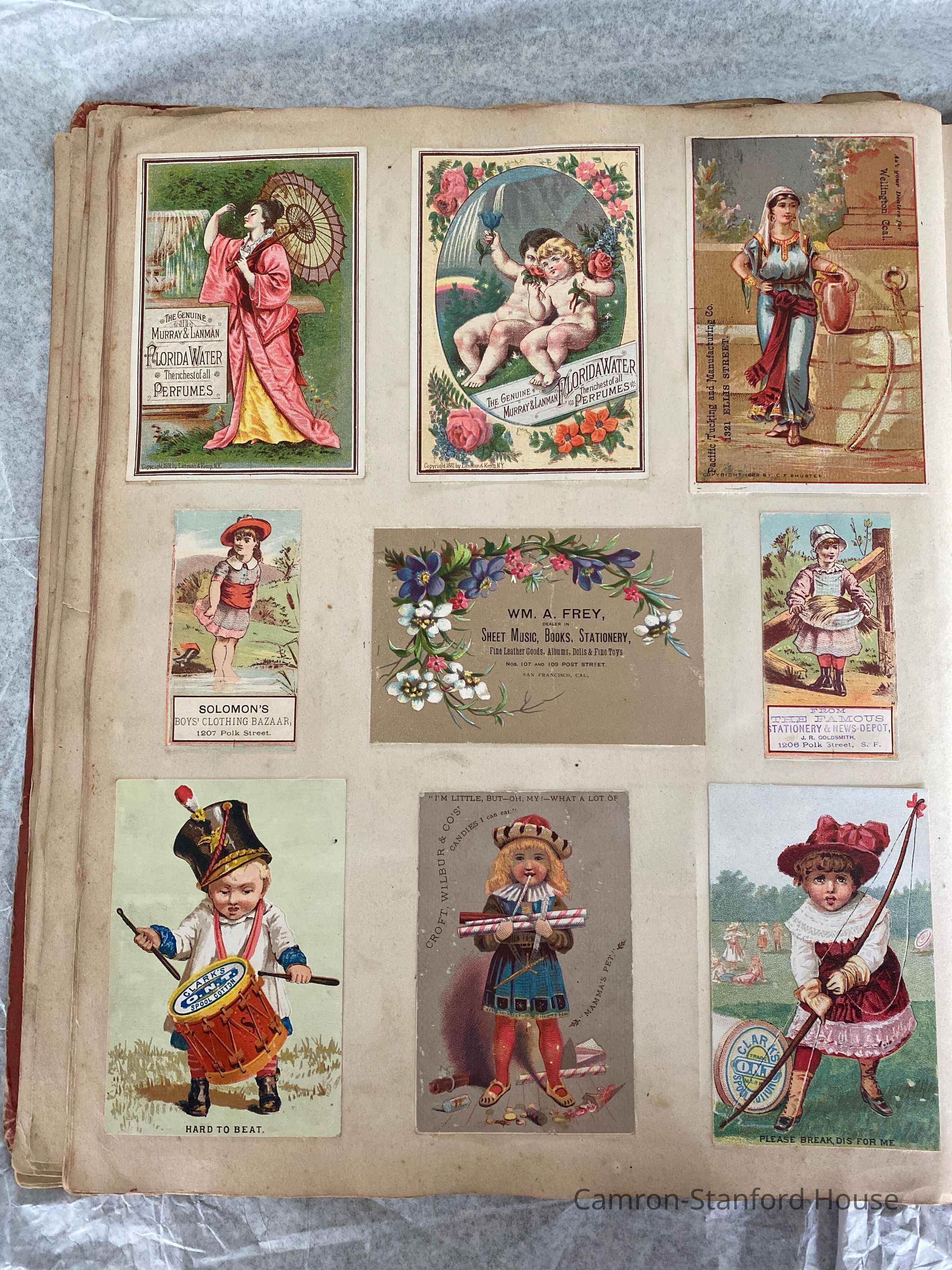 A scrapbook containing over five hundred 19th century trade cards, postcards, and other printed advertisements and ephemera. The majority of the pieces on the pages of this scrapbook are advertisements from San Francisco businesses.