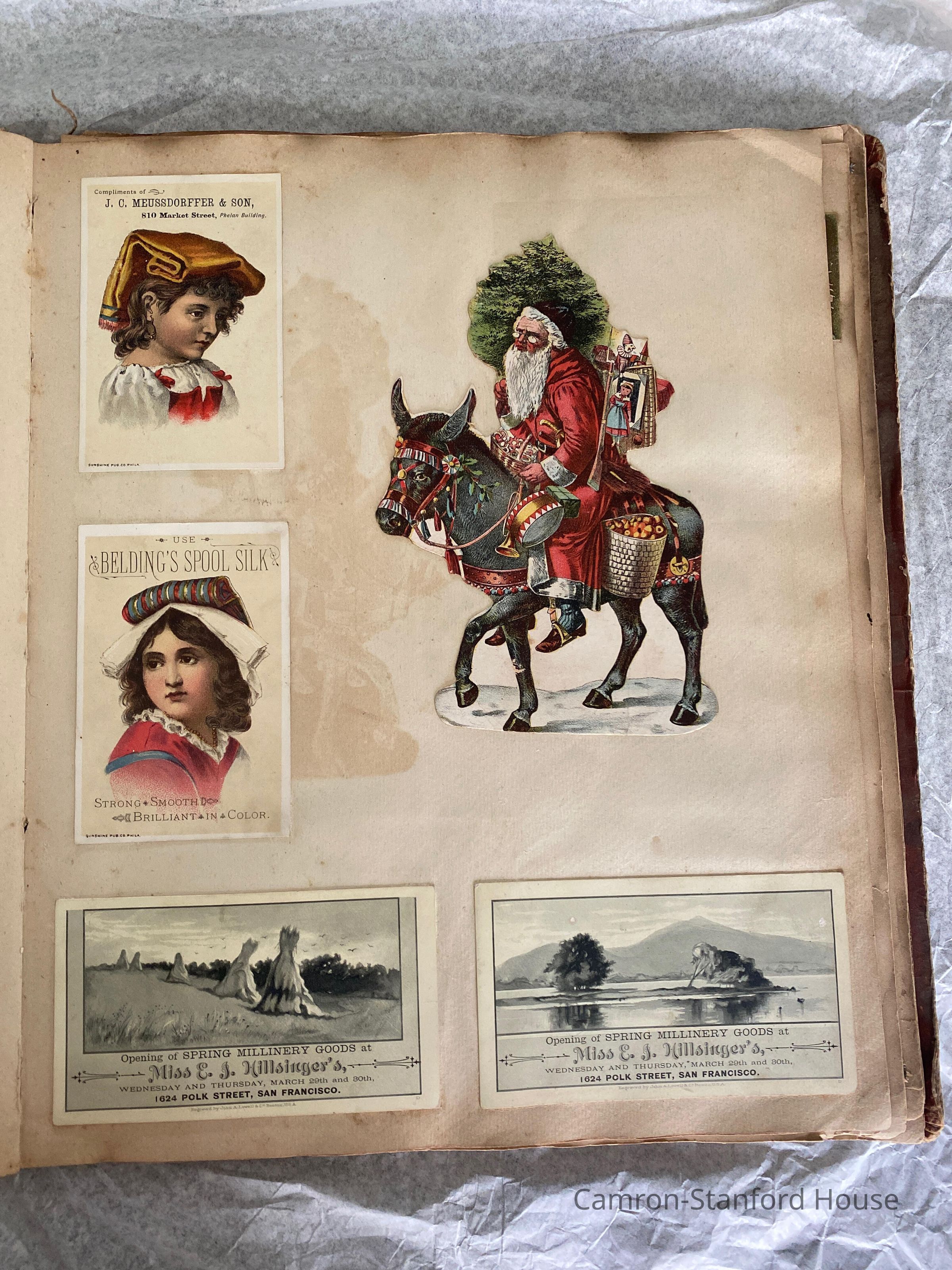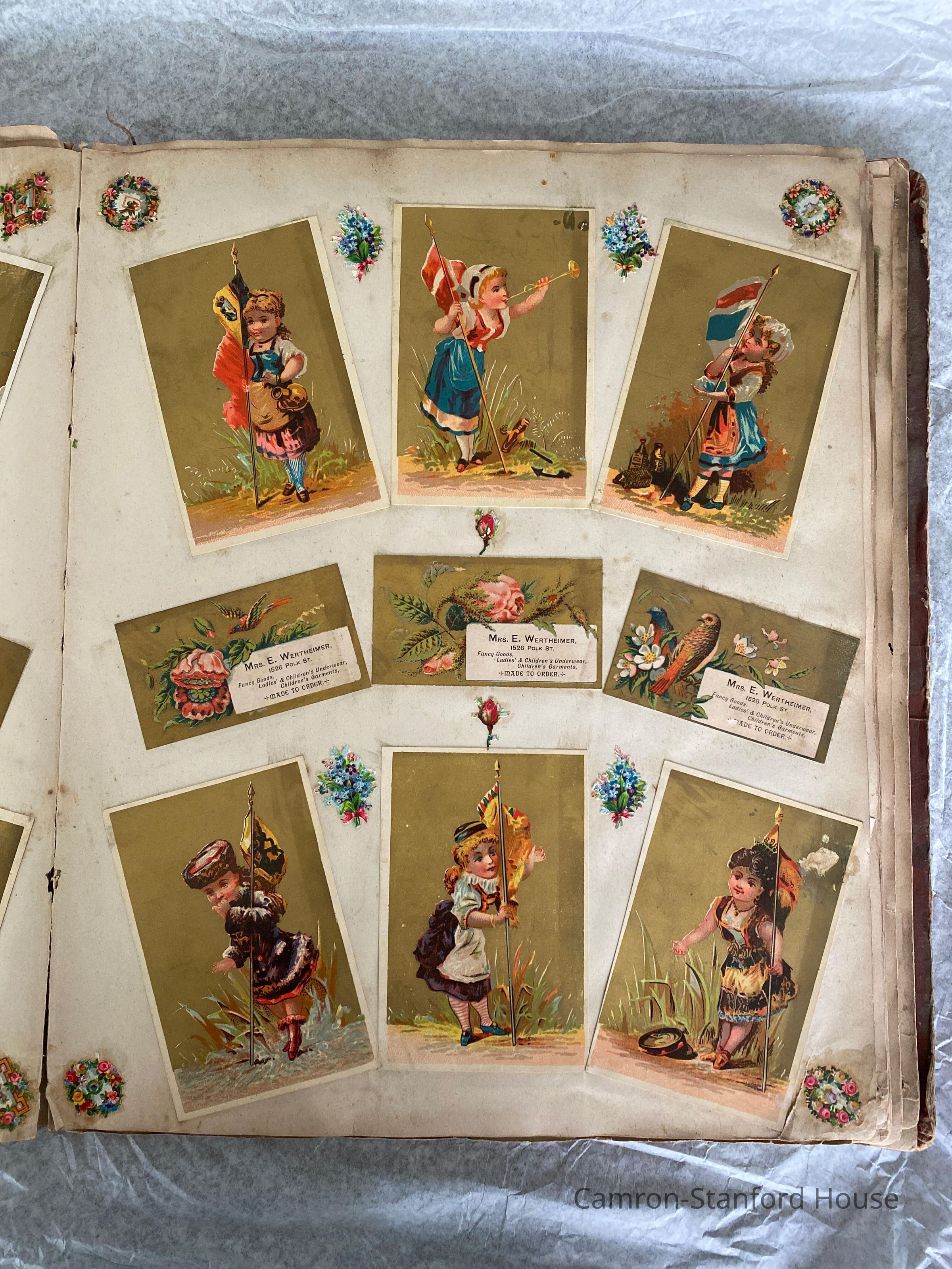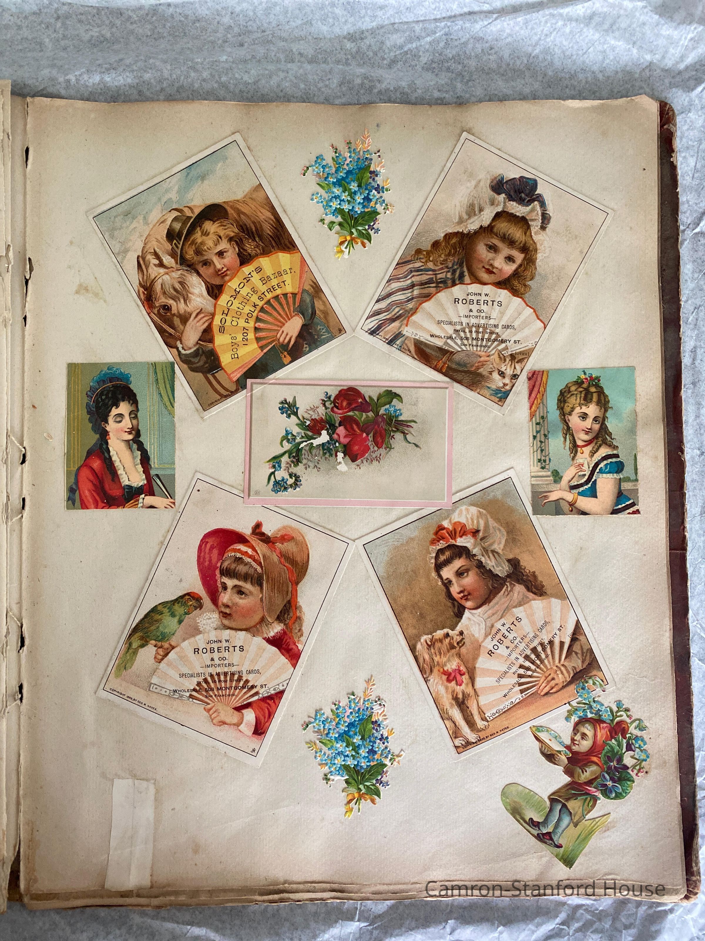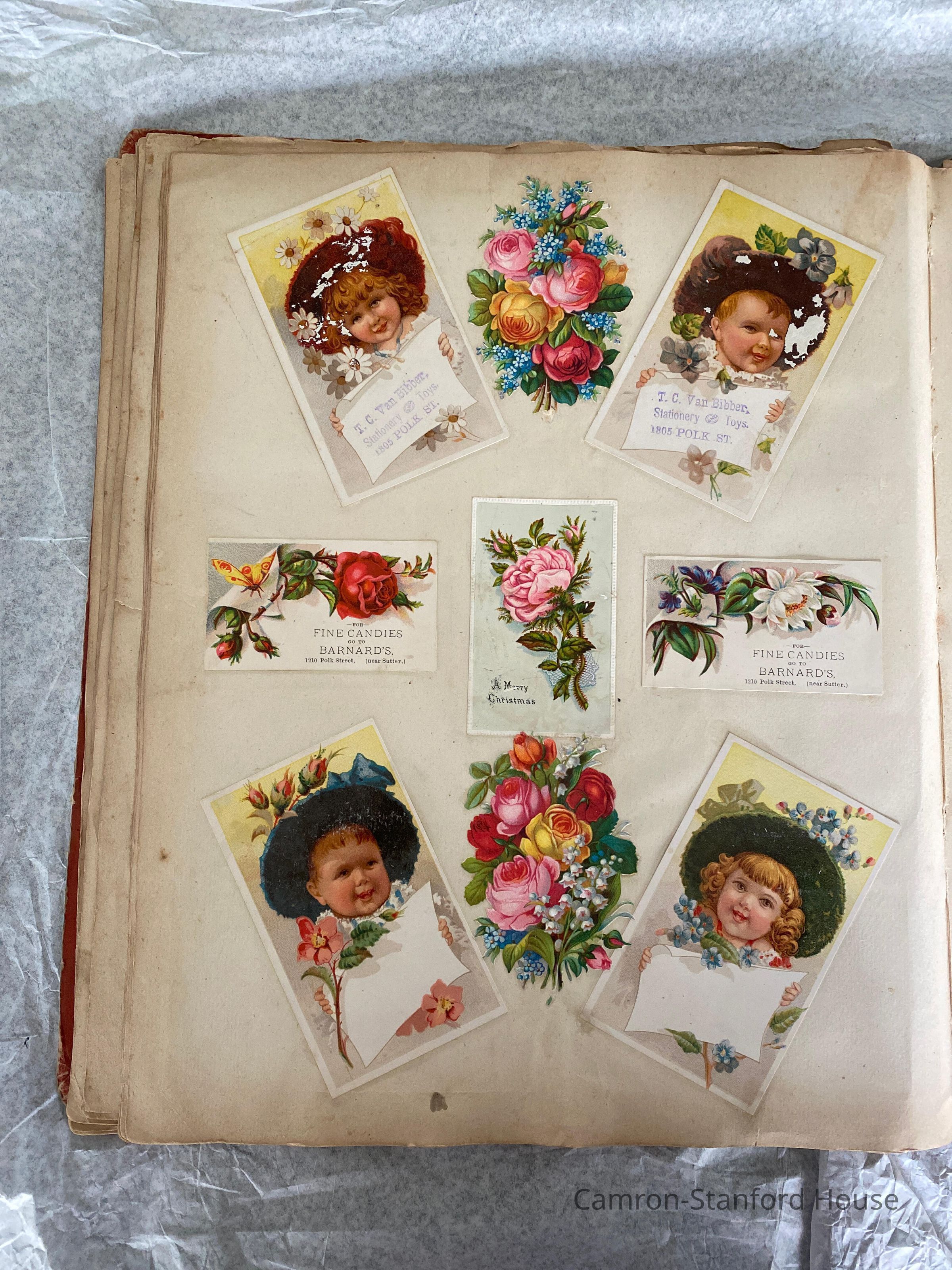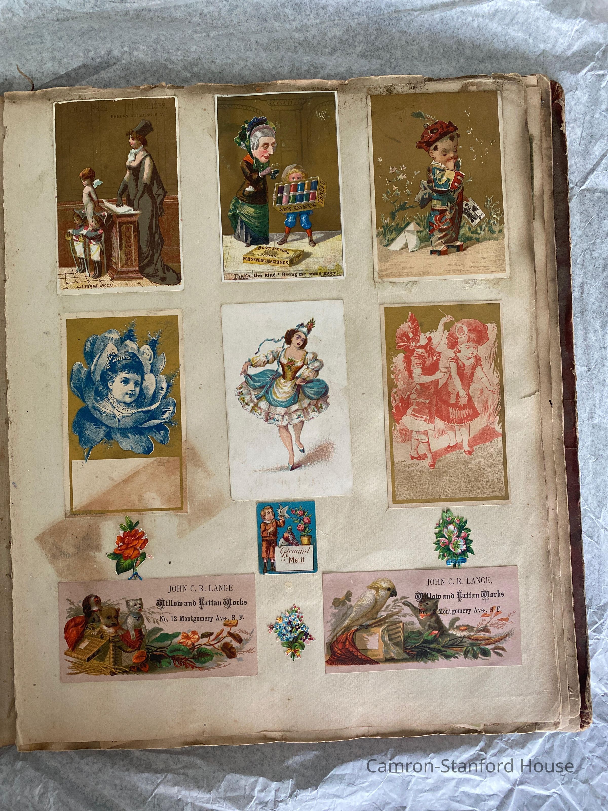 A scrapbook containing over five hundred 19th century trade cards, postcards, and other printed advertisements and ephemera. The majority of the pieces on the pages of this scrapbook are advertisements from San Francisco businesses.