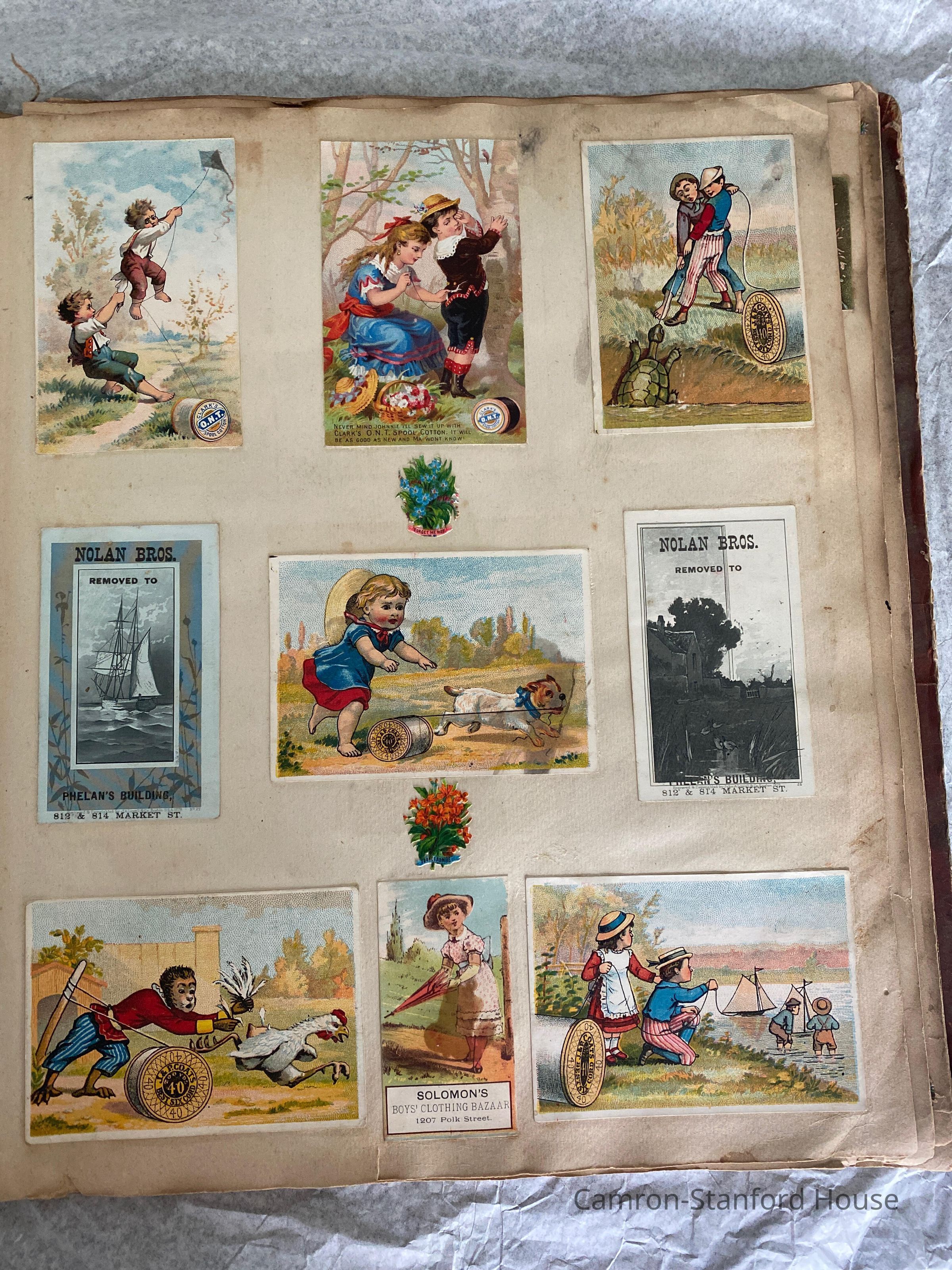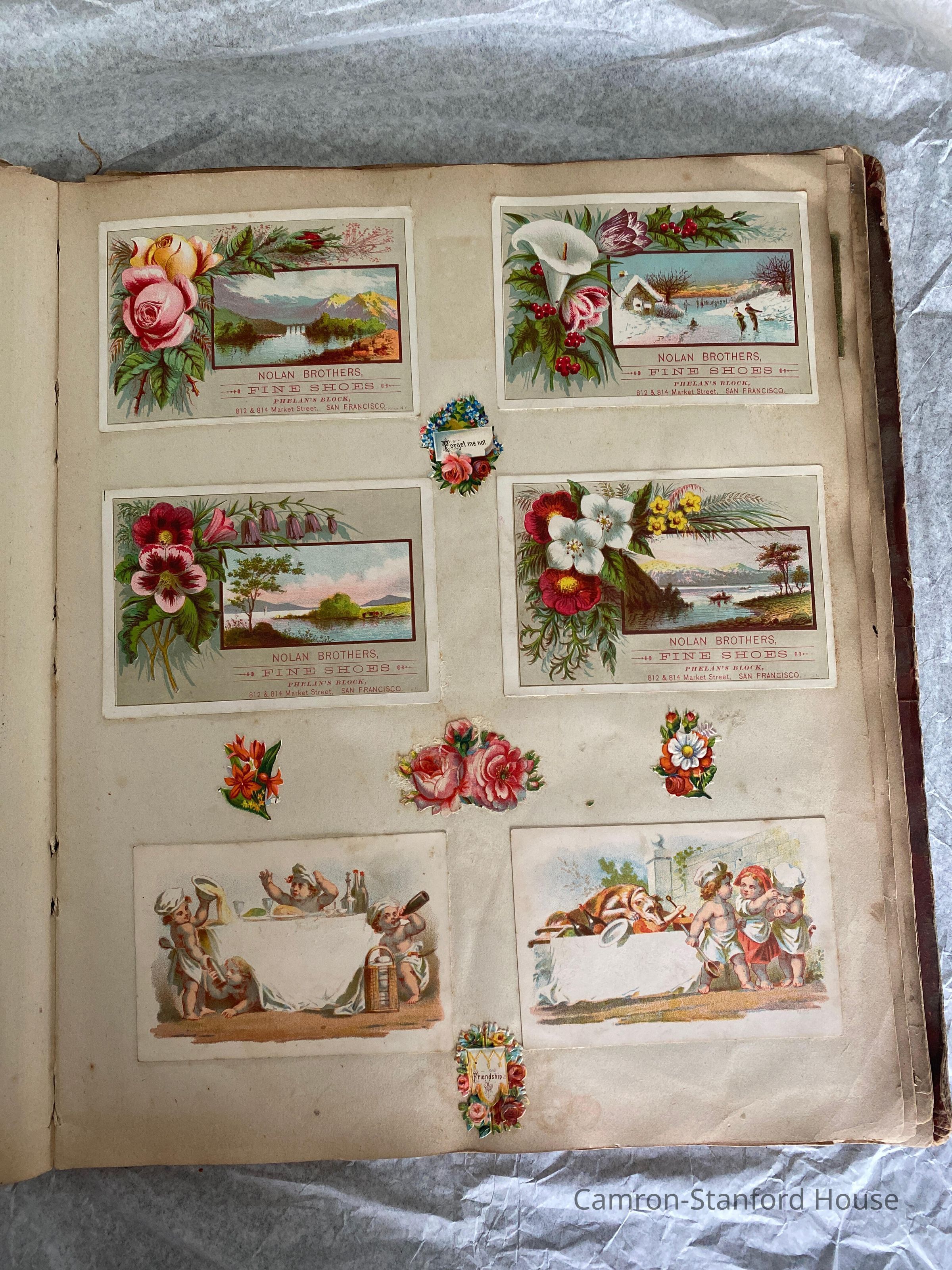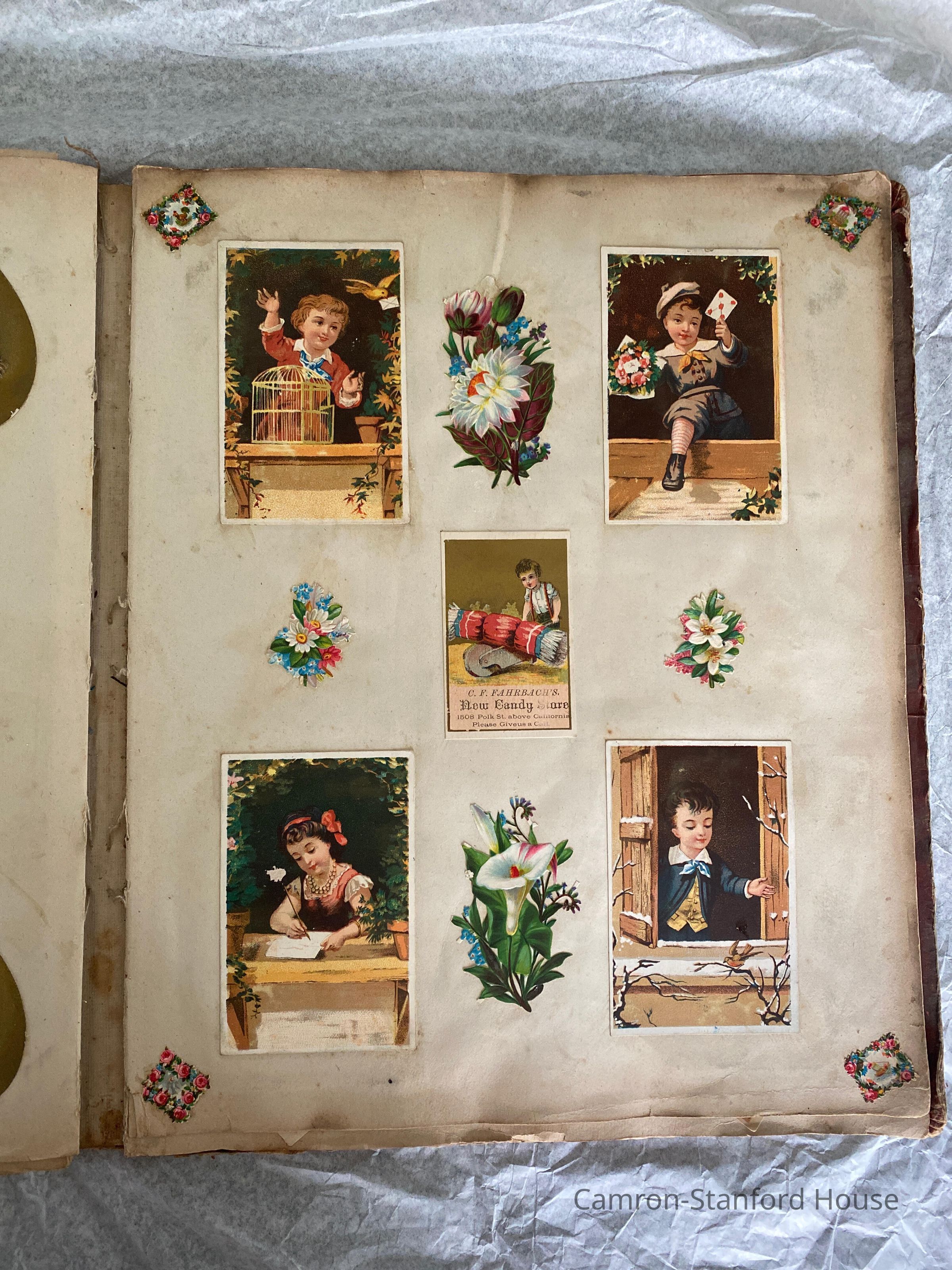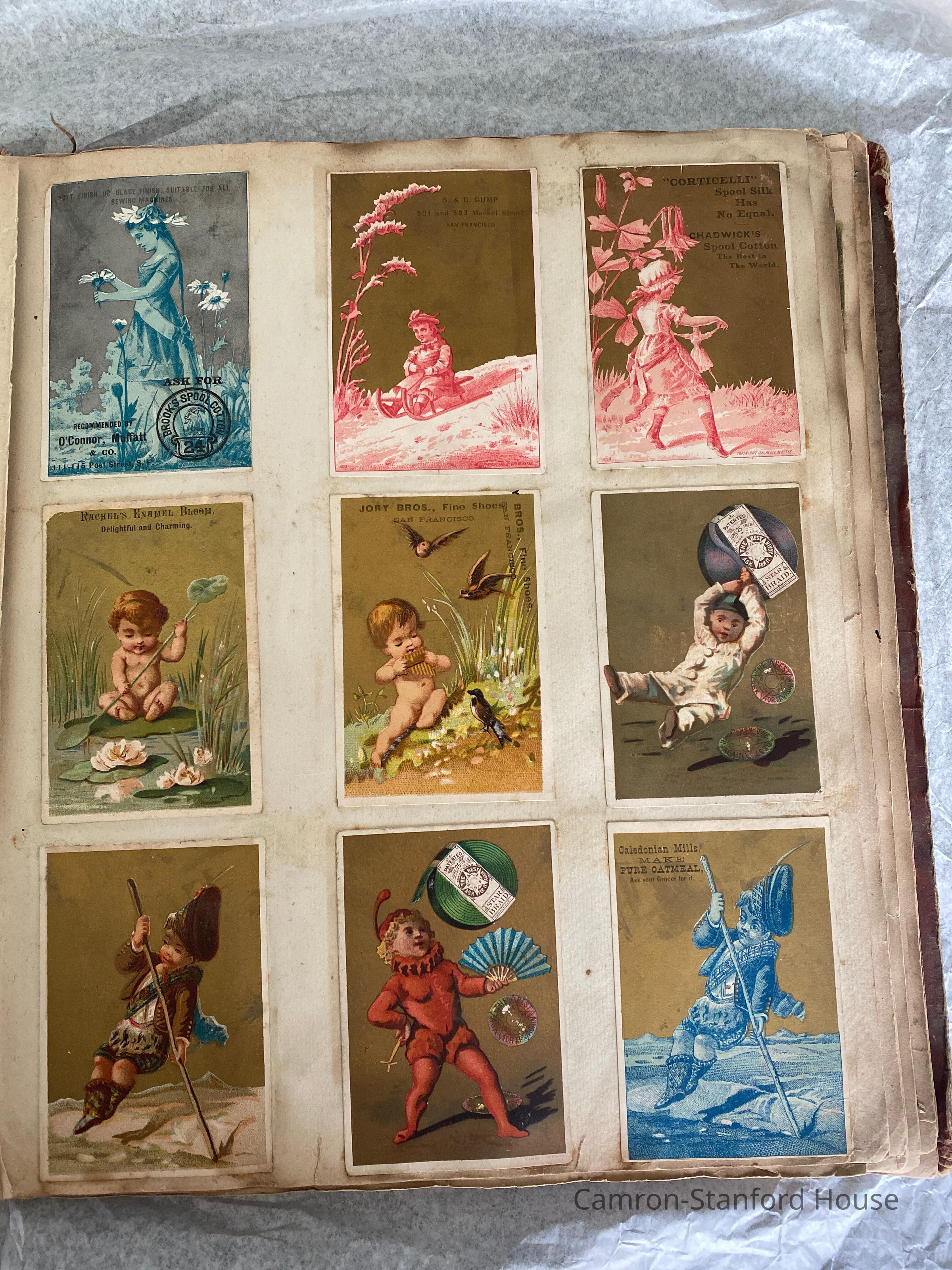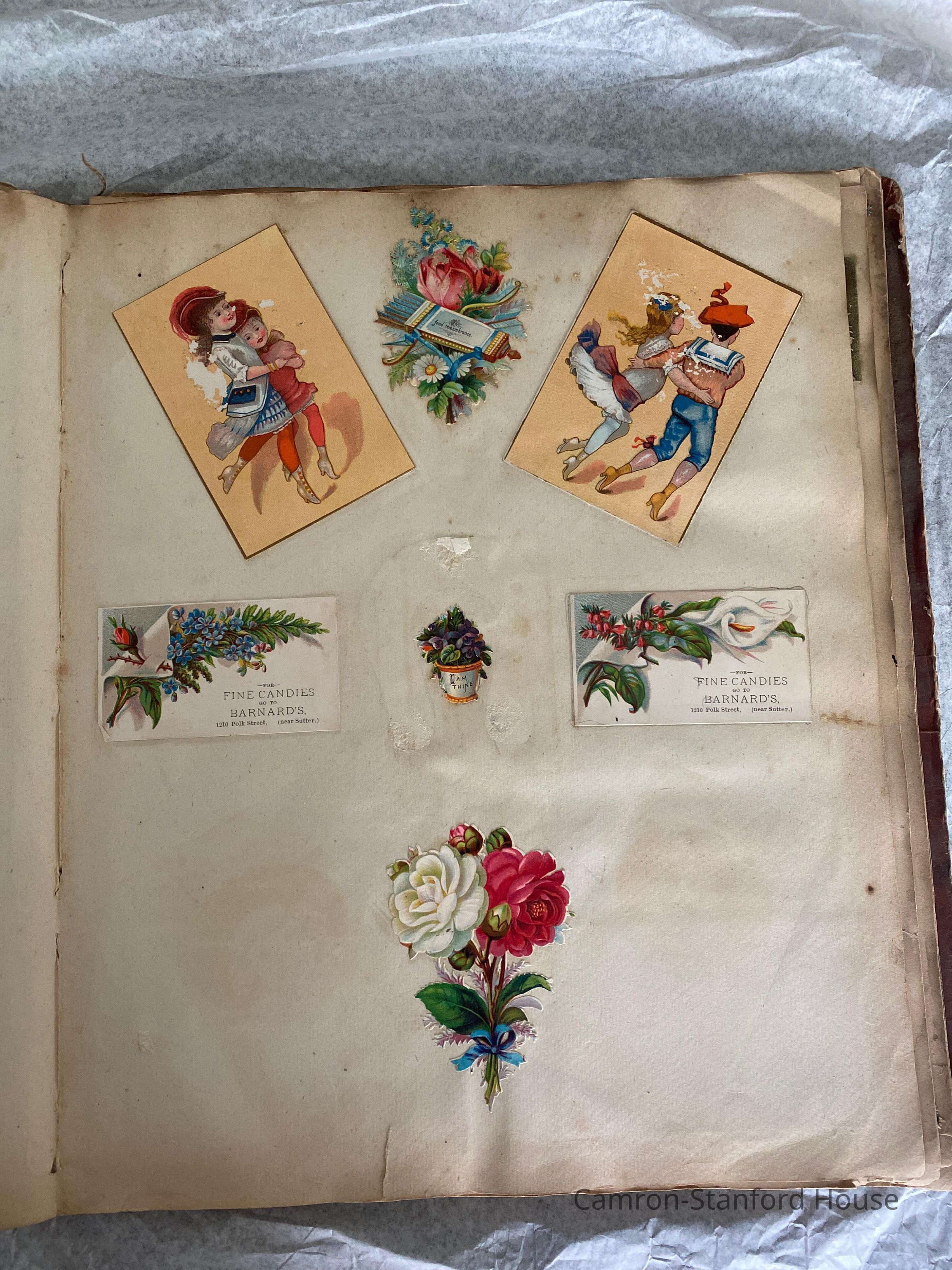 A scrapbook containing over five hundred 19th century trade cards, postcards, and other printed advertisements and ephemera. The majority of the pieces on the pages of this scrapbook are advertisements from San Francisco businesses.