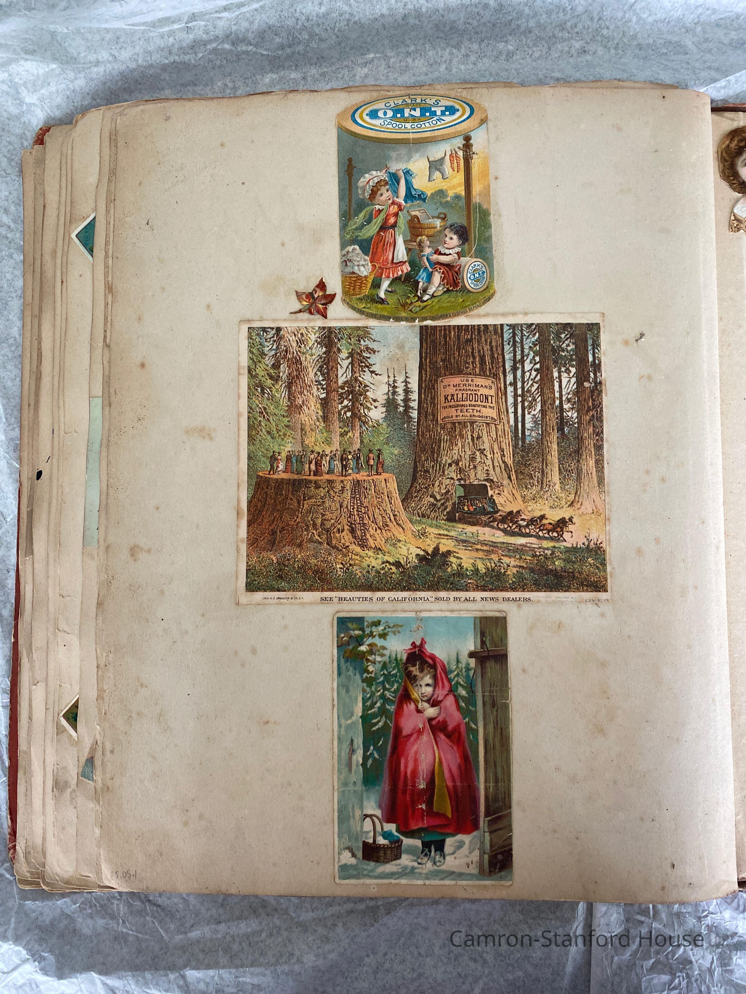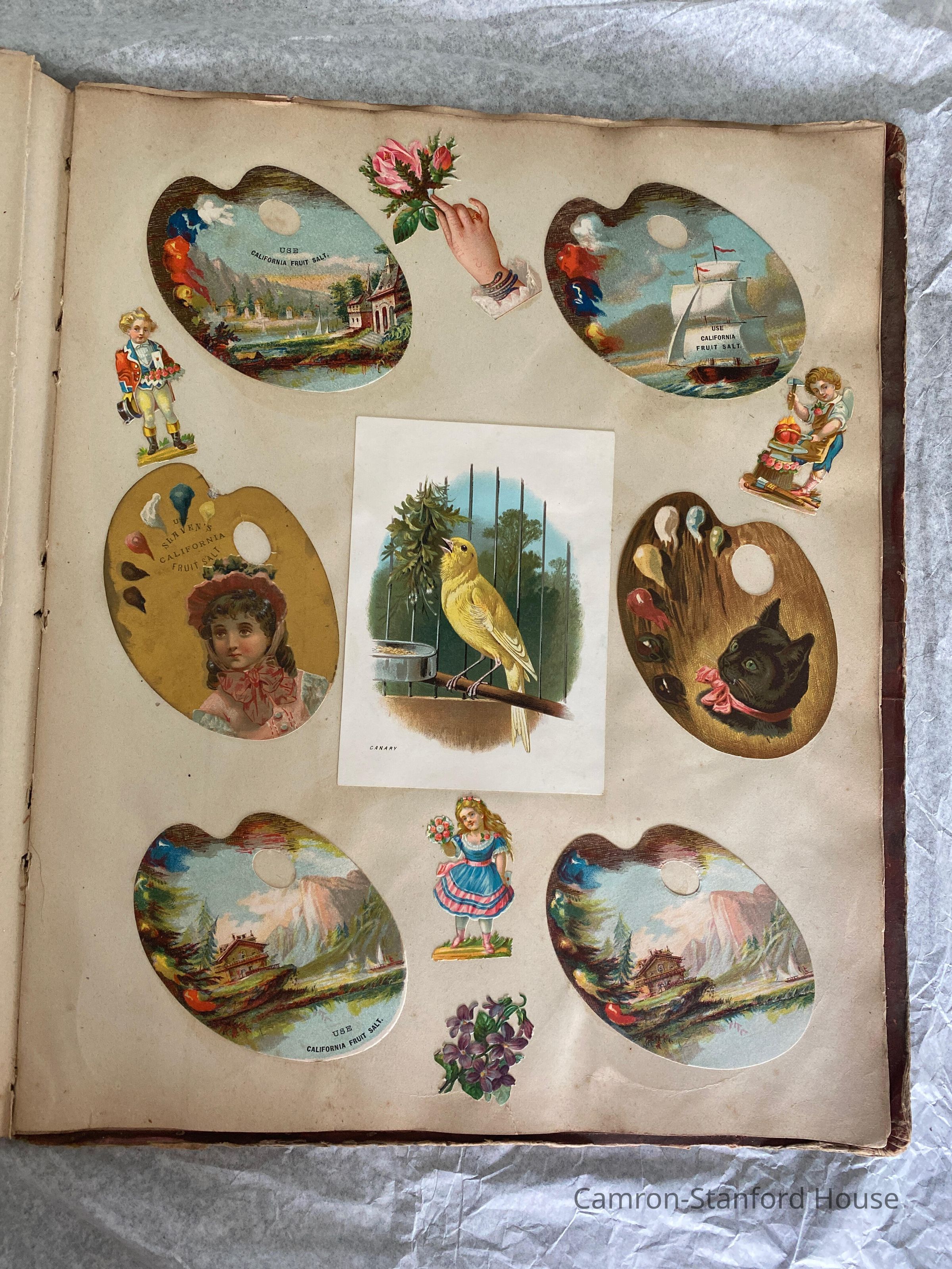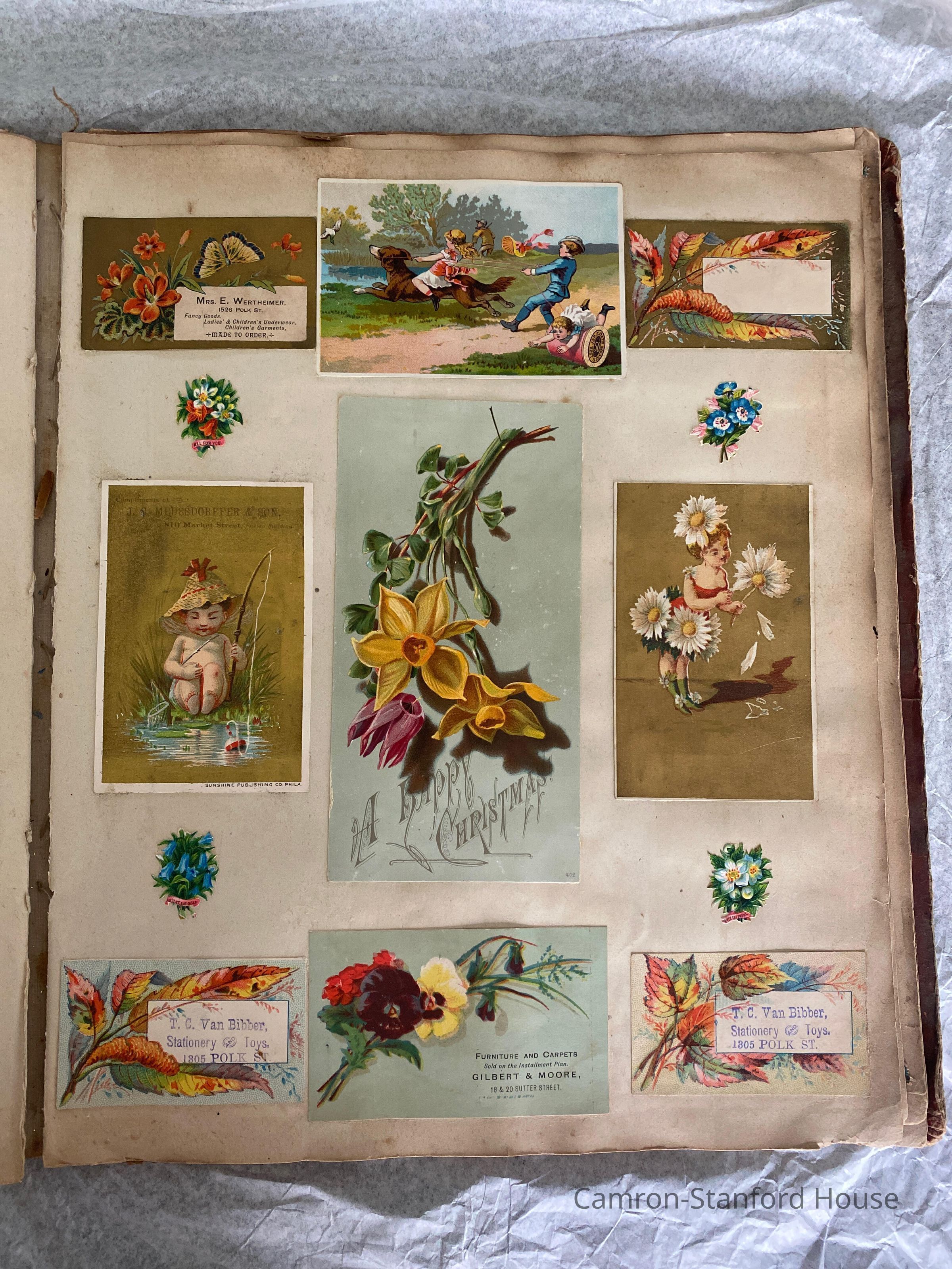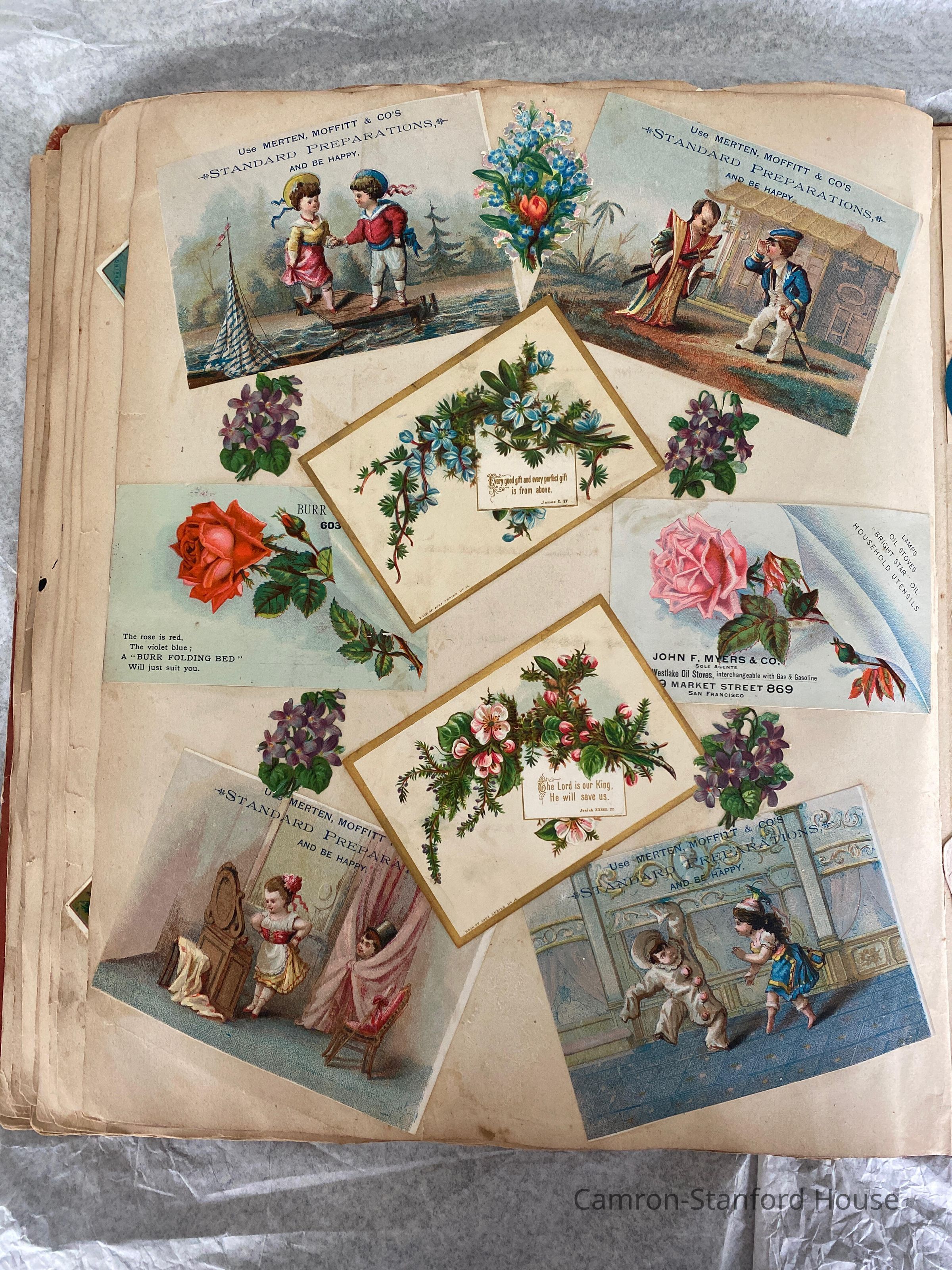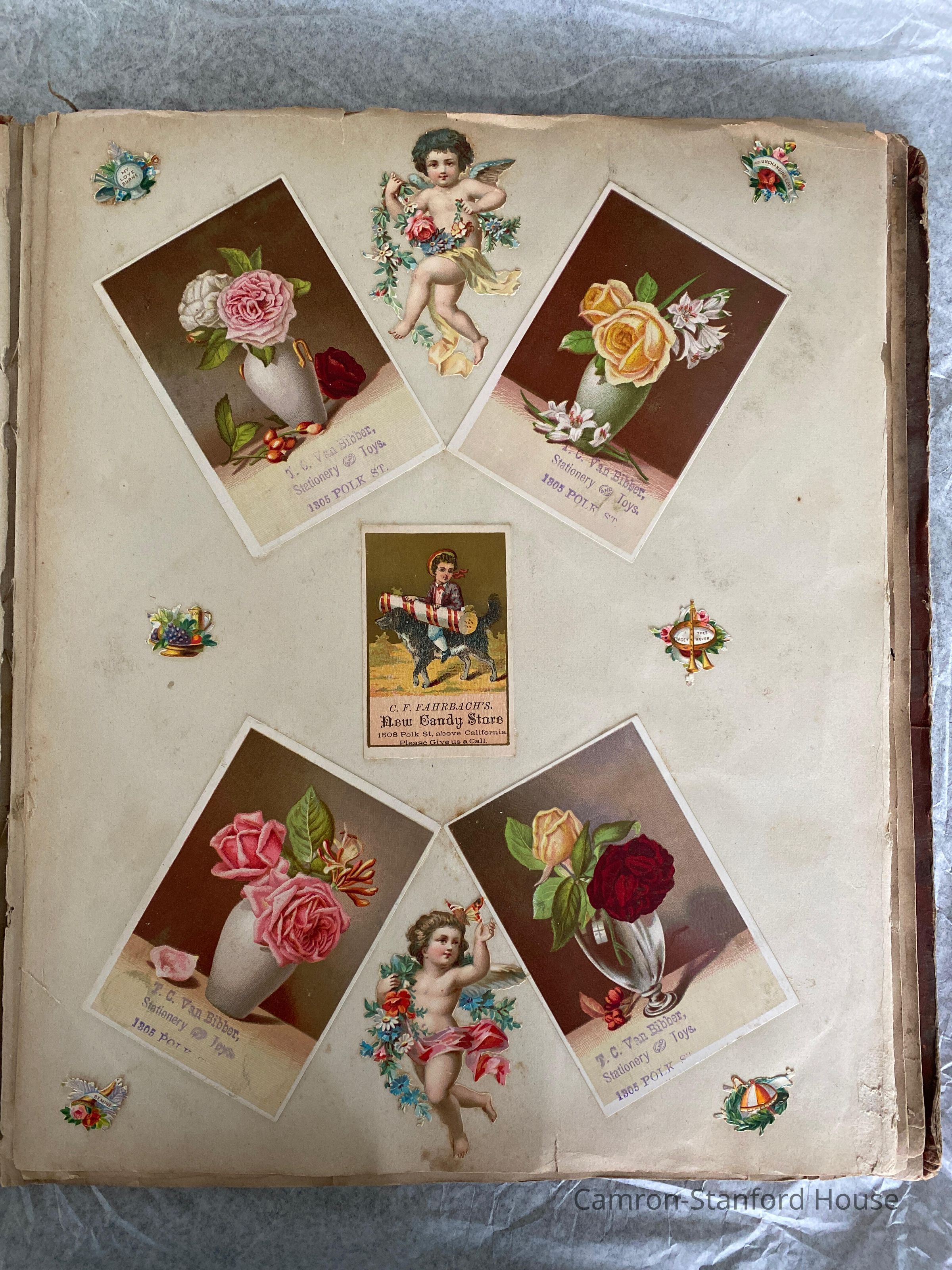 A scrapbook containing over five hundred 19th century trade cards, postcards, and other printed advertisements and ephemera. The majority of the pieces on the pages of this scrapbook are advertisements from San Francisco businesses.