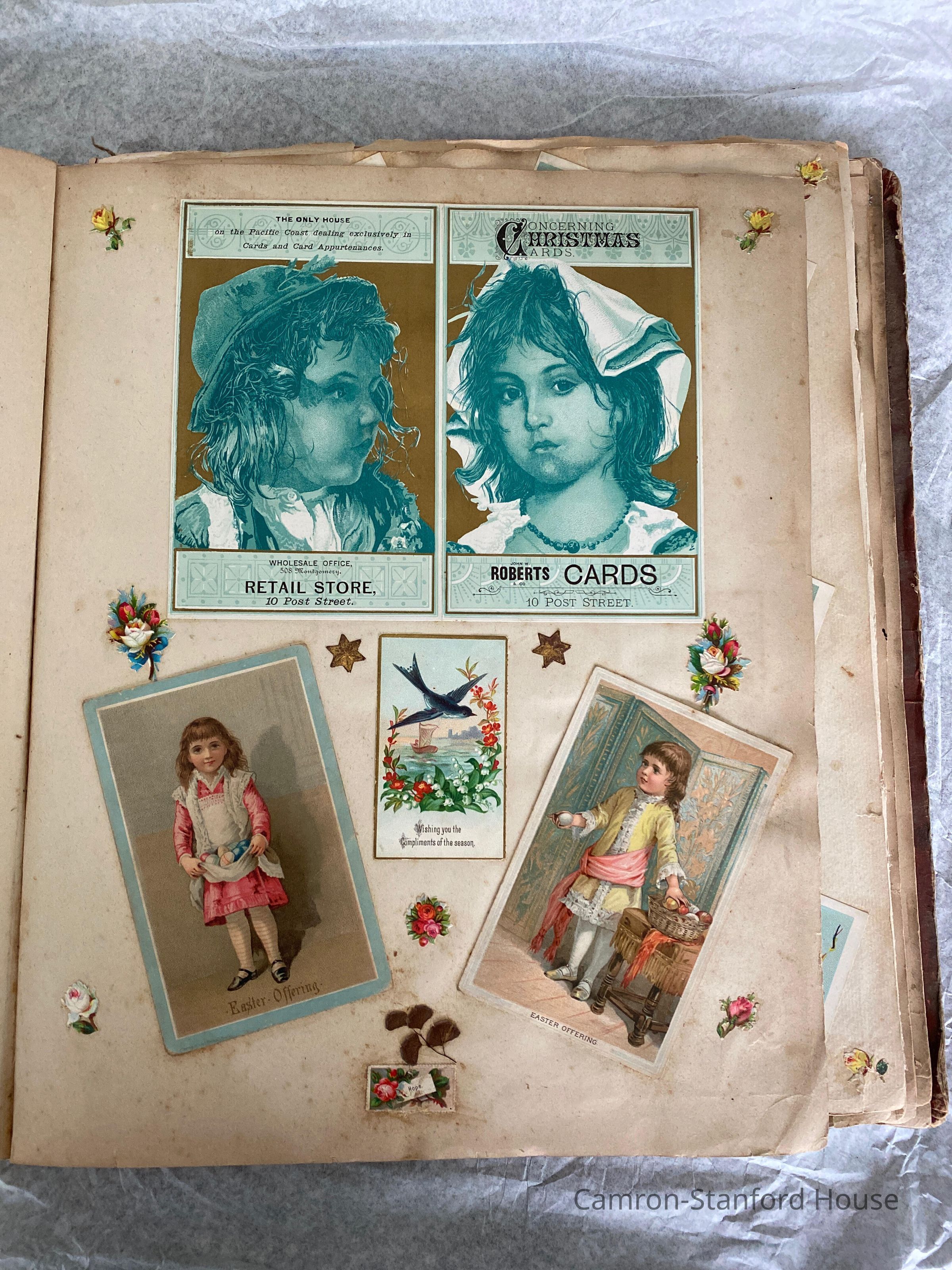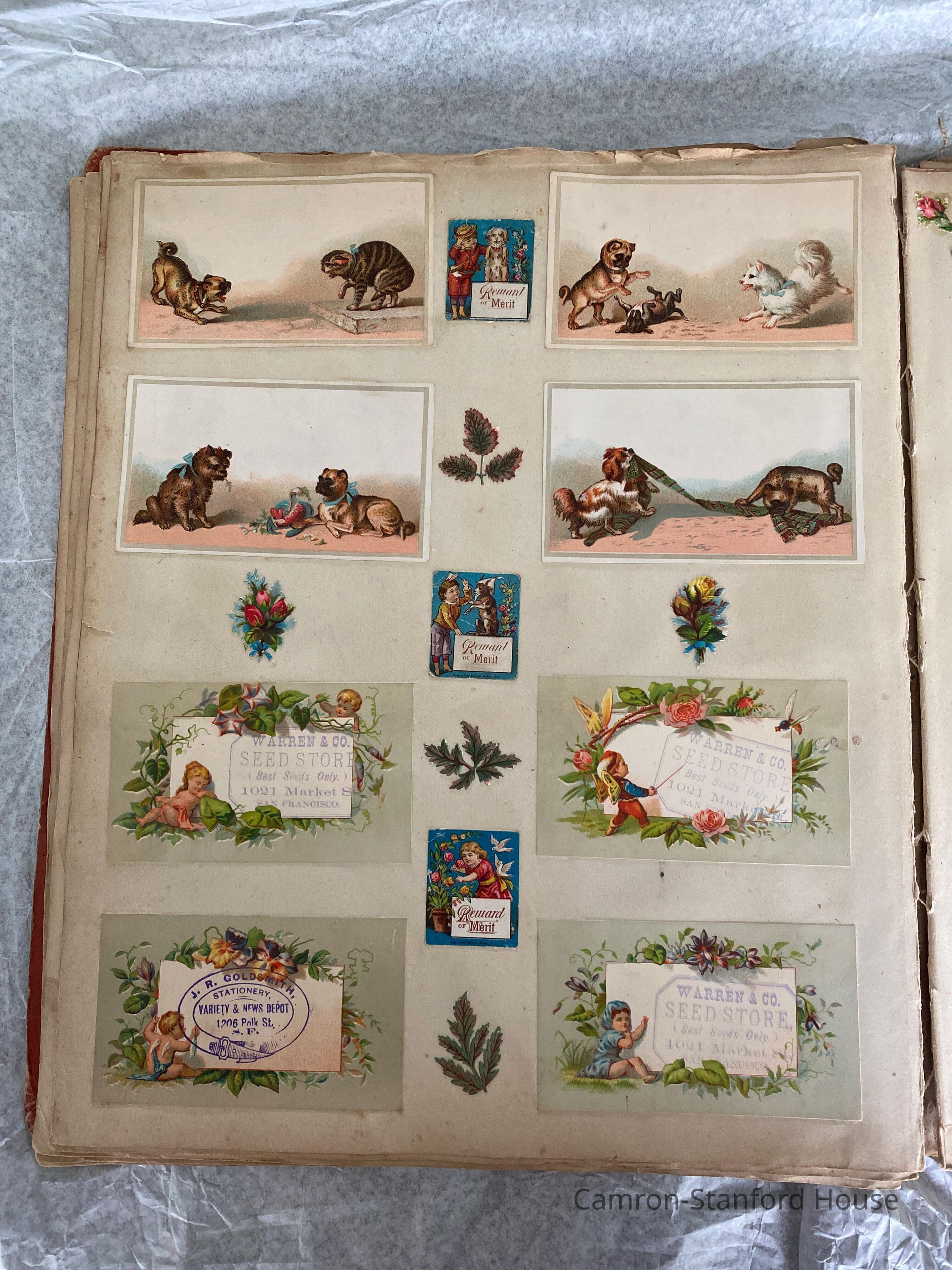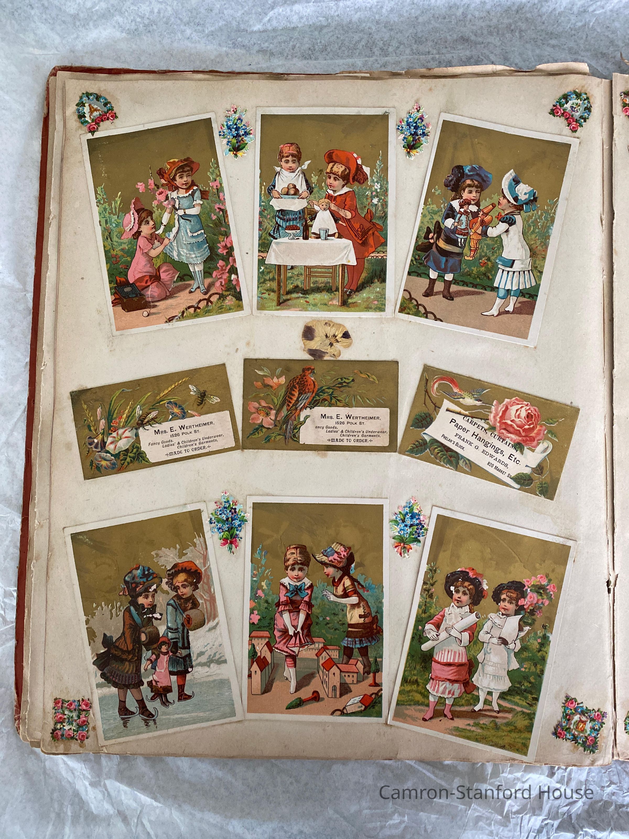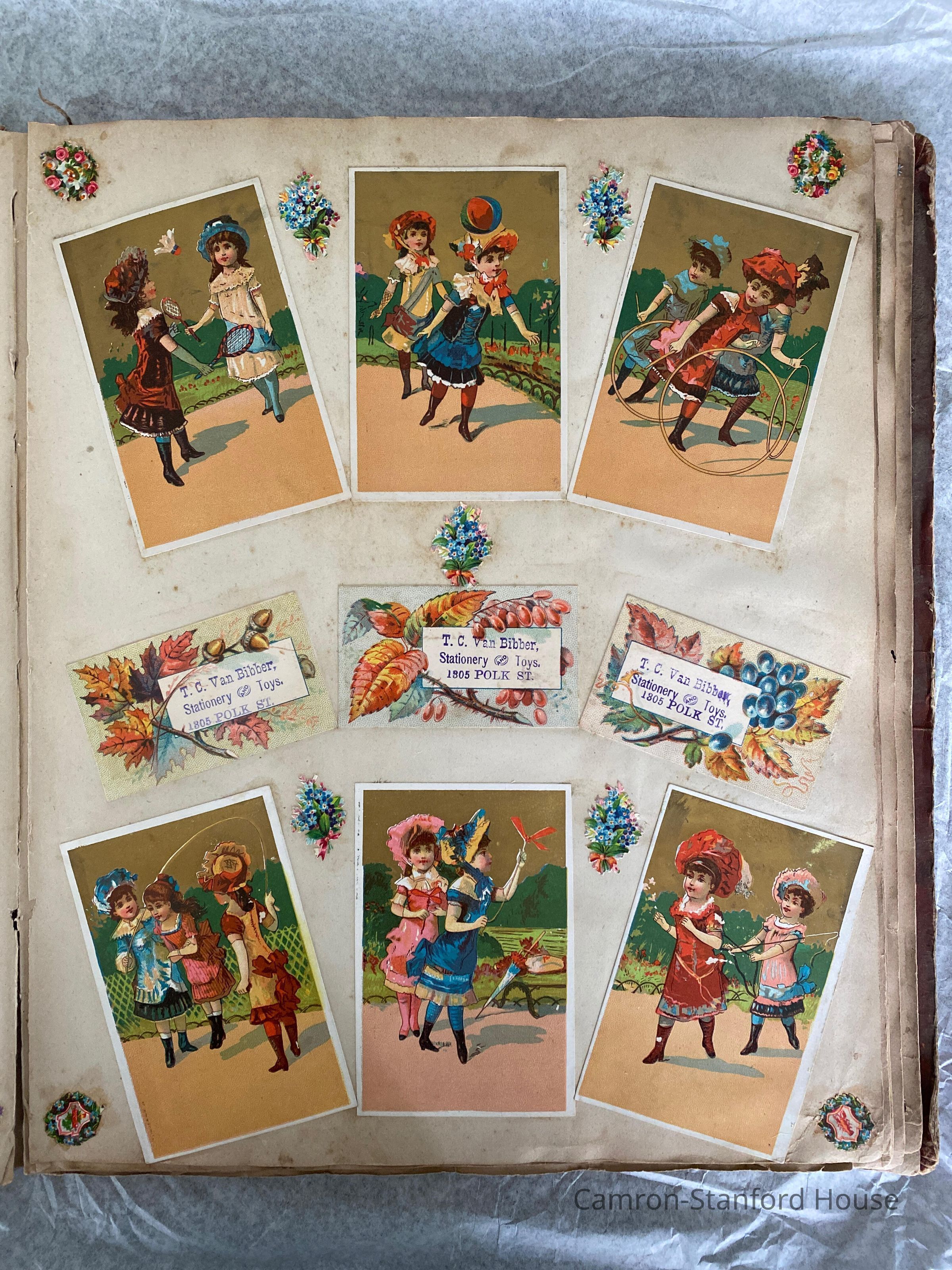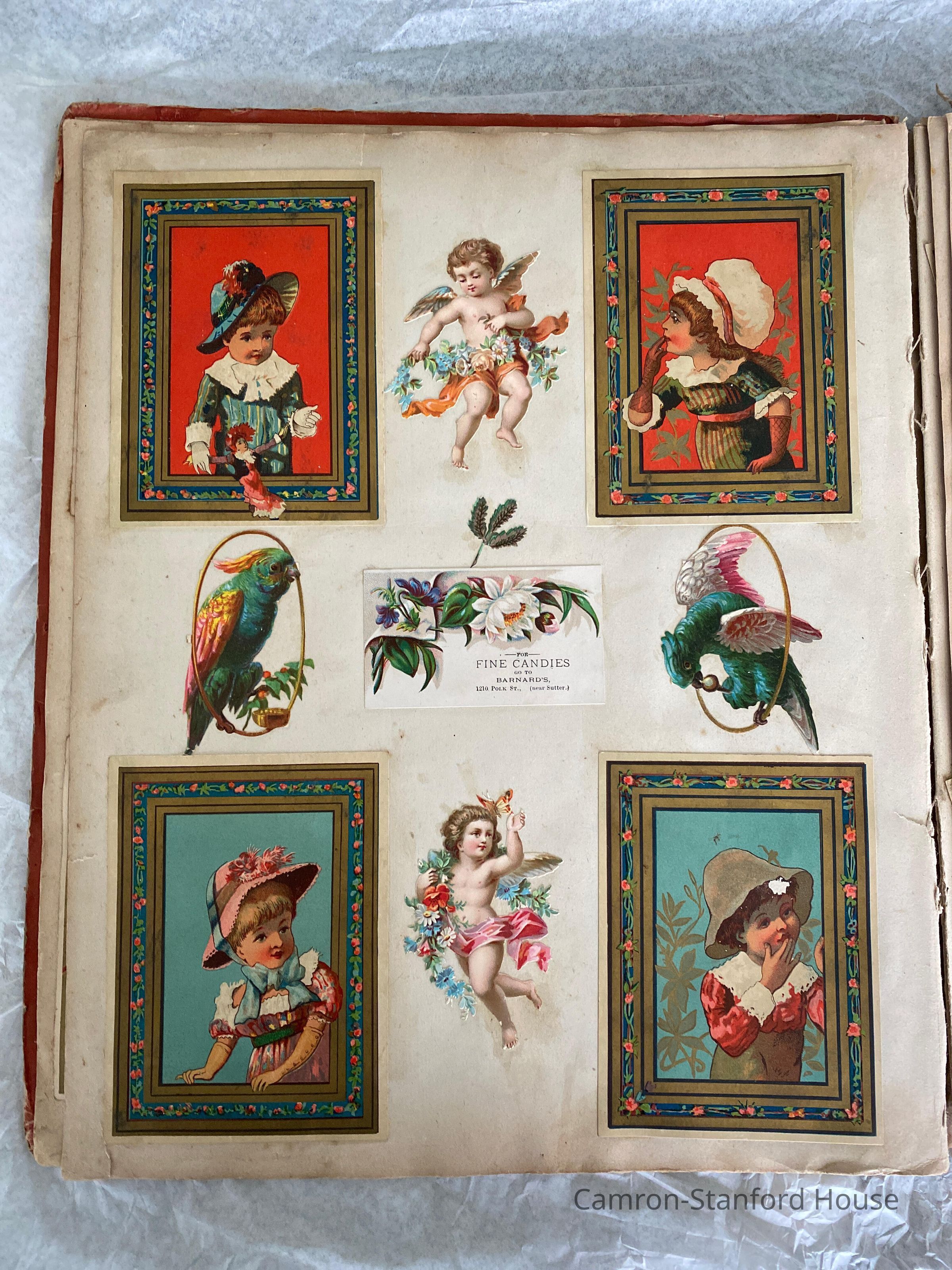 A scrapbook containing over five hundred 19th century trade cards, postcards, and other printed advertisements and ephemera. The majority of the pieces on the pages of this scrapbook are advertisements from San Francisco businesses.