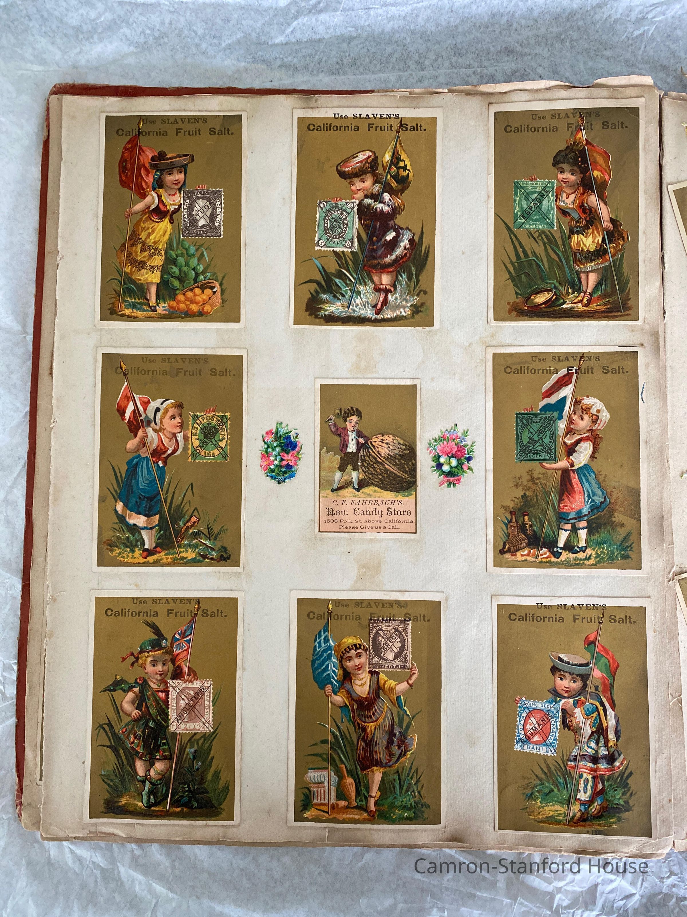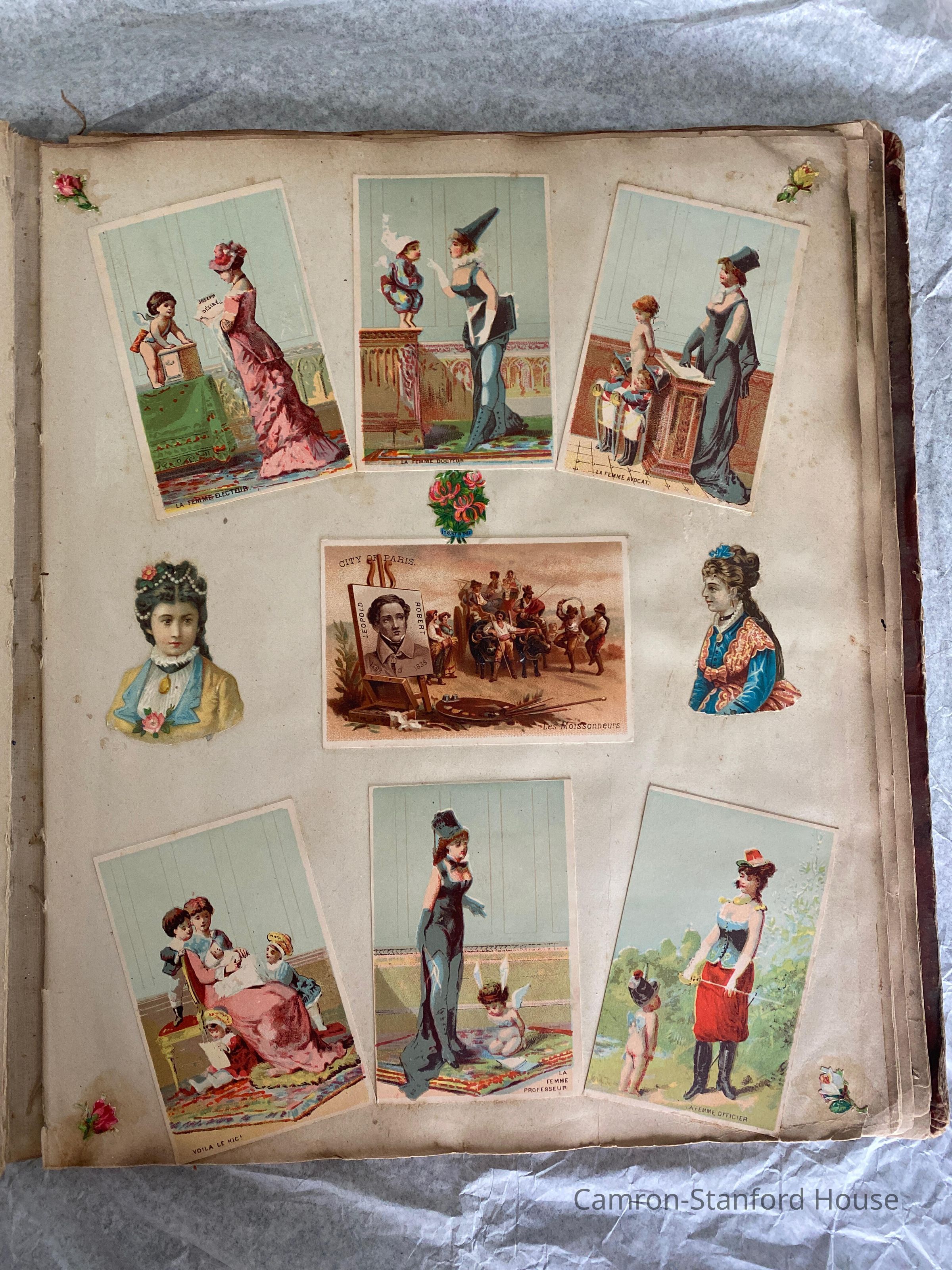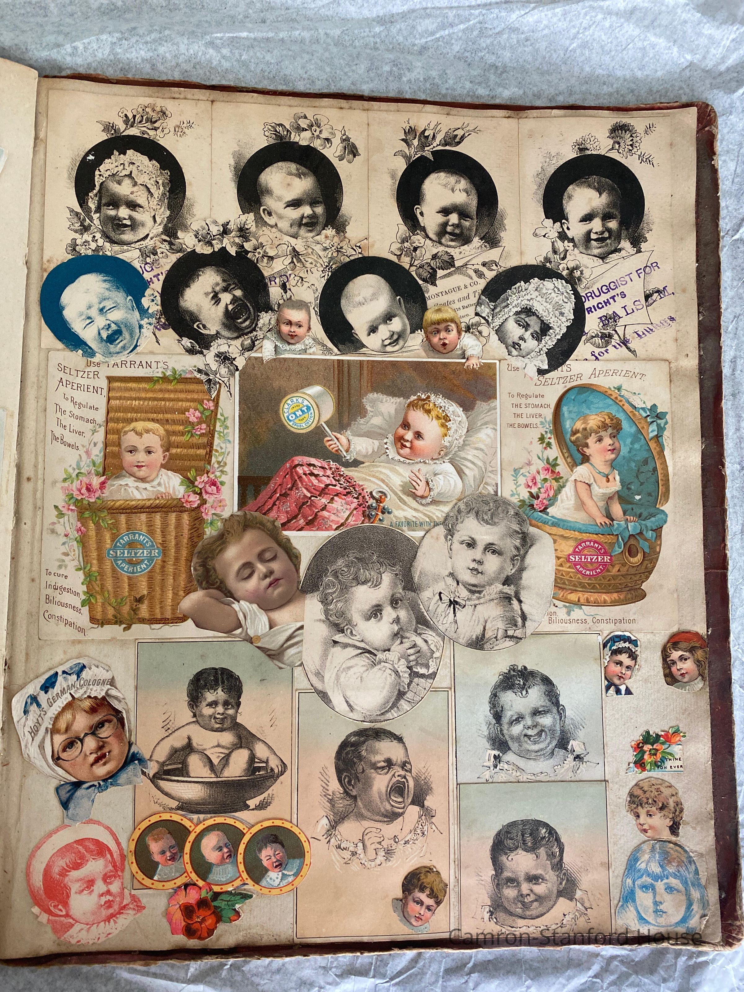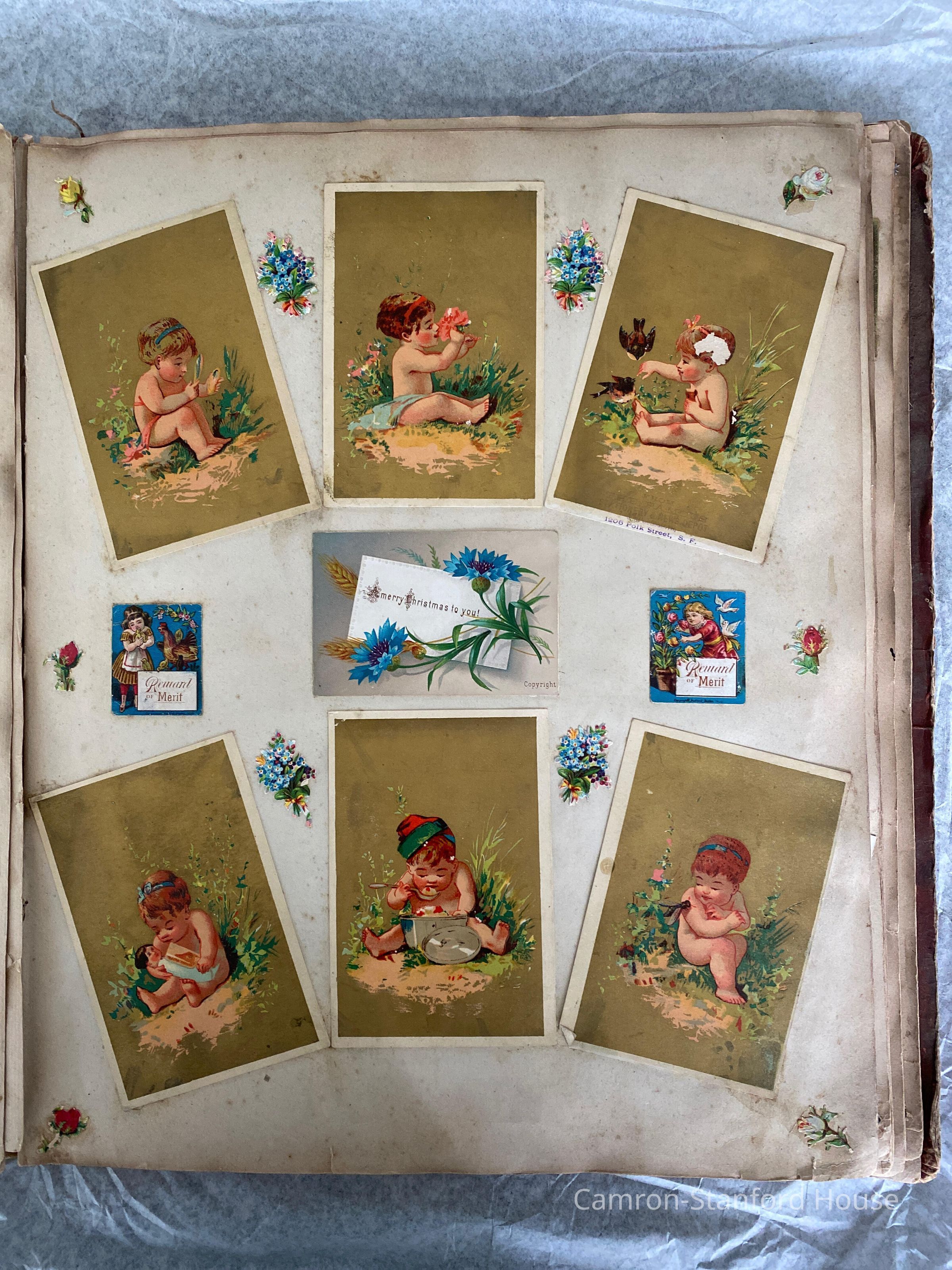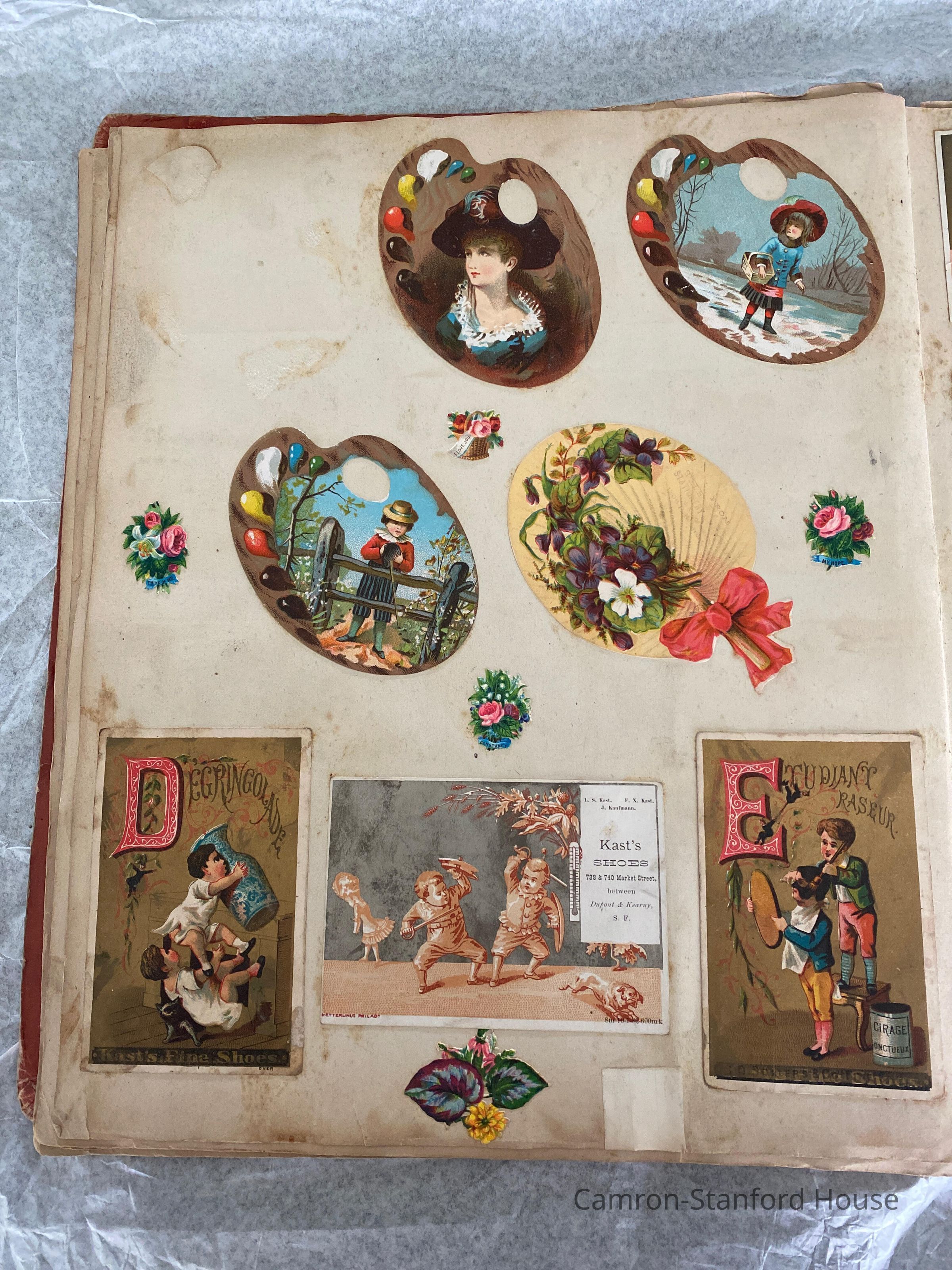 A scrapbook containing over five hundred 19th century trade cards, postcards, and other printed advertisements and ephemera. The majority of the pieces on the pages of this scrapbook are advertisements from San Francisco businesses.