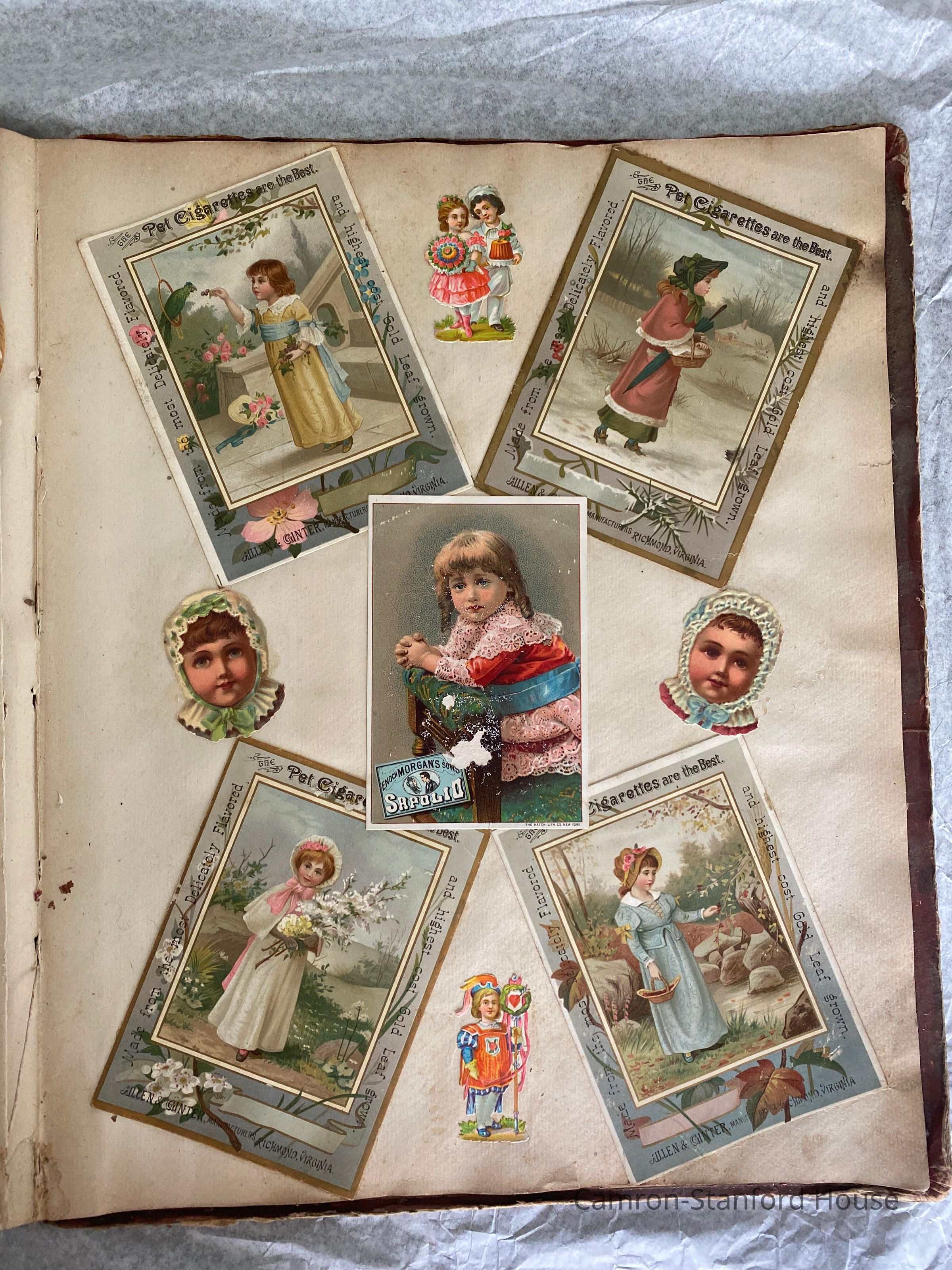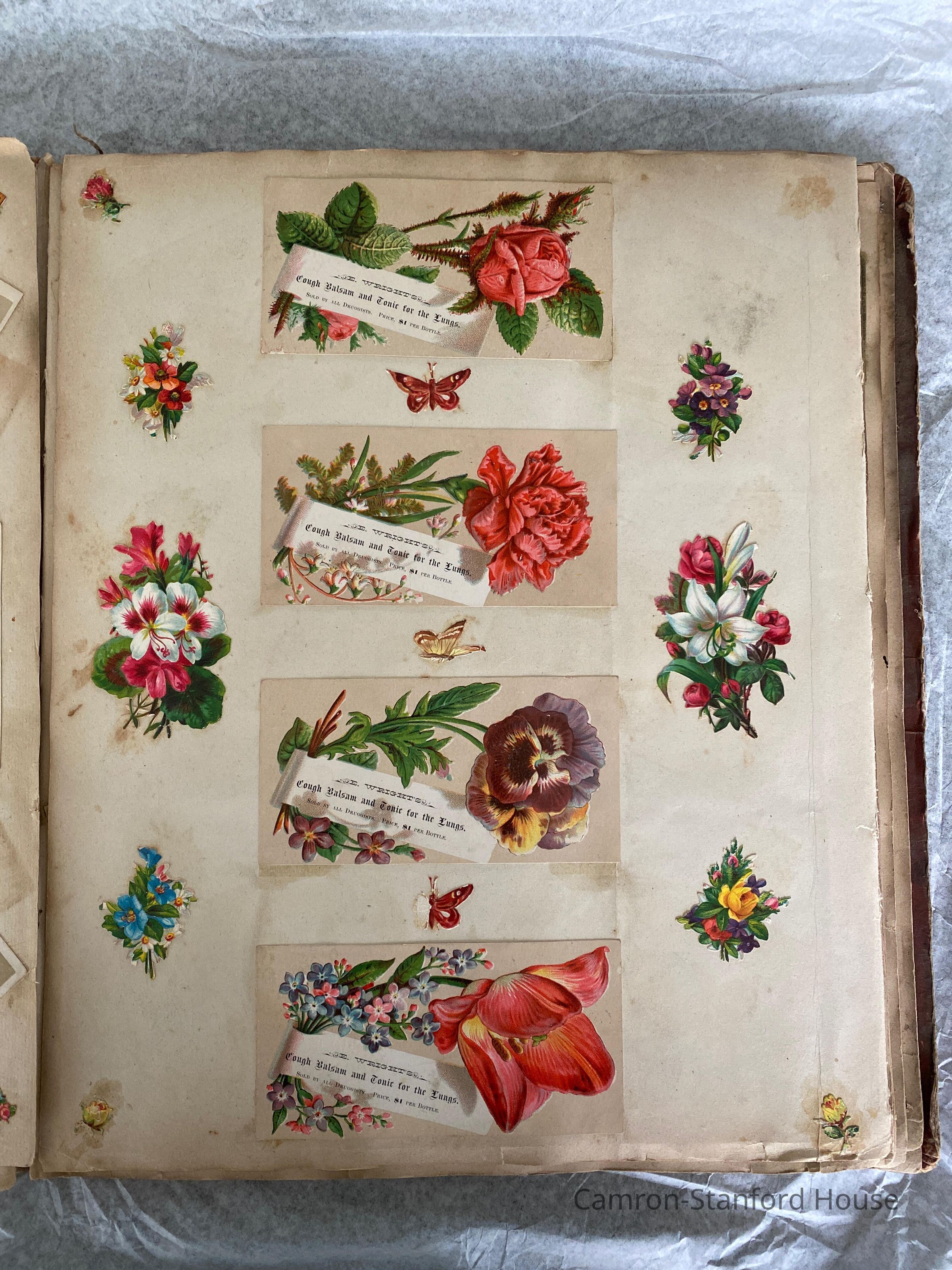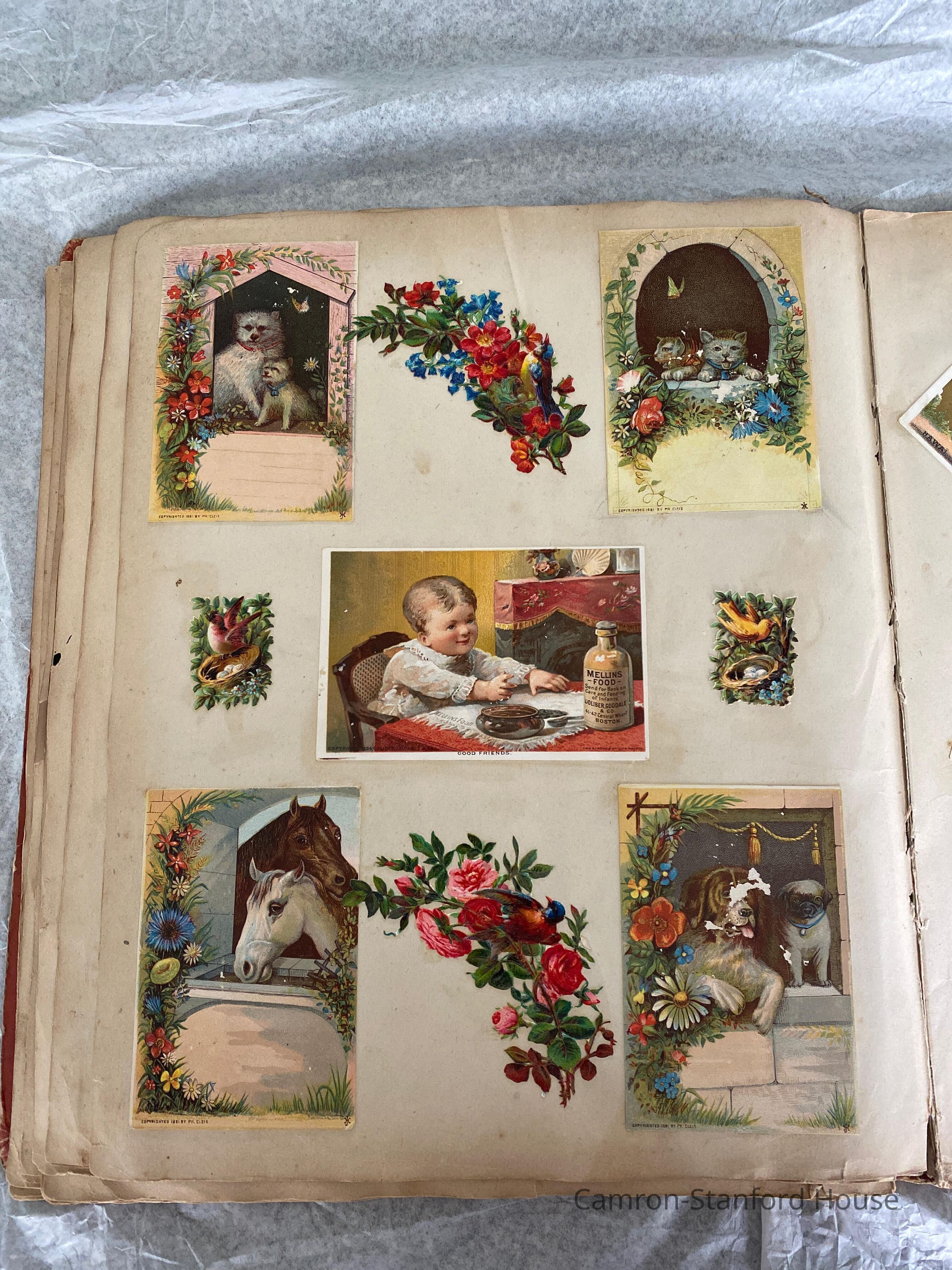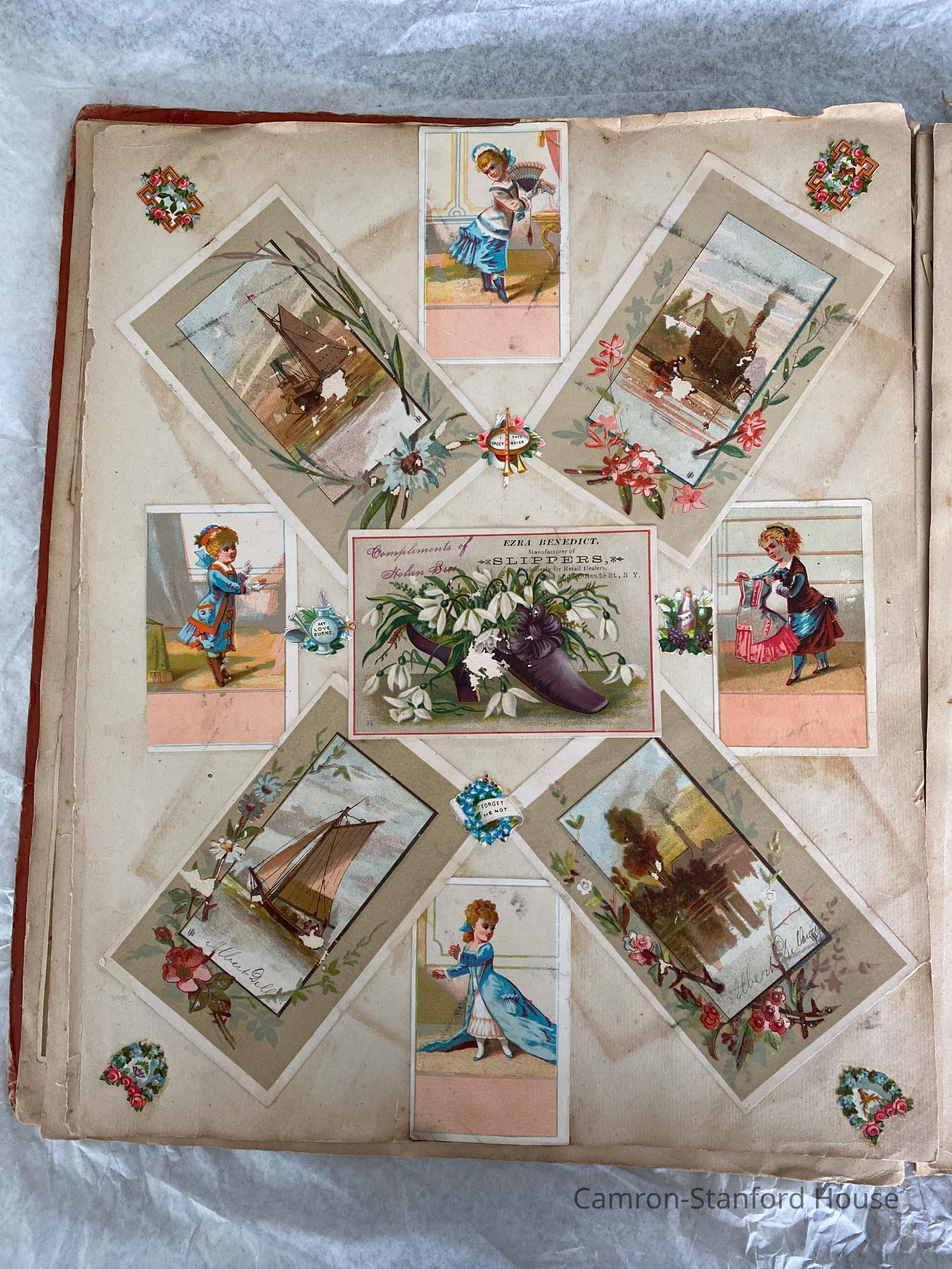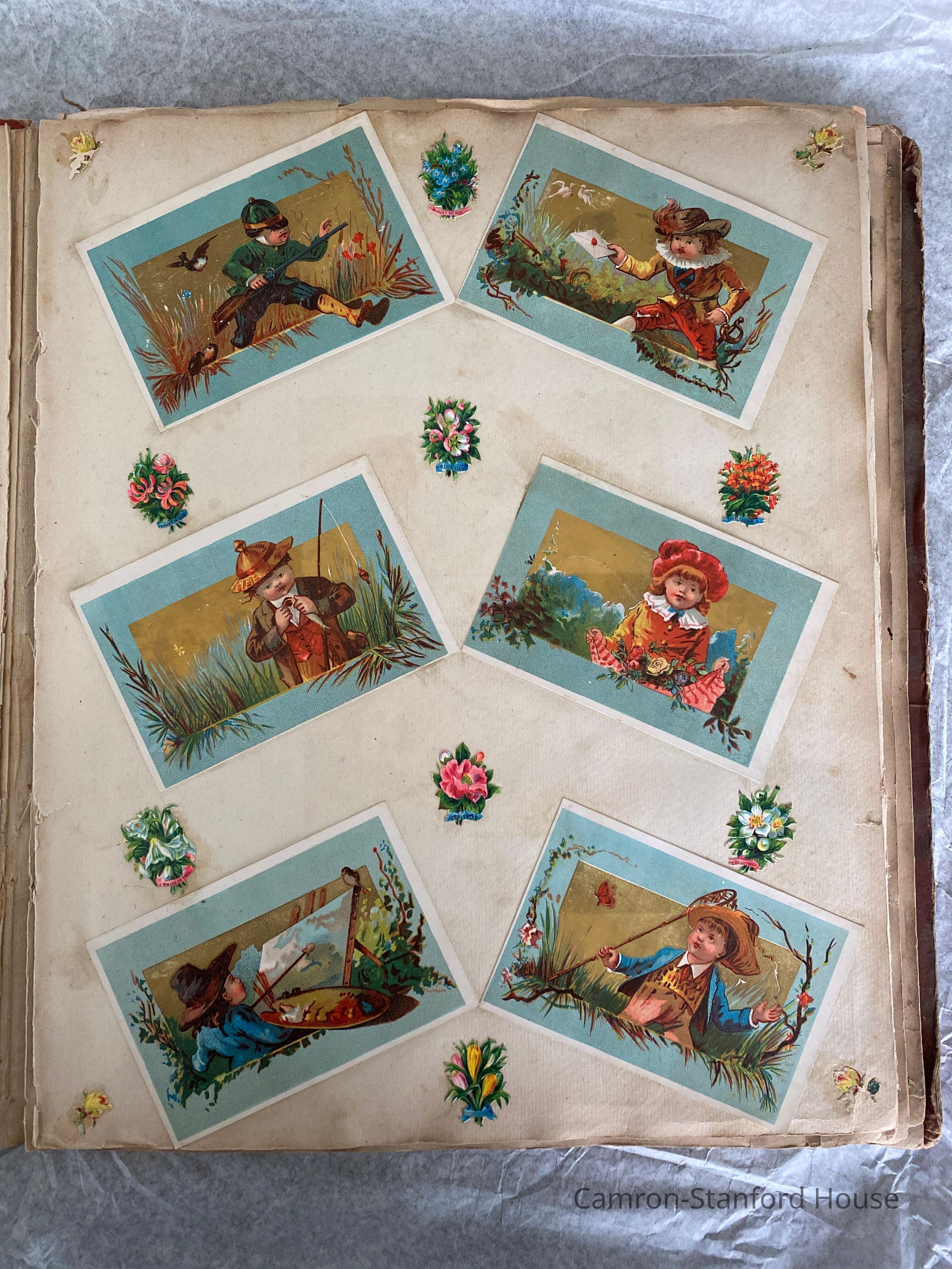 A scrapbook containing over five hundred 19th century trade cards, postcards, and other printed advertisements and ephemera. The majority of the pieces on the pages of this scrapbook are advertisements from San Francisco businesses.