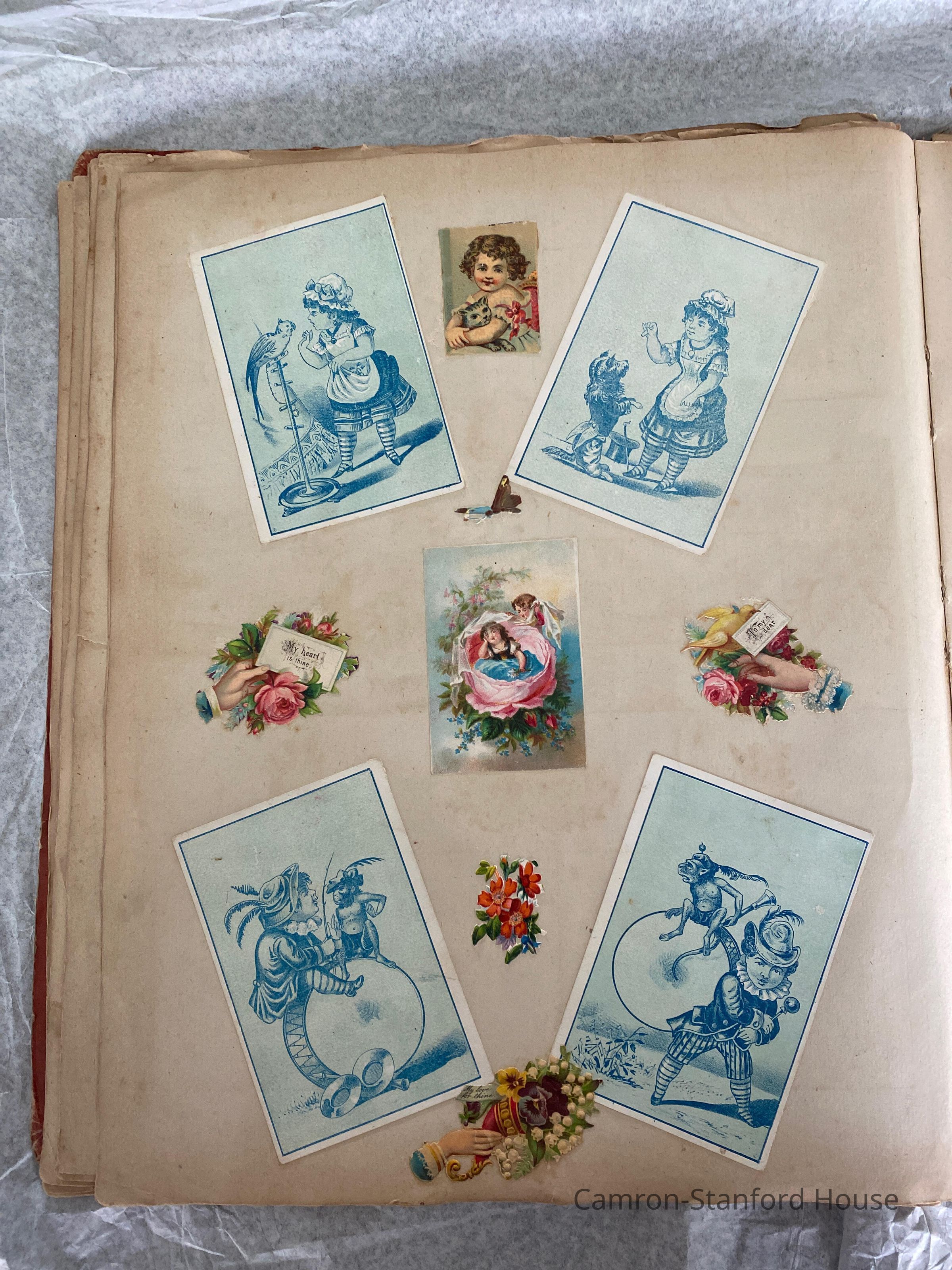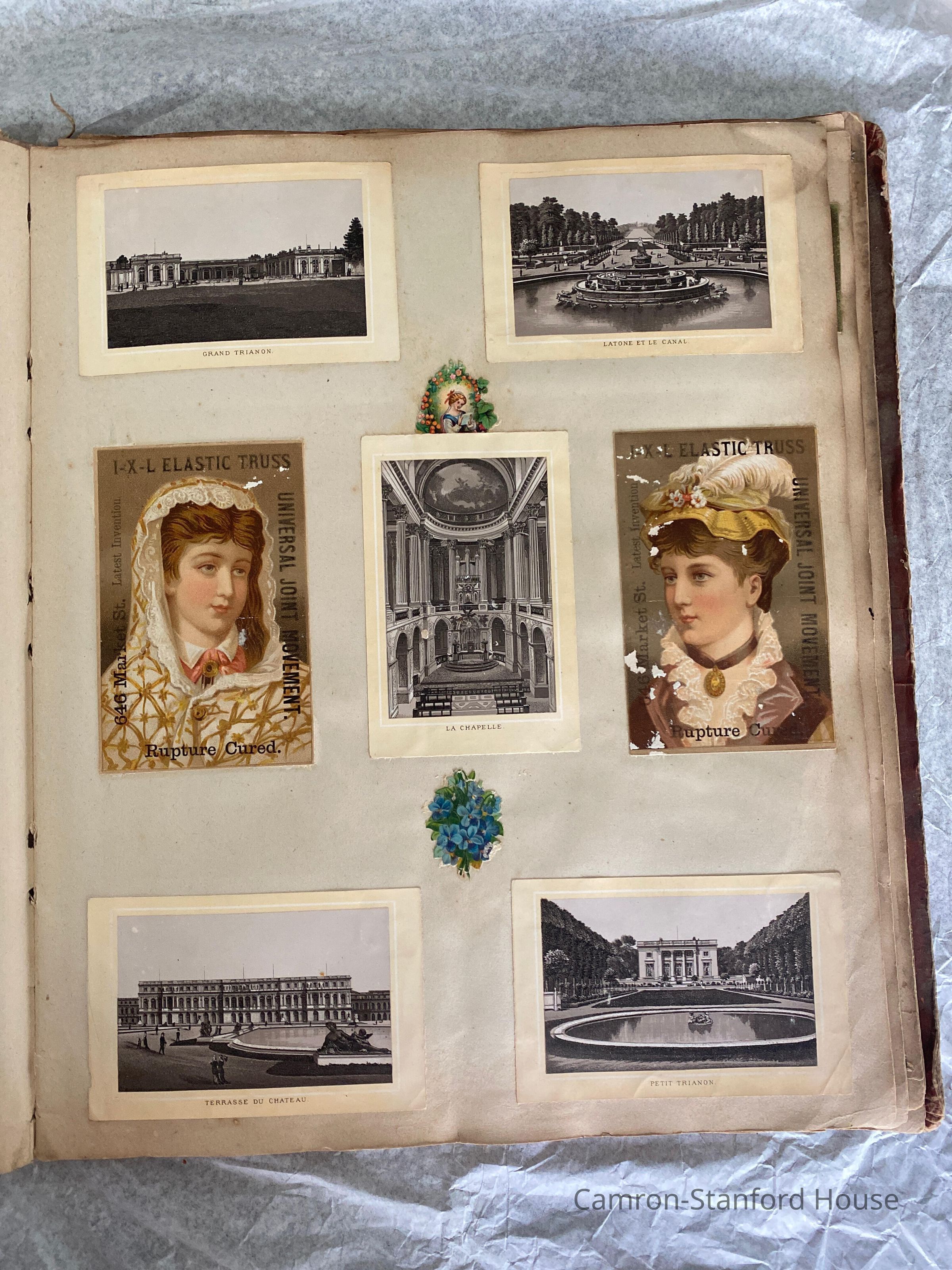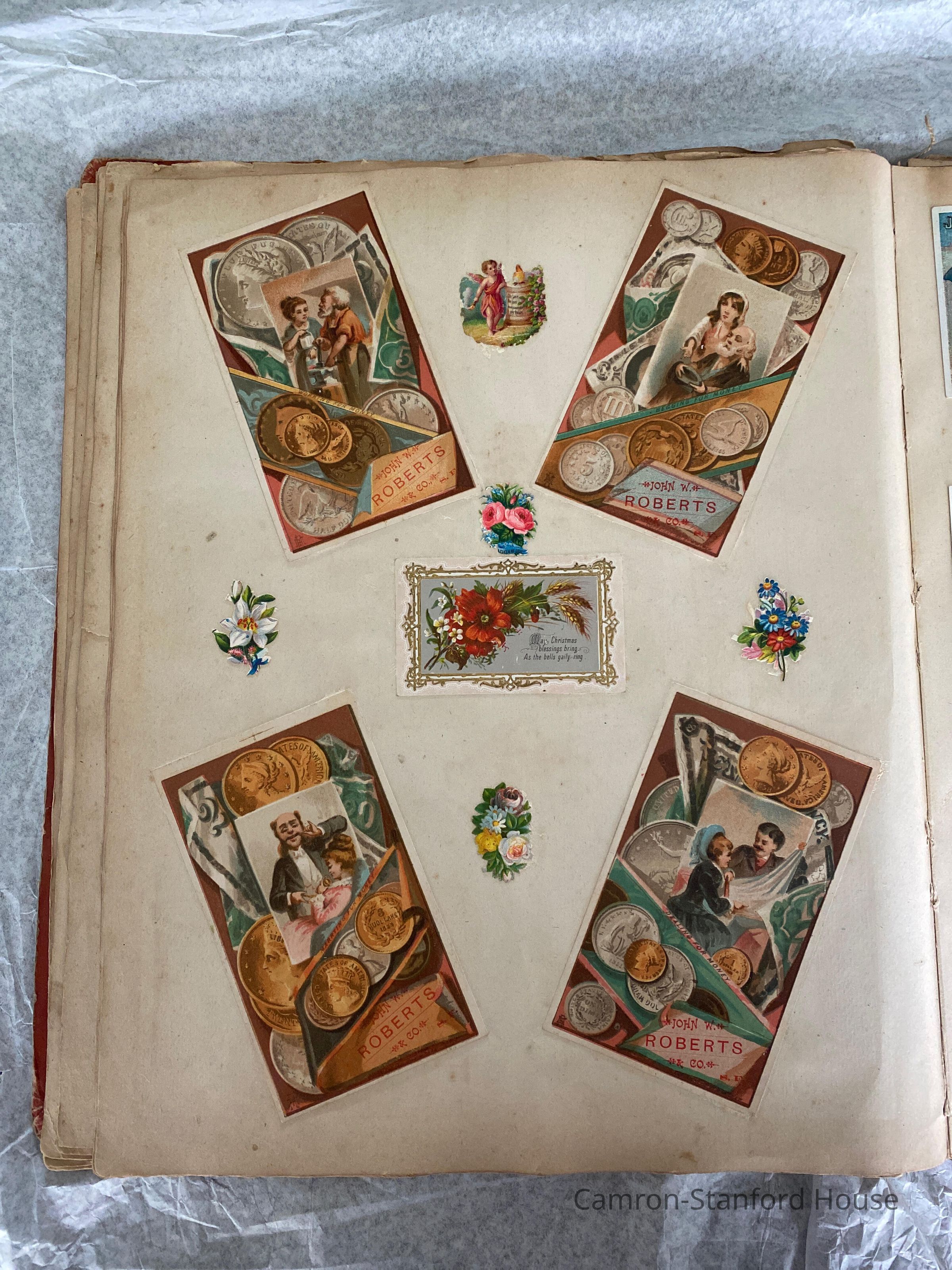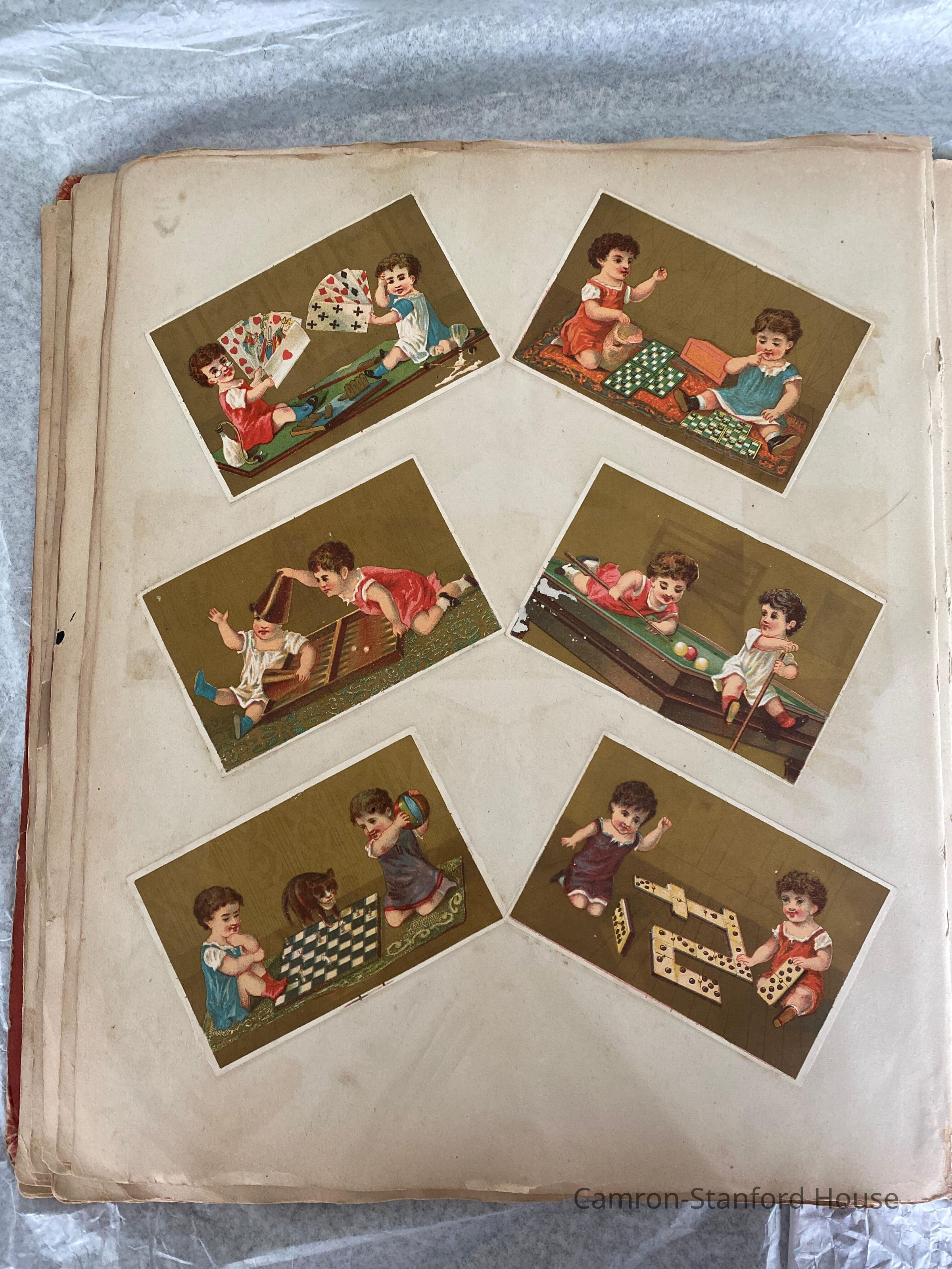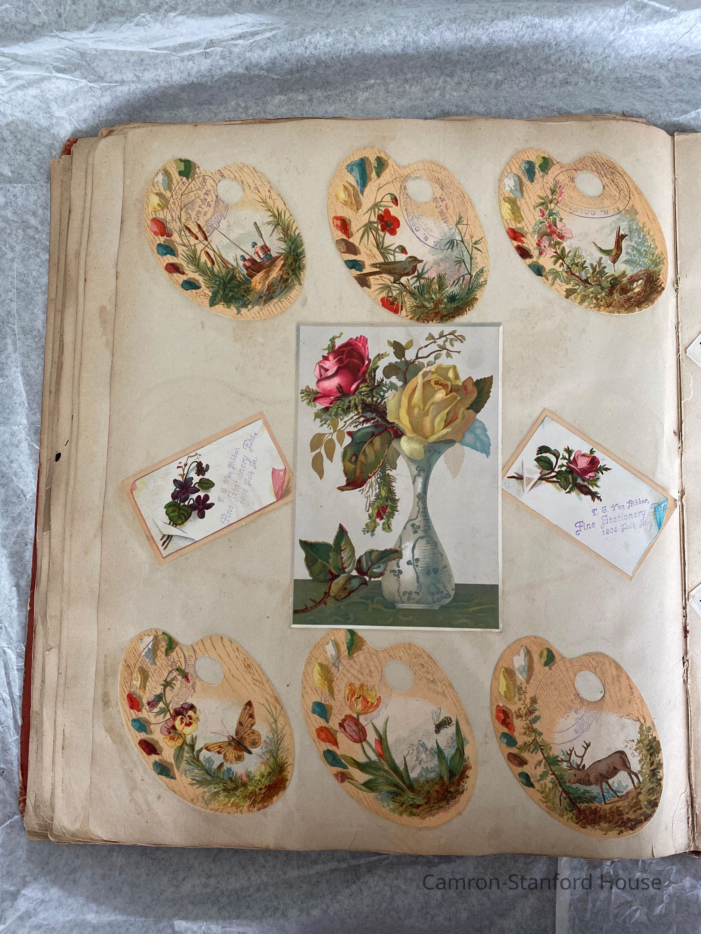 A scrapbook containing over five hundred 19th century trade cards, postcards, and other printed advertisements and ephemera. The majority of the pieces on the pages of this scrapbook are advertisements from San Francisco businesses.