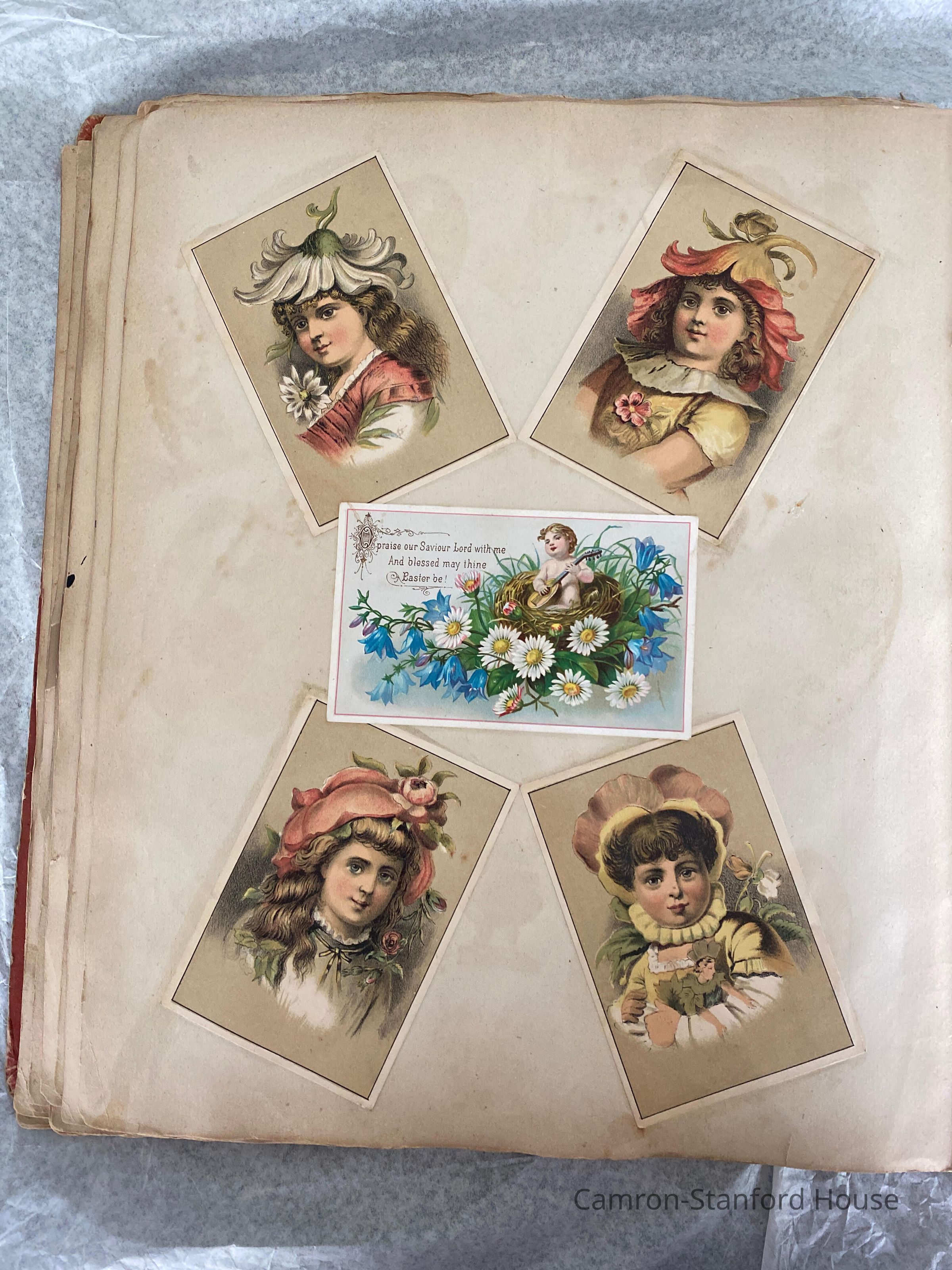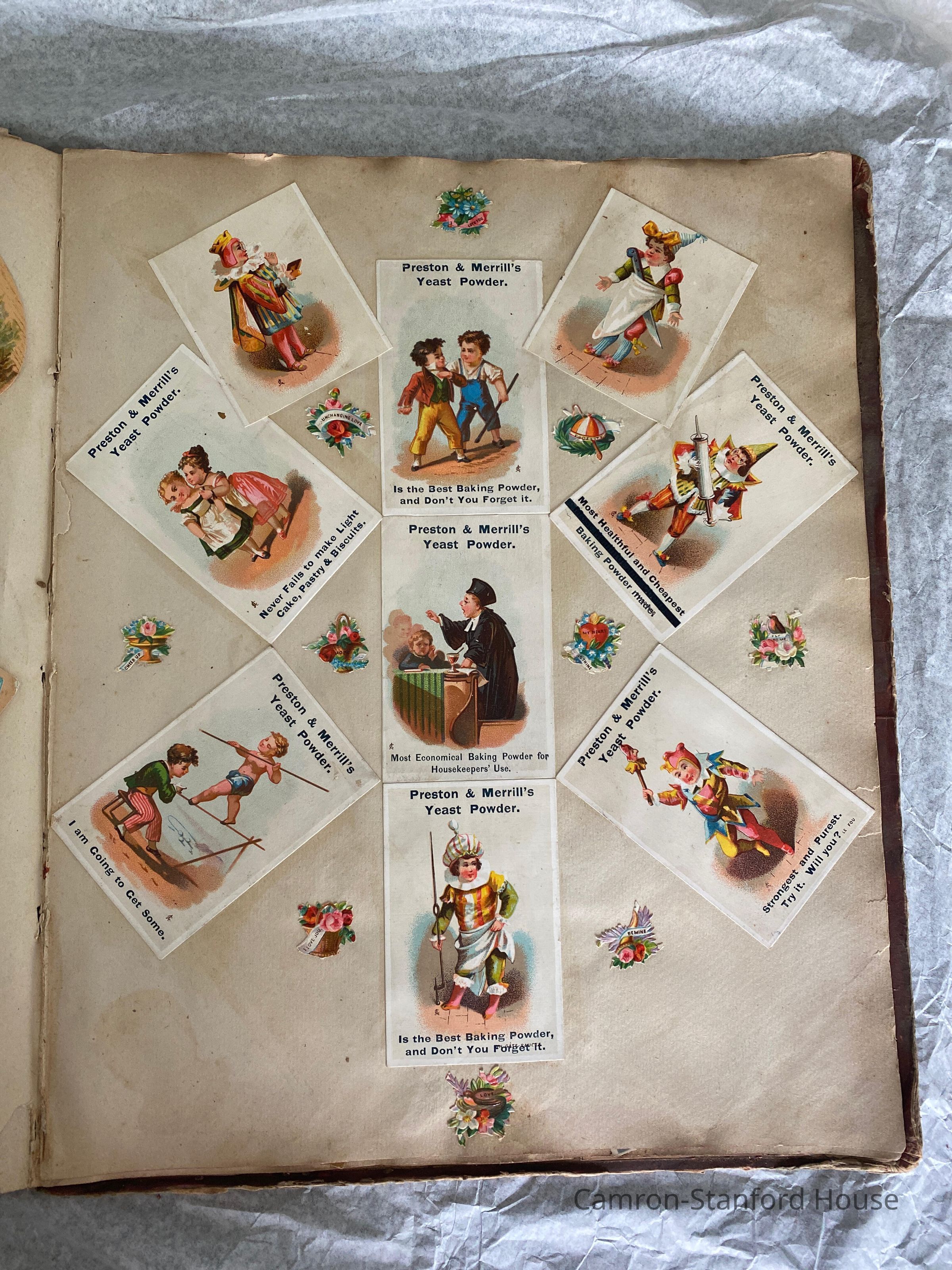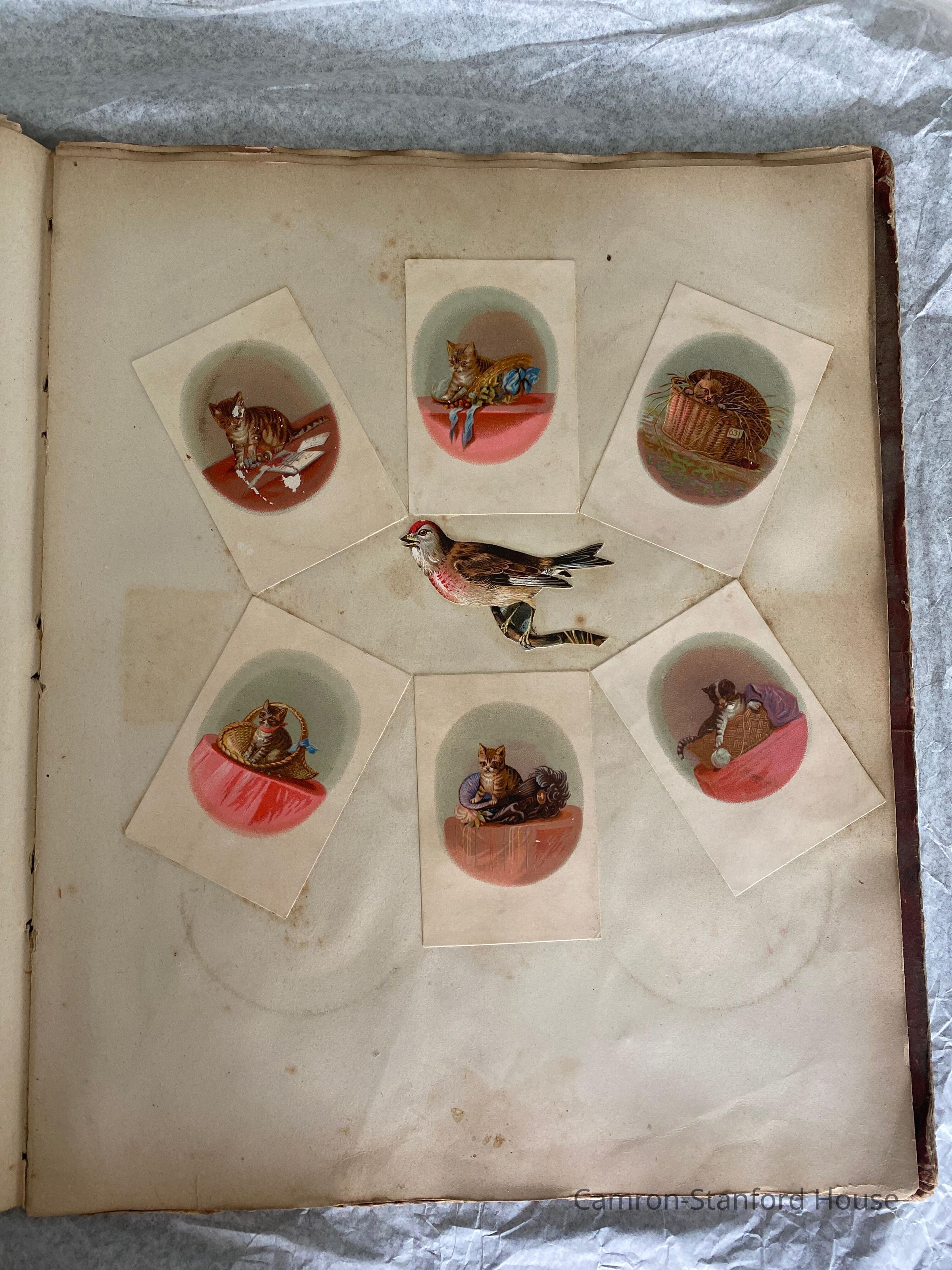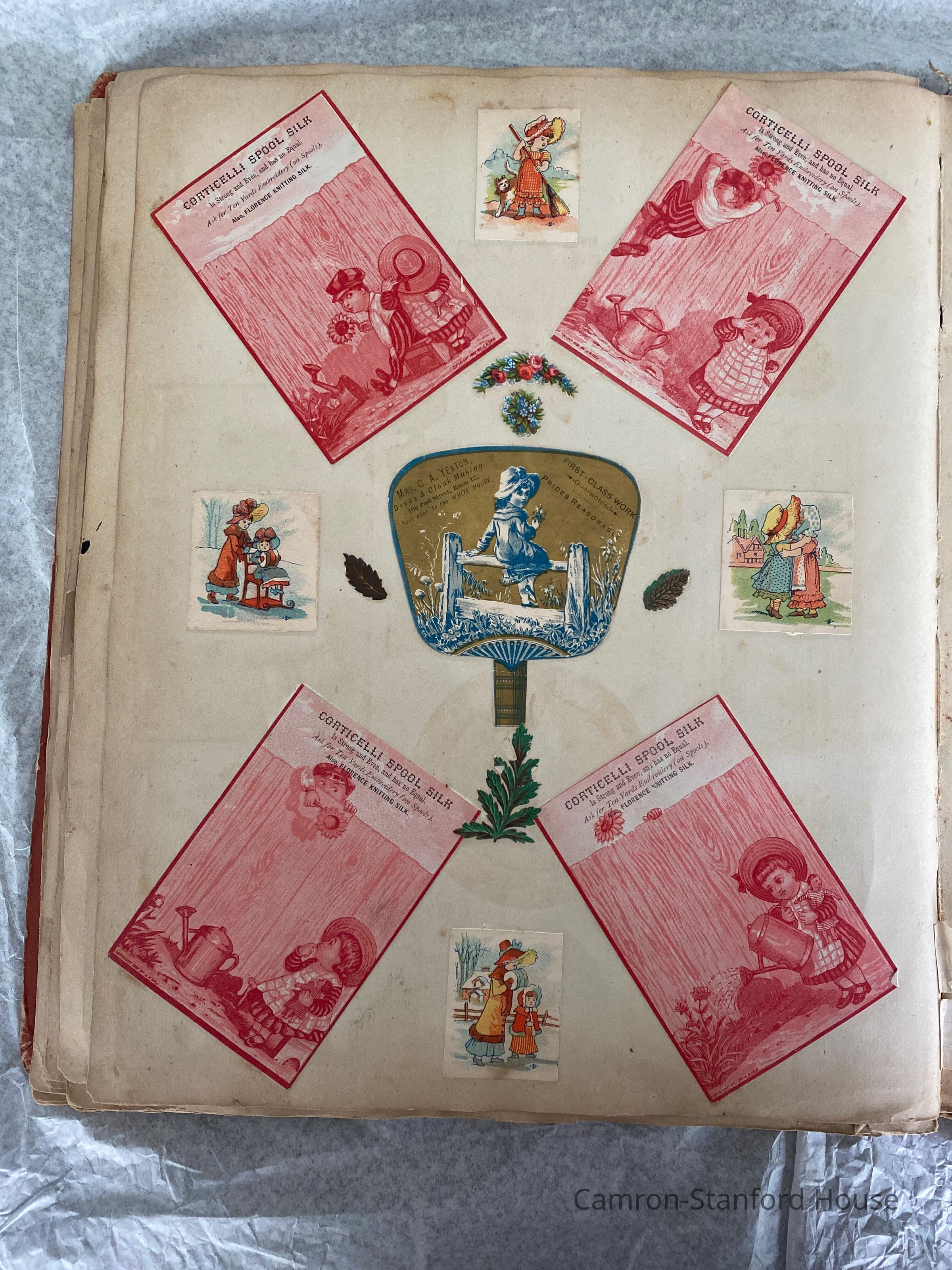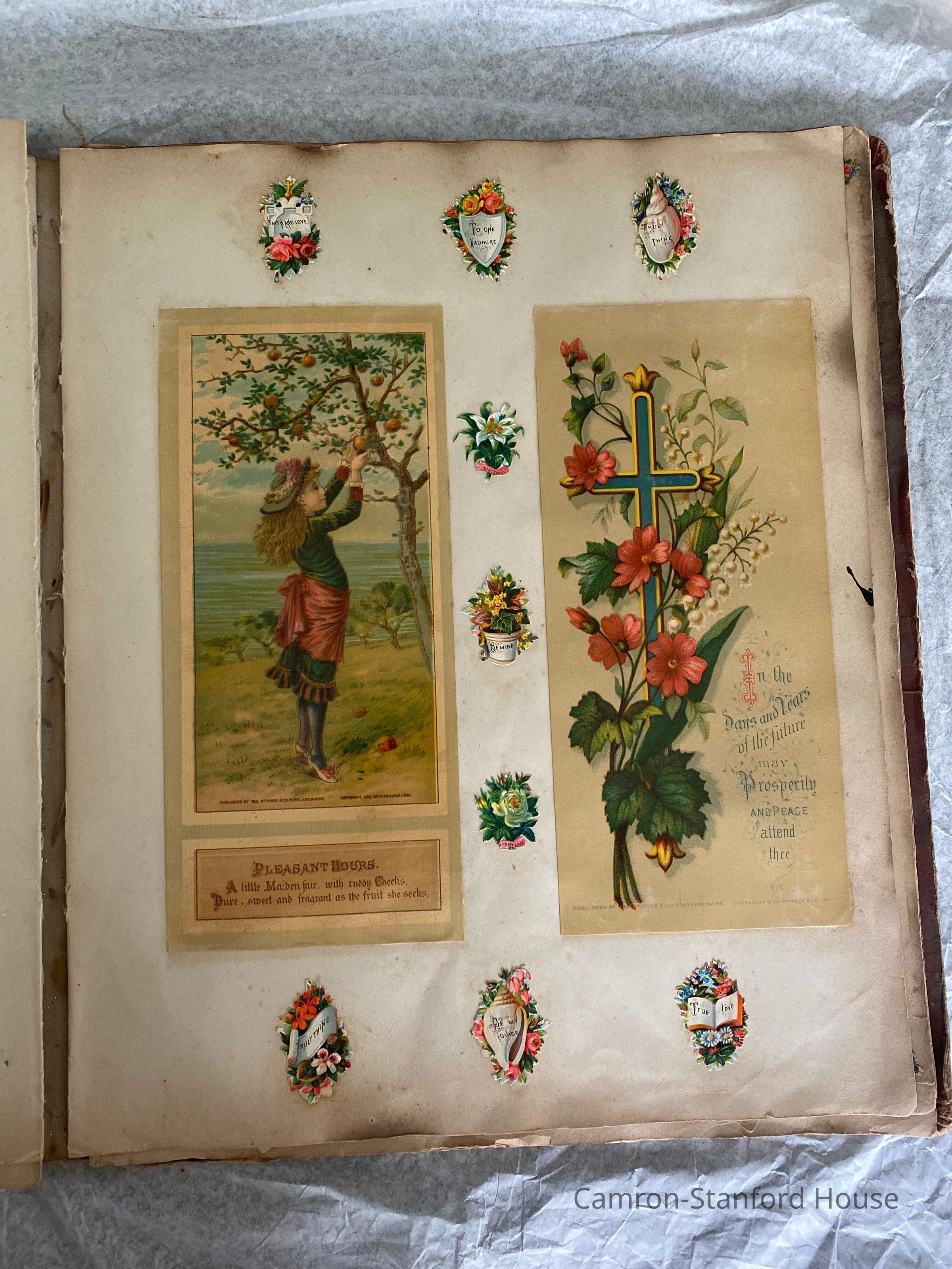 A scrapbook containing over five hundred 19th century trade cards, postcards, and other printed advertisements and ephemera. The majority of the pieces on the pages of this scrapbook are advertisements from San Francisco businesses.