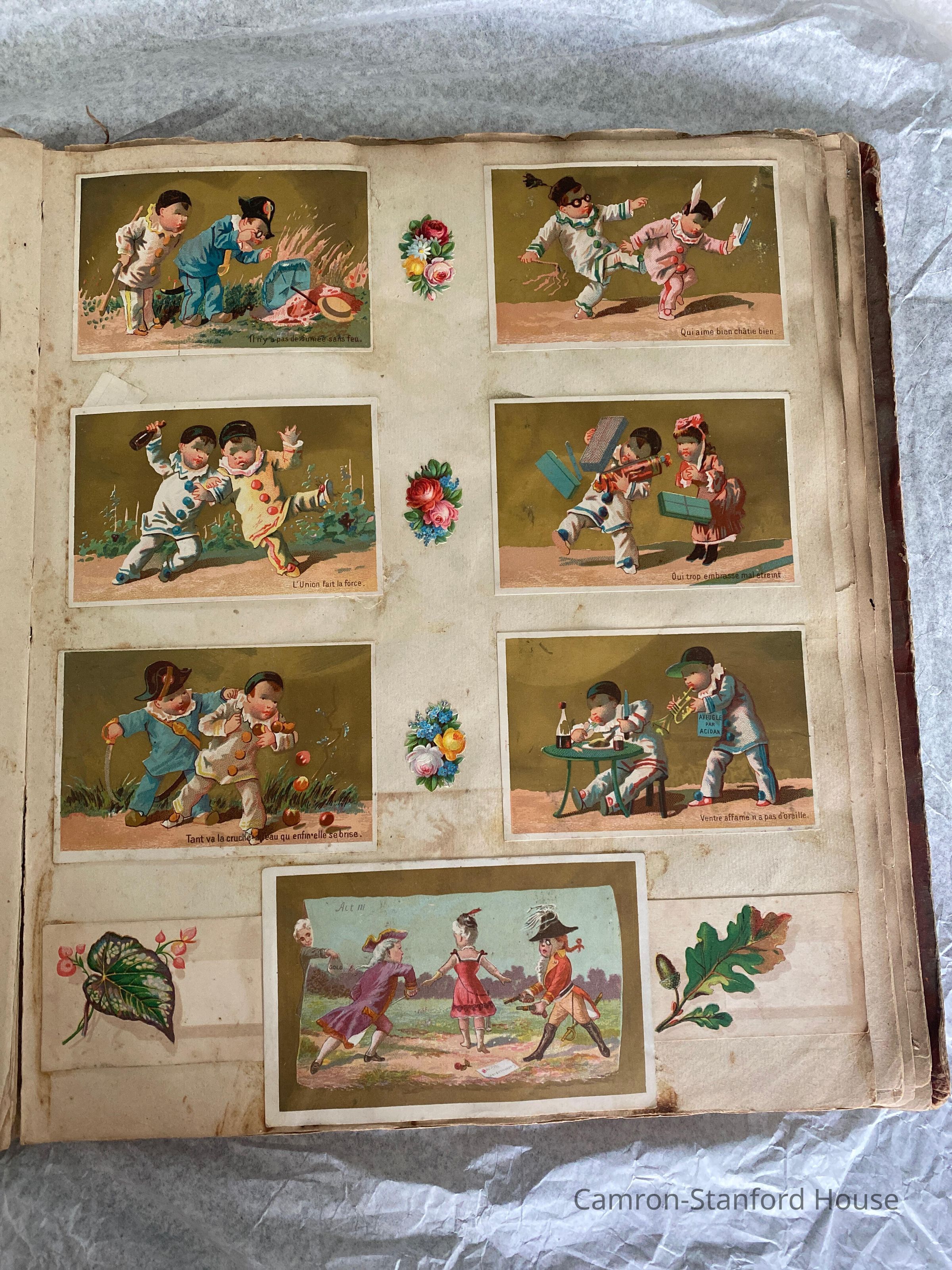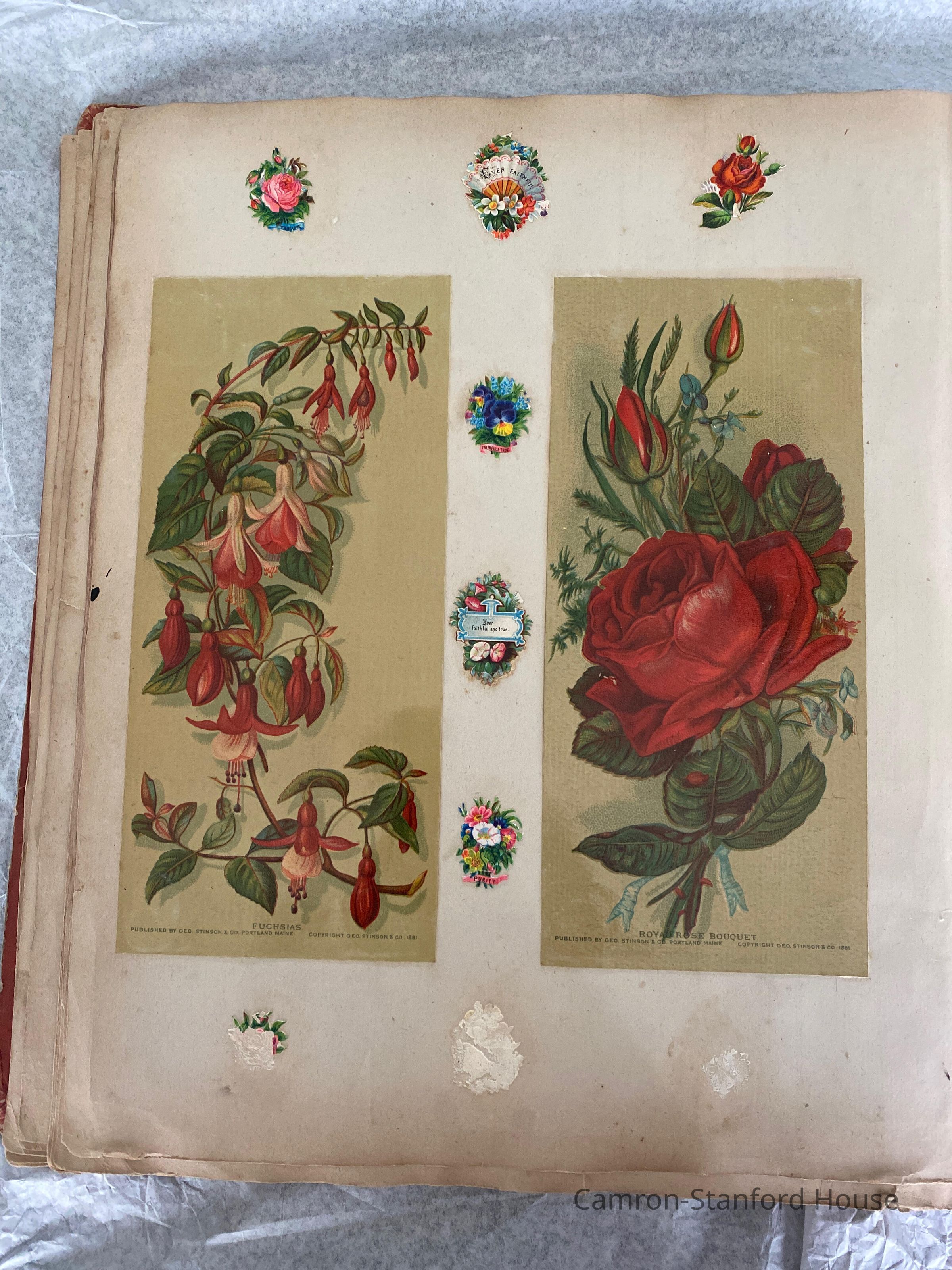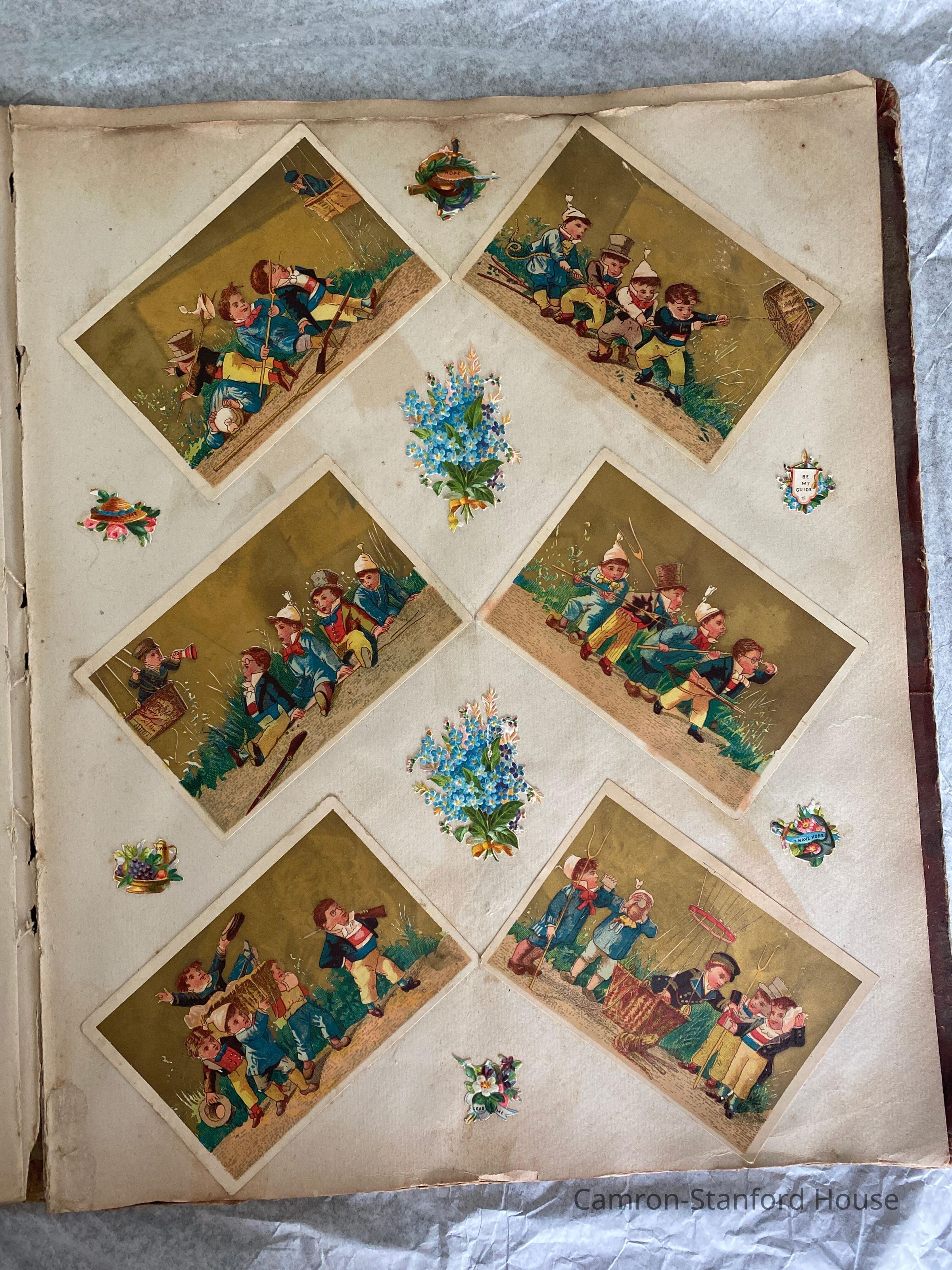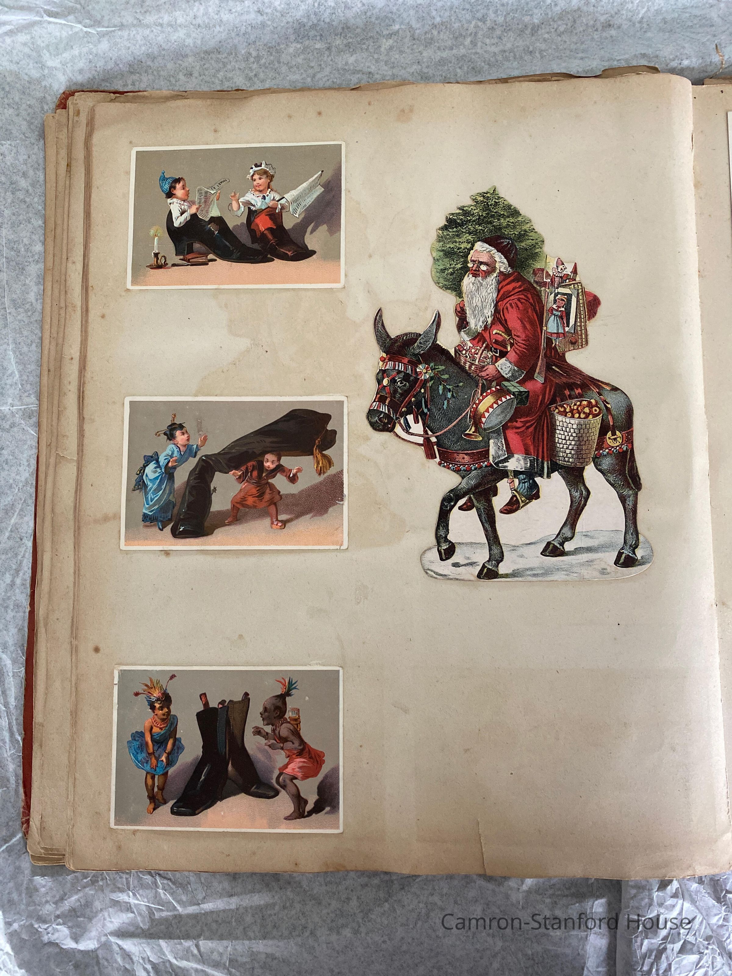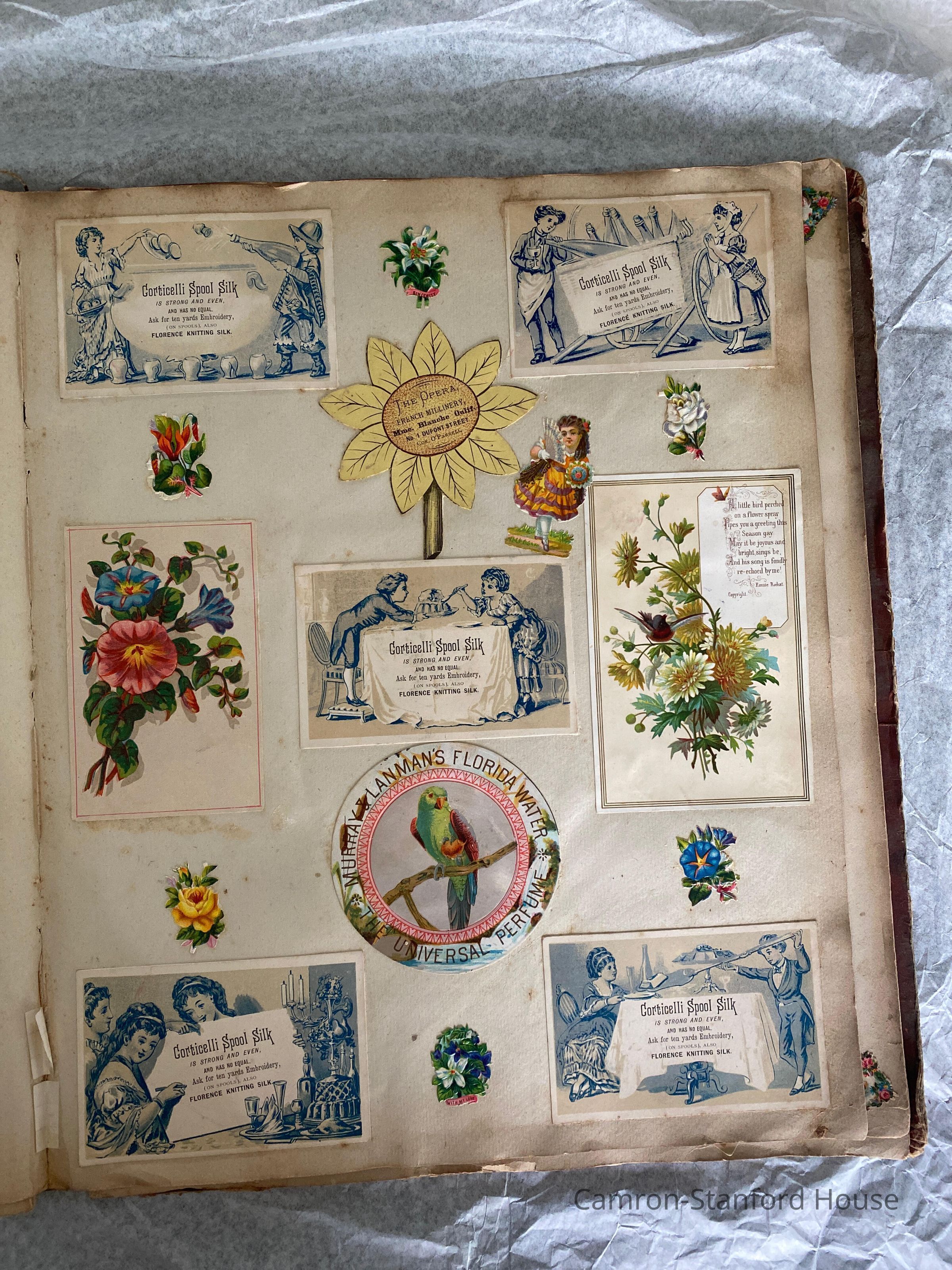A scrapbook containing over five hundred 19th century trade cards, postcards, and other printed advertisements and ephemera. The majority of the pieces on the pages of this scrapbook are advertisements from San Francisco businesses.