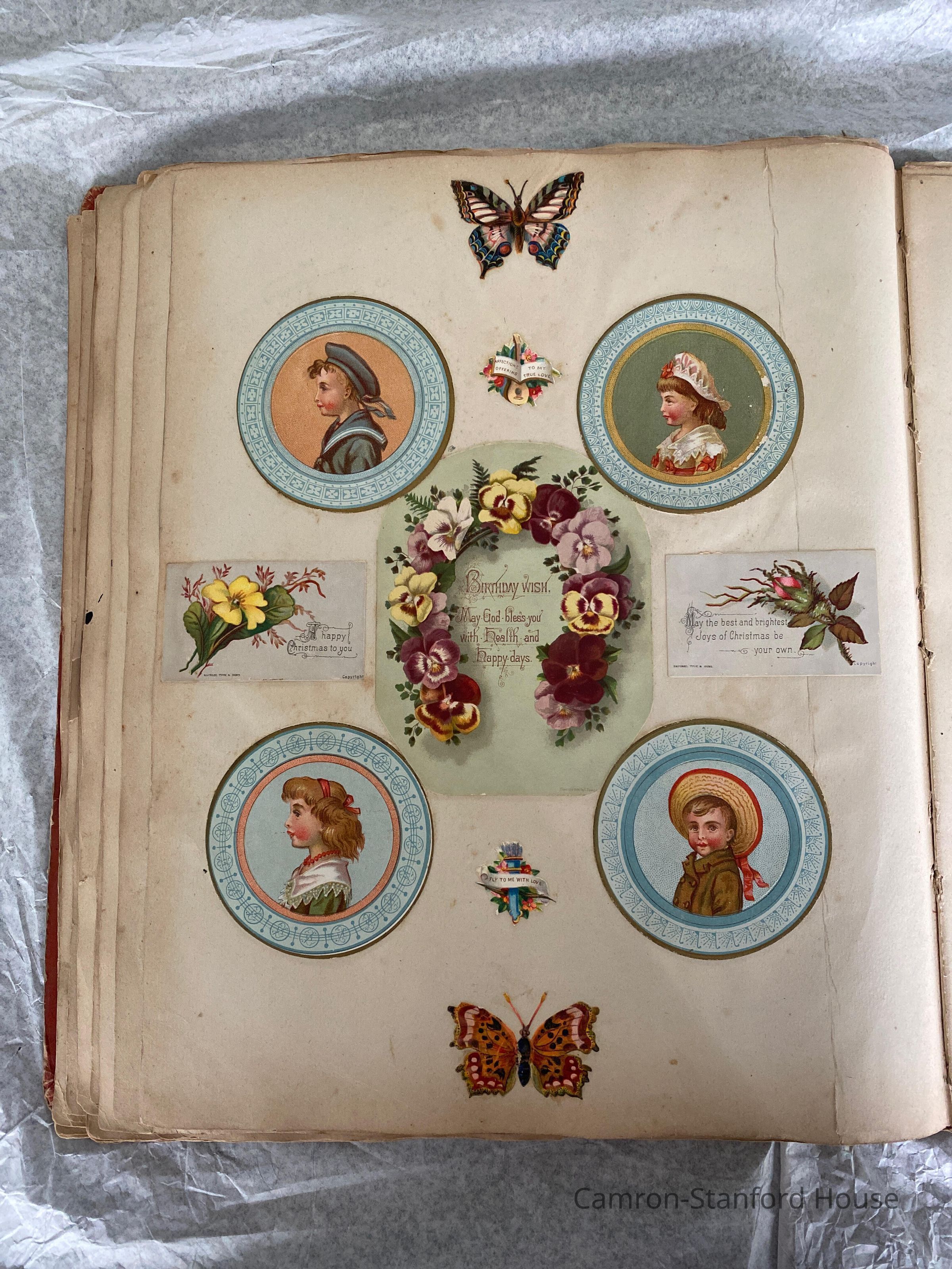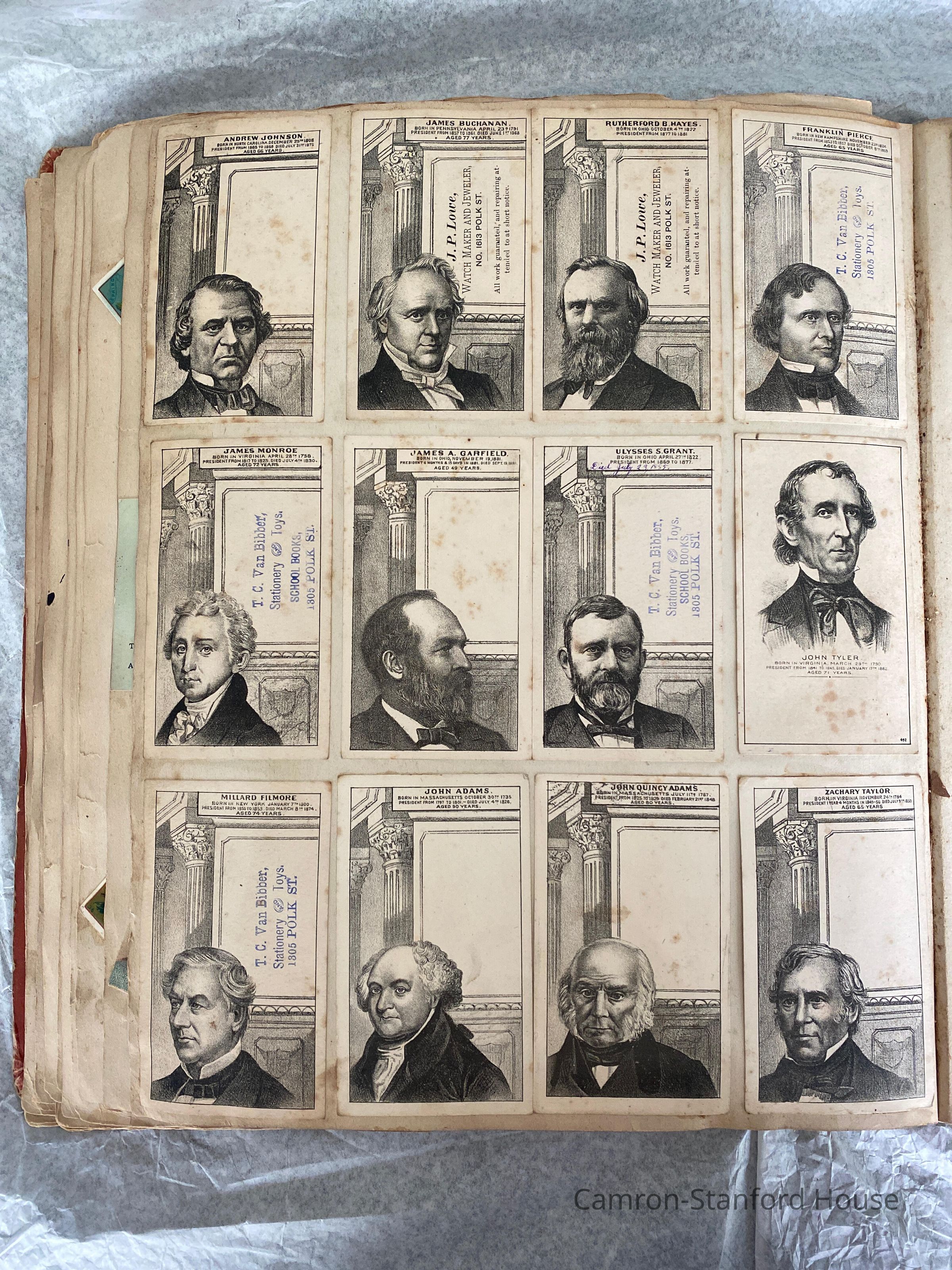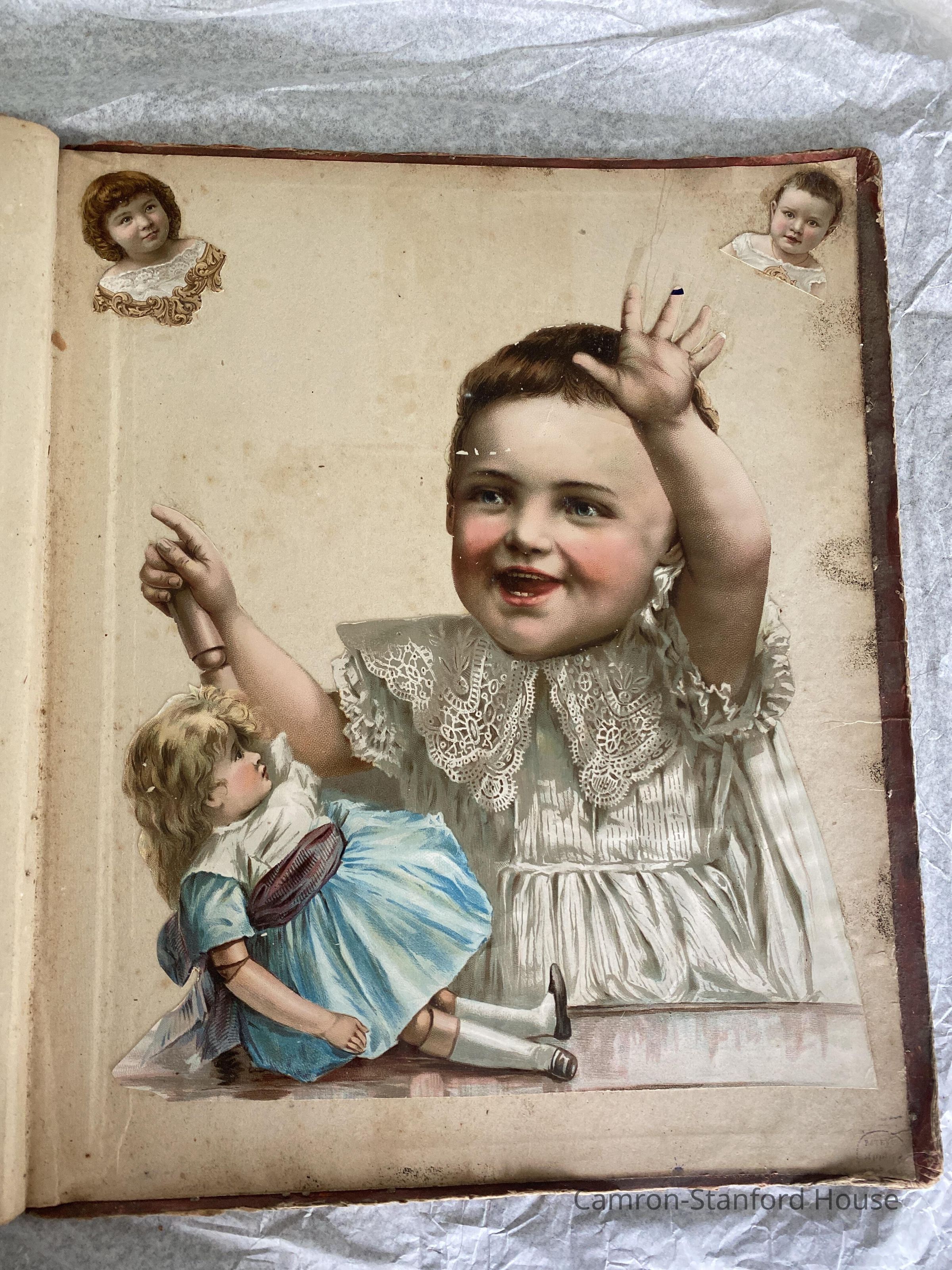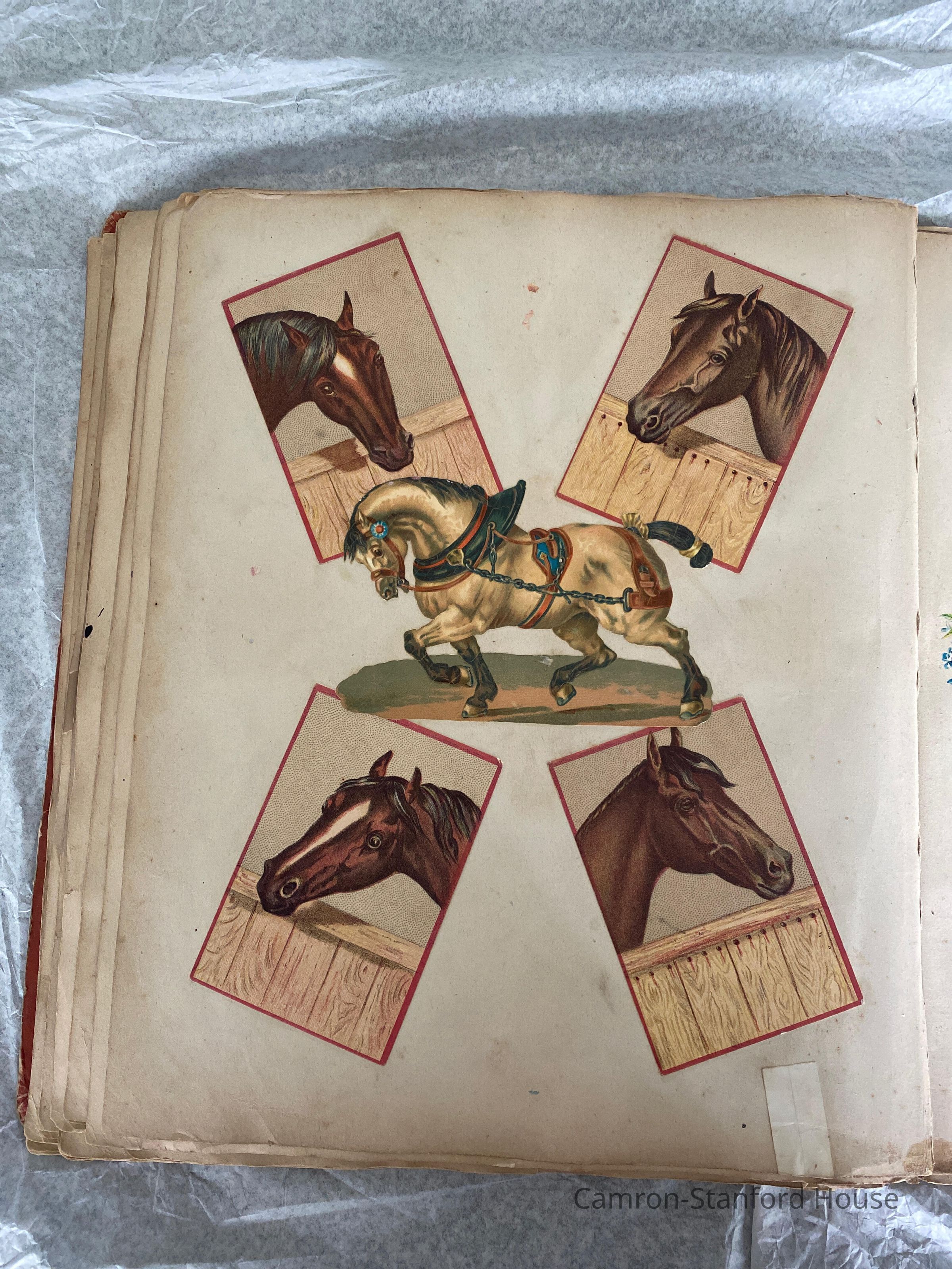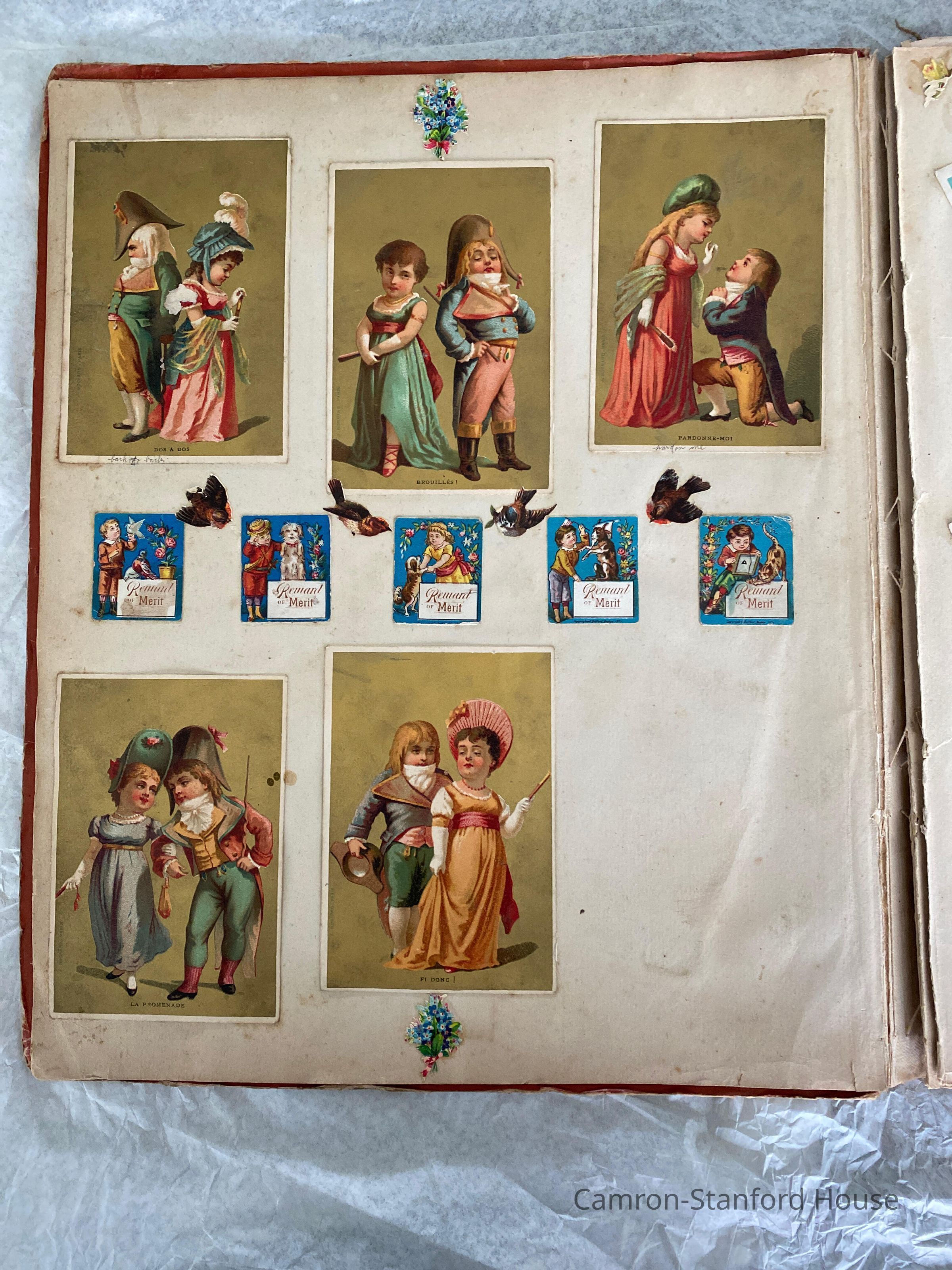 A scrapbook containing over five hundred 19th century trade cards, postcards, and other printed advertisements and ephemera. The majority of the pieces on the pages of this scrapbook are advertisements from San Francisco businesses.