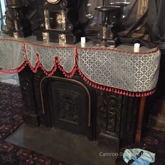 Fireplace with black marble mantle. Located in the formal dining room of the Camron-Stanford House