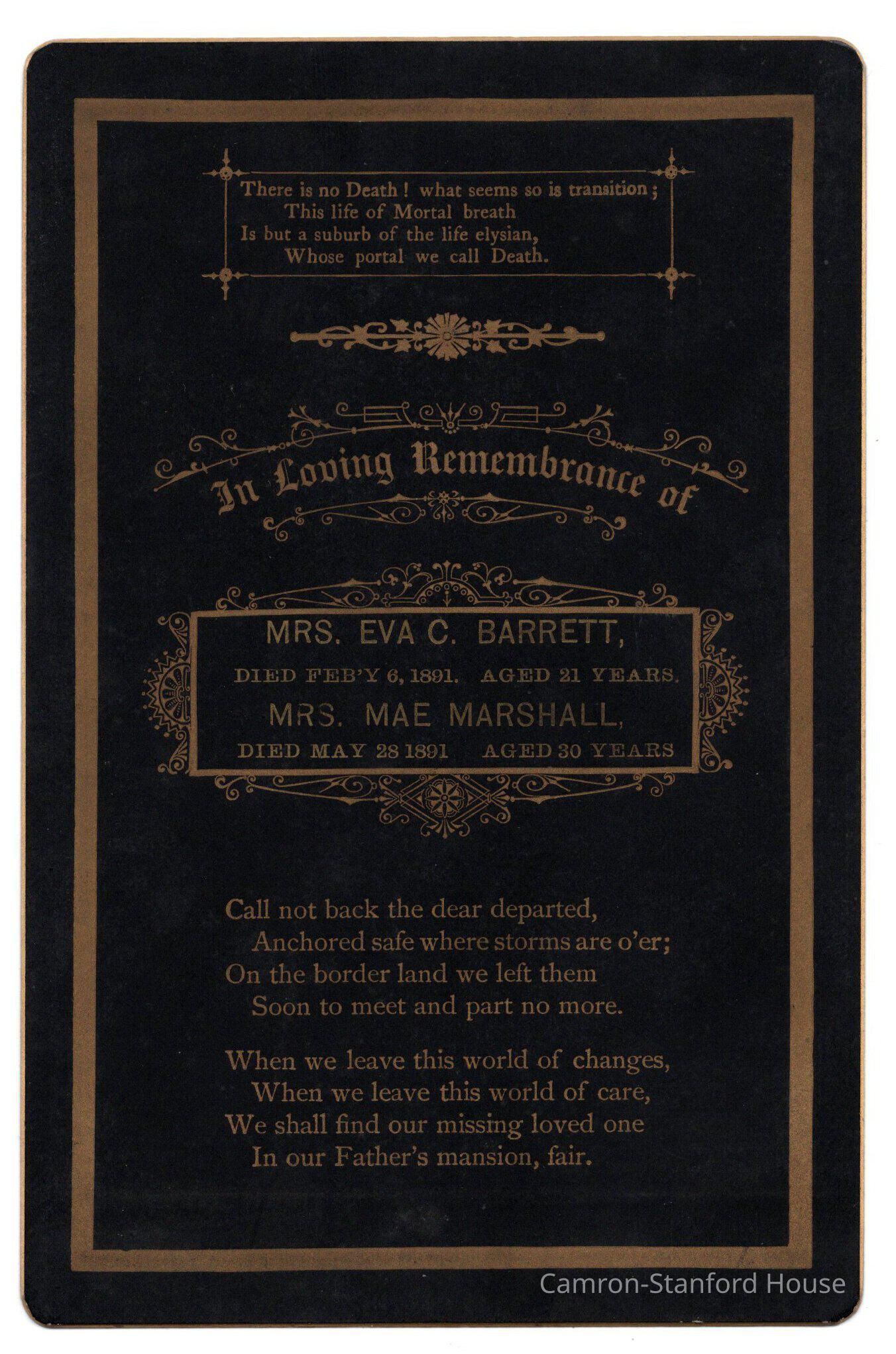 Funeral card honoring the deaths of Mrs. Eva C. Barrett (d. Feb 6 1891, age 21) and Mrs. Mae Marshall (d. May 18, 1891, age 30). The card has a brief passage of mourning in honor of the two.