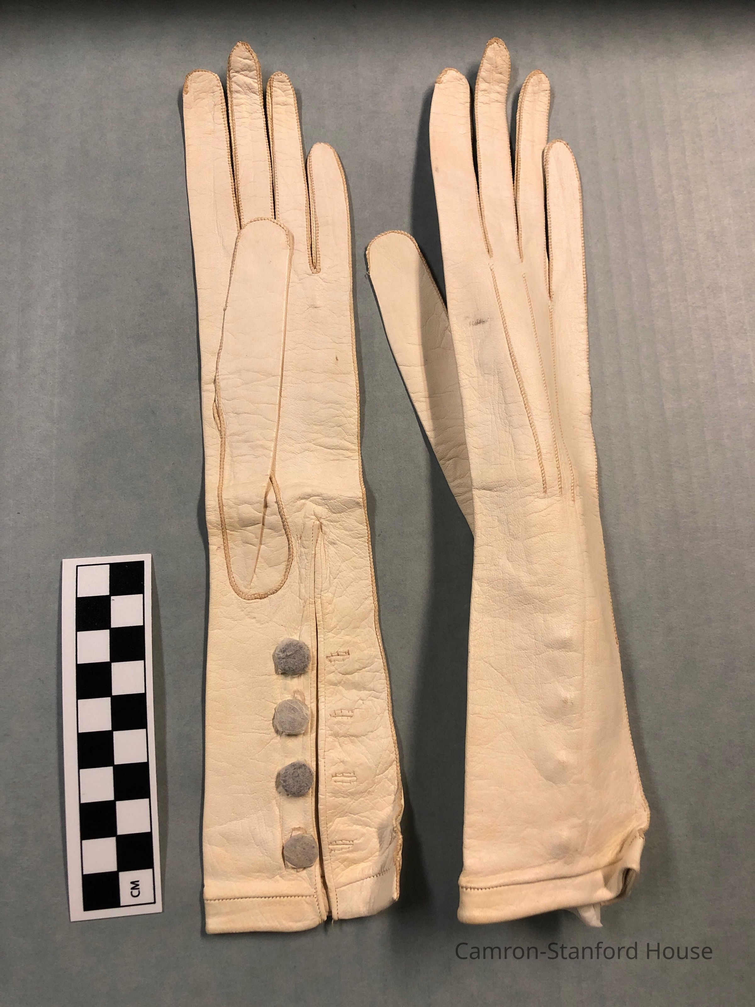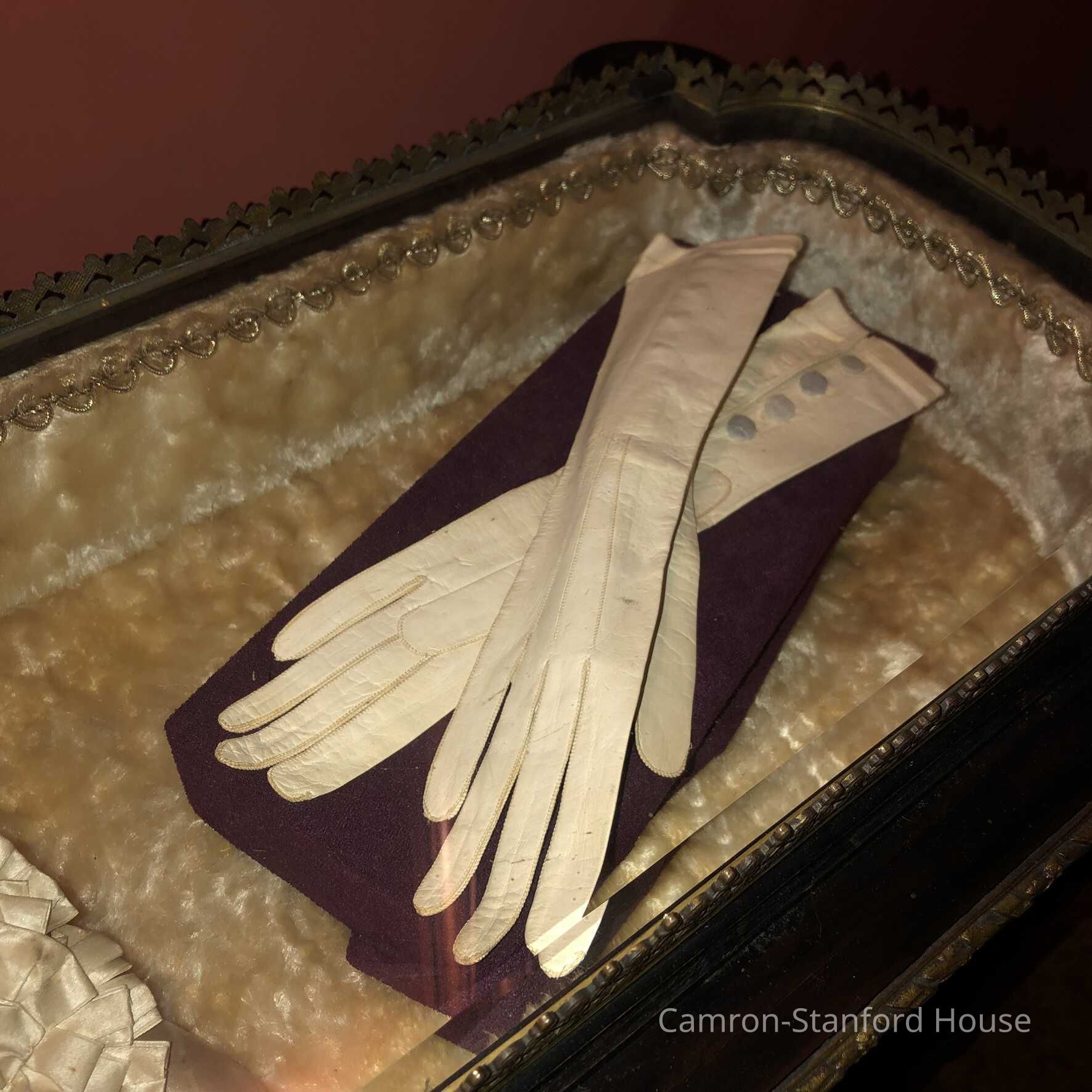 Pair of white gloves, worn by Franklina C. Gray at her wedding to William Bartlett on March 21, 1878. These gloves, made of kid leather, were purchased in Rome, Italy, during the Hewes party Grand Tour of Europe between 1875 and 1877. The Inside lists size as 5 3/4.