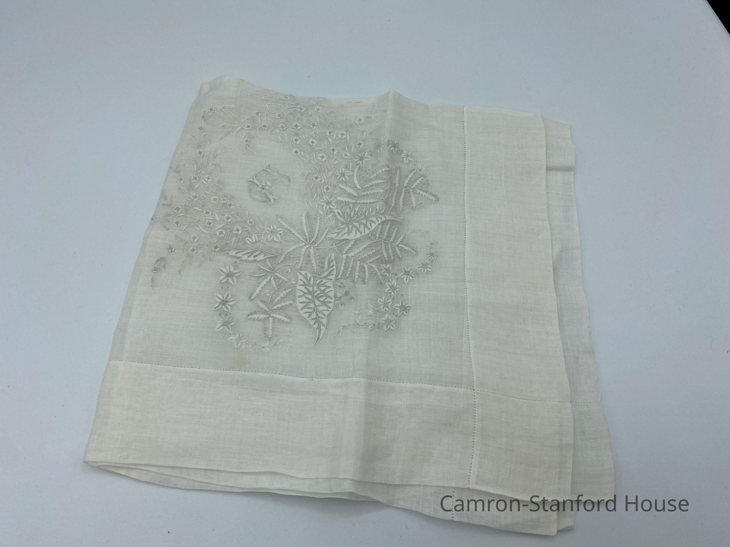 White cotton handkerchief with initials FCG (Franklina C. Gray) embroidered in white thread.