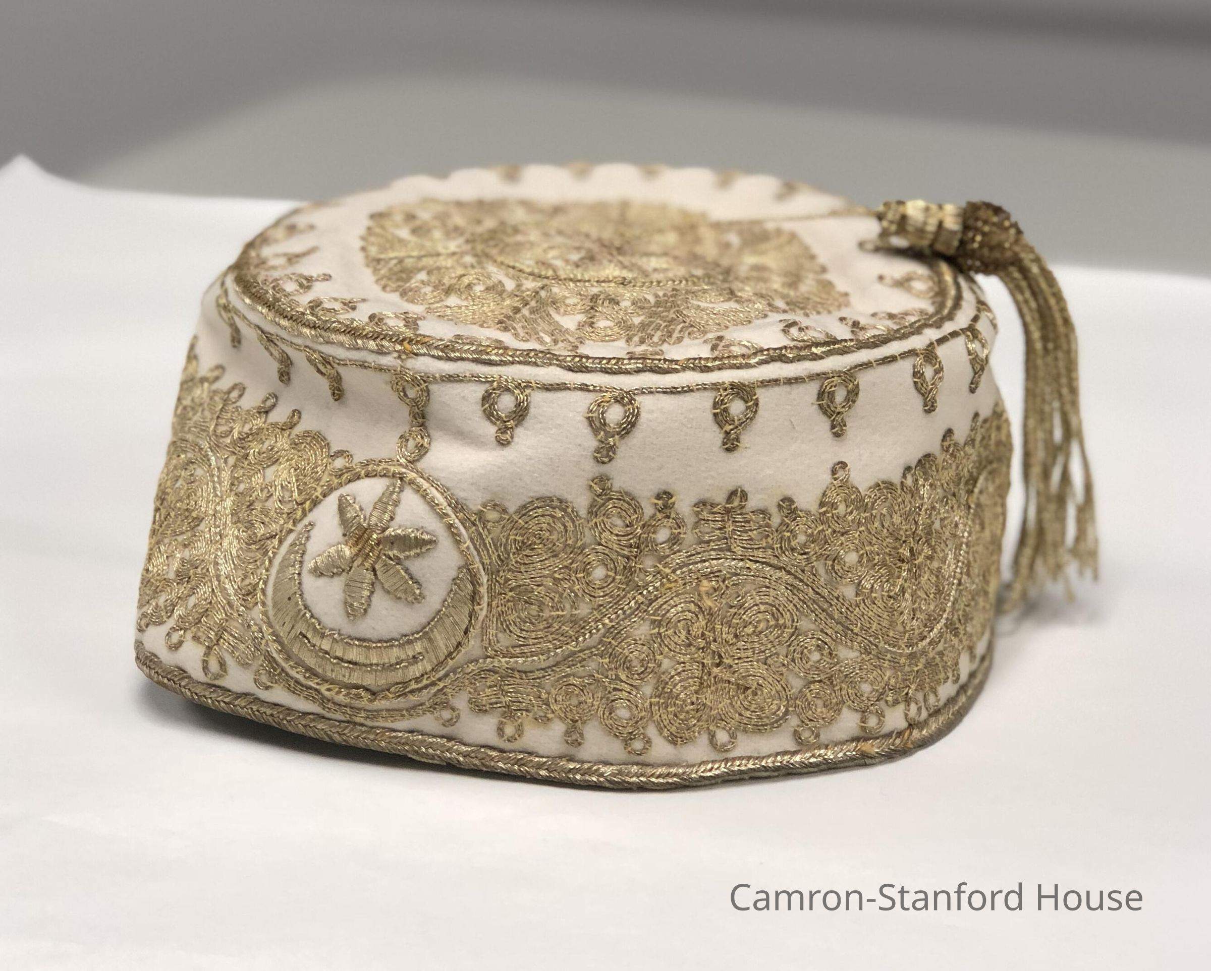 Hat made from fine silk and gold thread embroidery. Part of a collection purchased by Franklina during her Grand Tour of Europe and the Middle East (1875-1877). Set includes this cap, matching opera cape, vest, and belt.Label