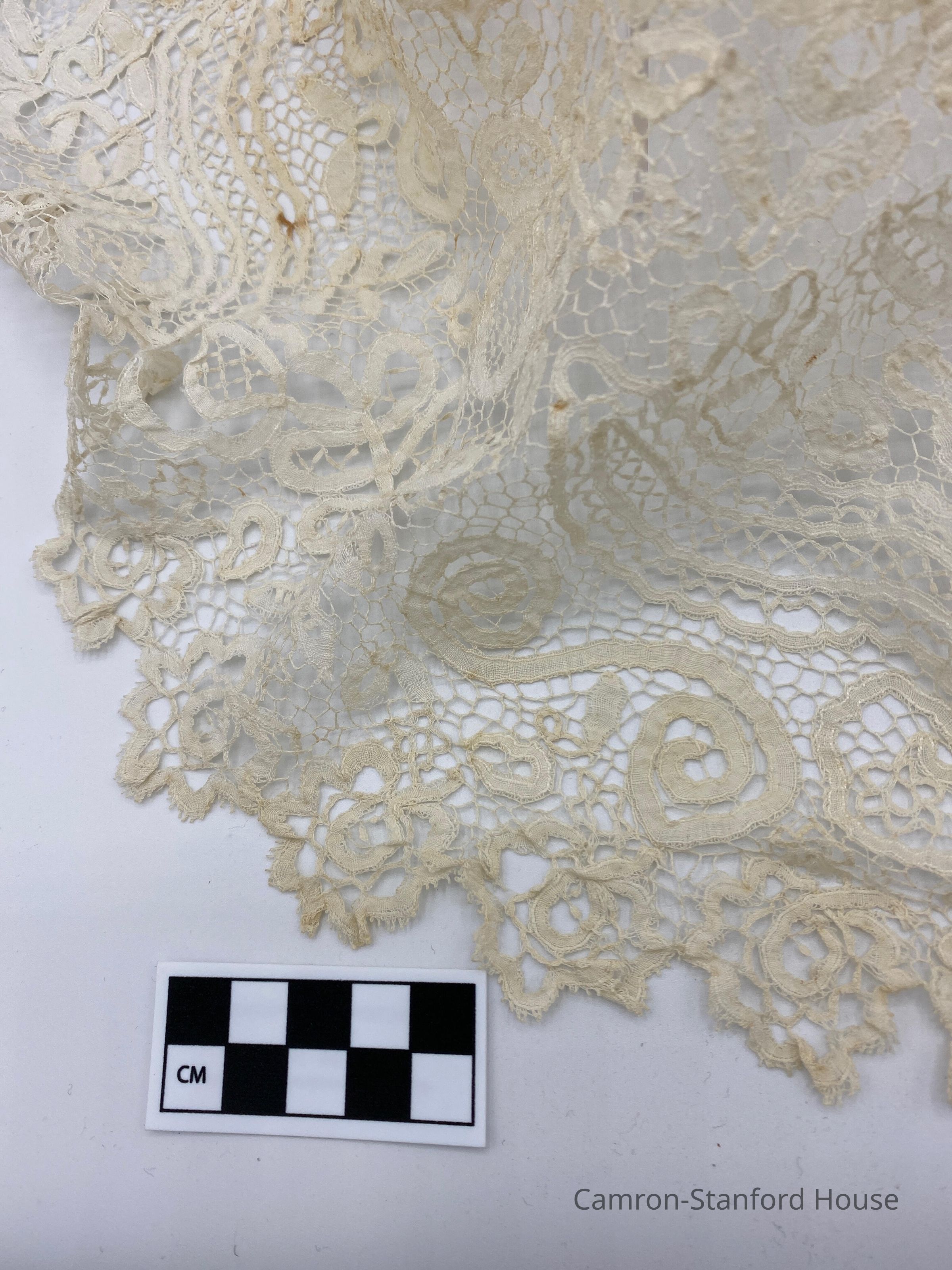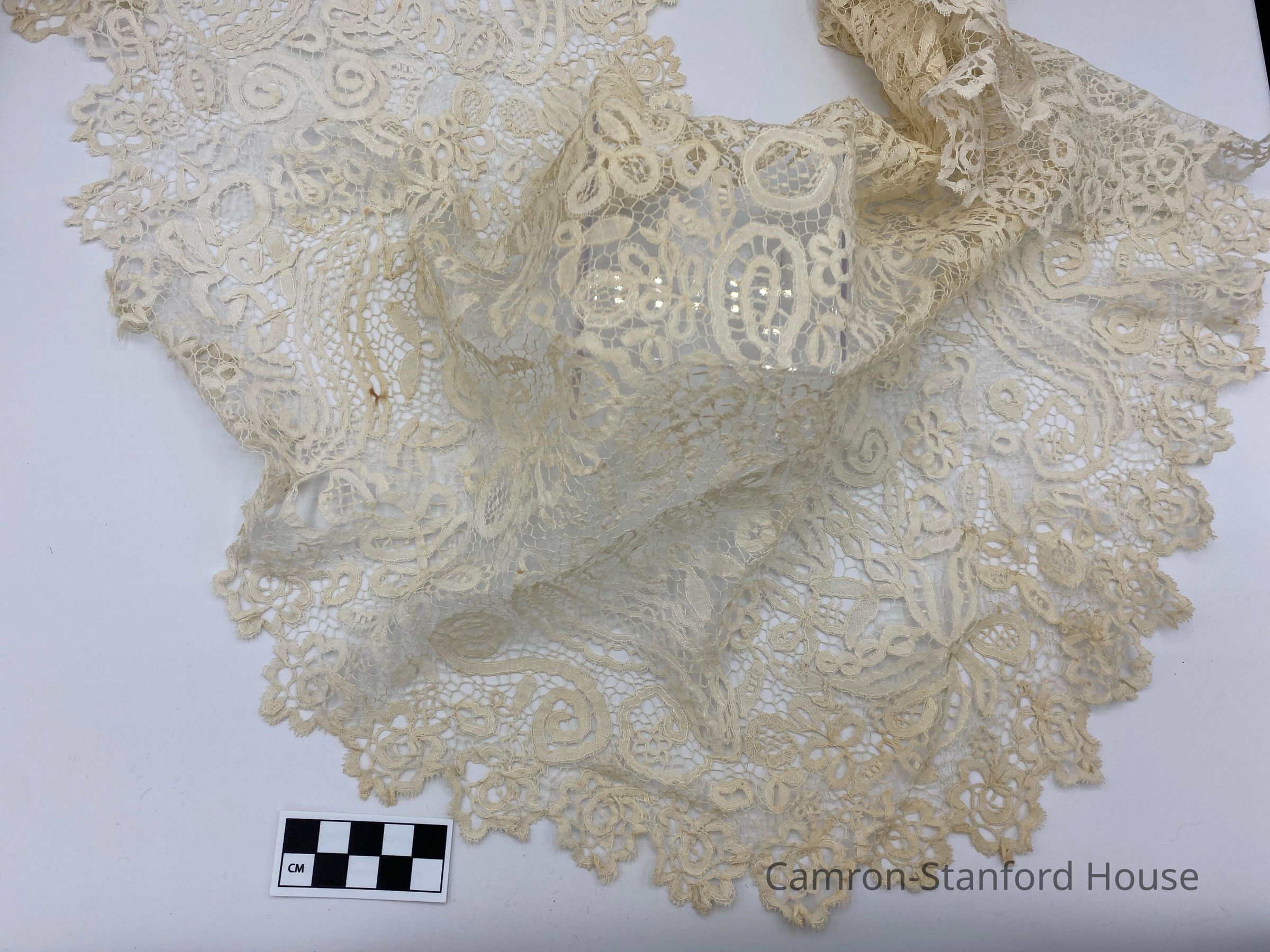 Cream colored lace triangular shawl, organic pattern. Piece was owned by Franklina C. Gray.