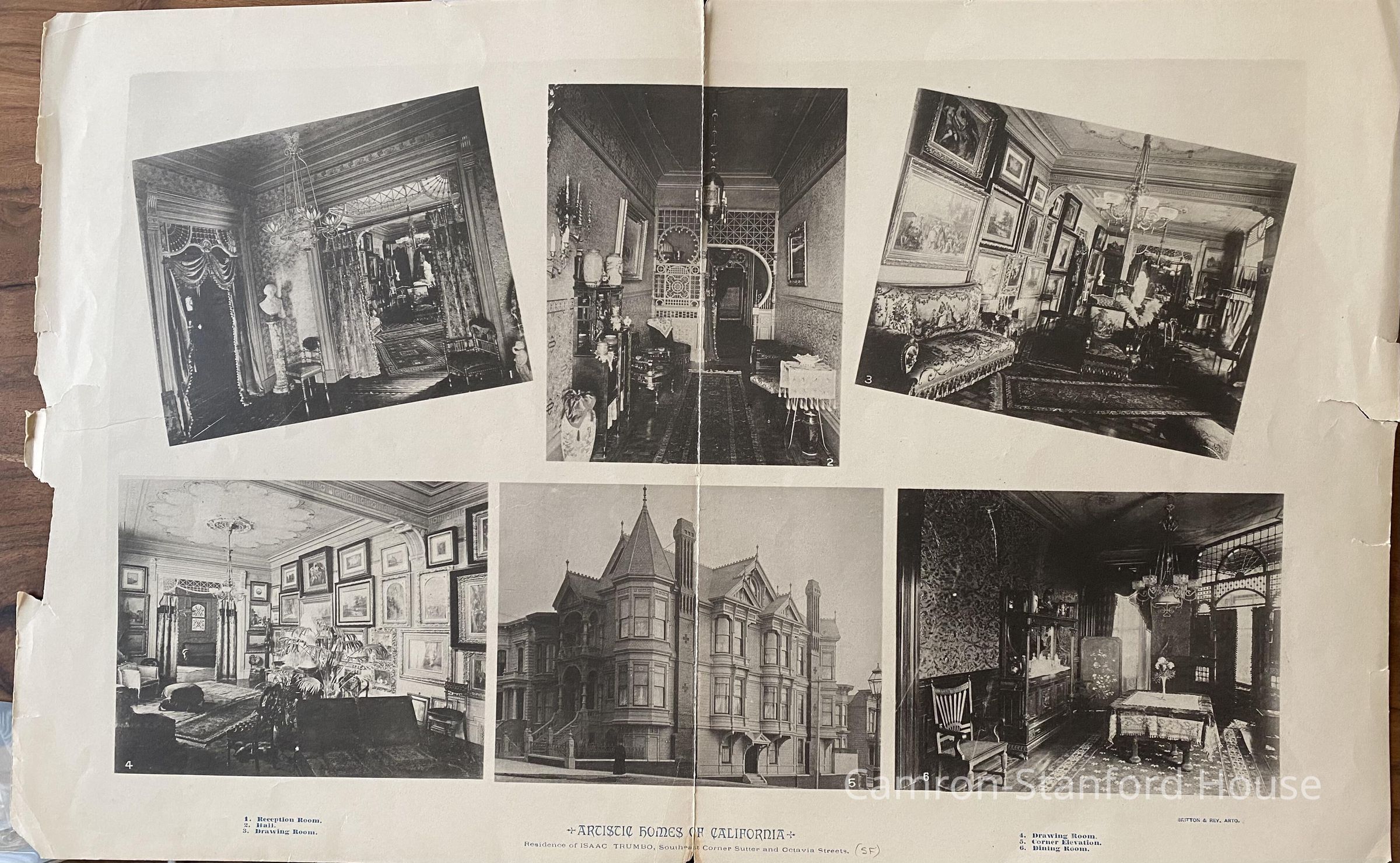Lithograph print of views of the Trumbo residence in San Francisco, California. Viewing these images helped provide the Camron-Stanford House Preservation Association guidance while restoring the Camron-Stanford House. The images are a fine example of what an upper-middle class home interior may have looked like in the late 1800s.