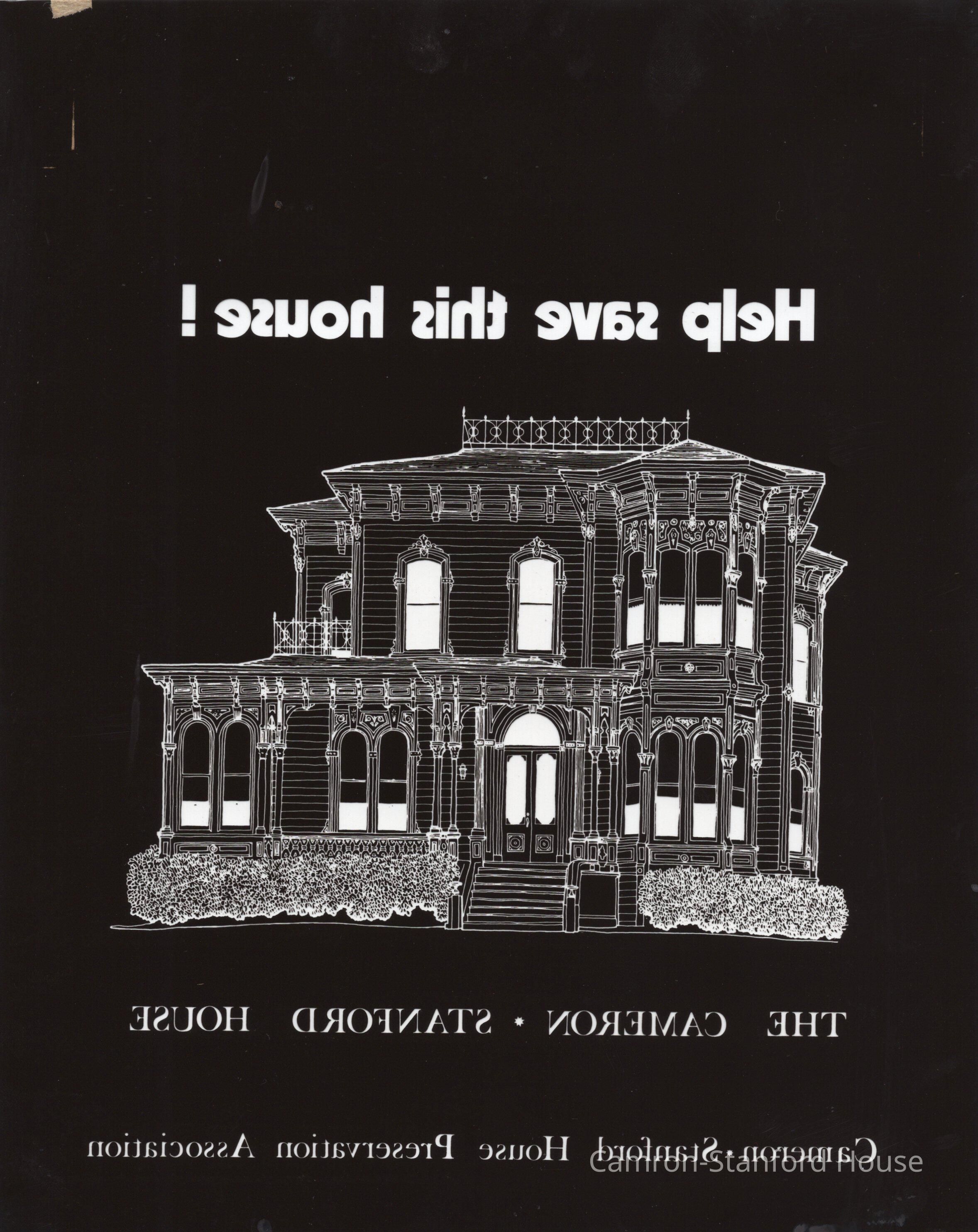 This graphic design was used to create campaign posters to drive up support for the restoration of the Camron-Stanford House in the 1970s.
