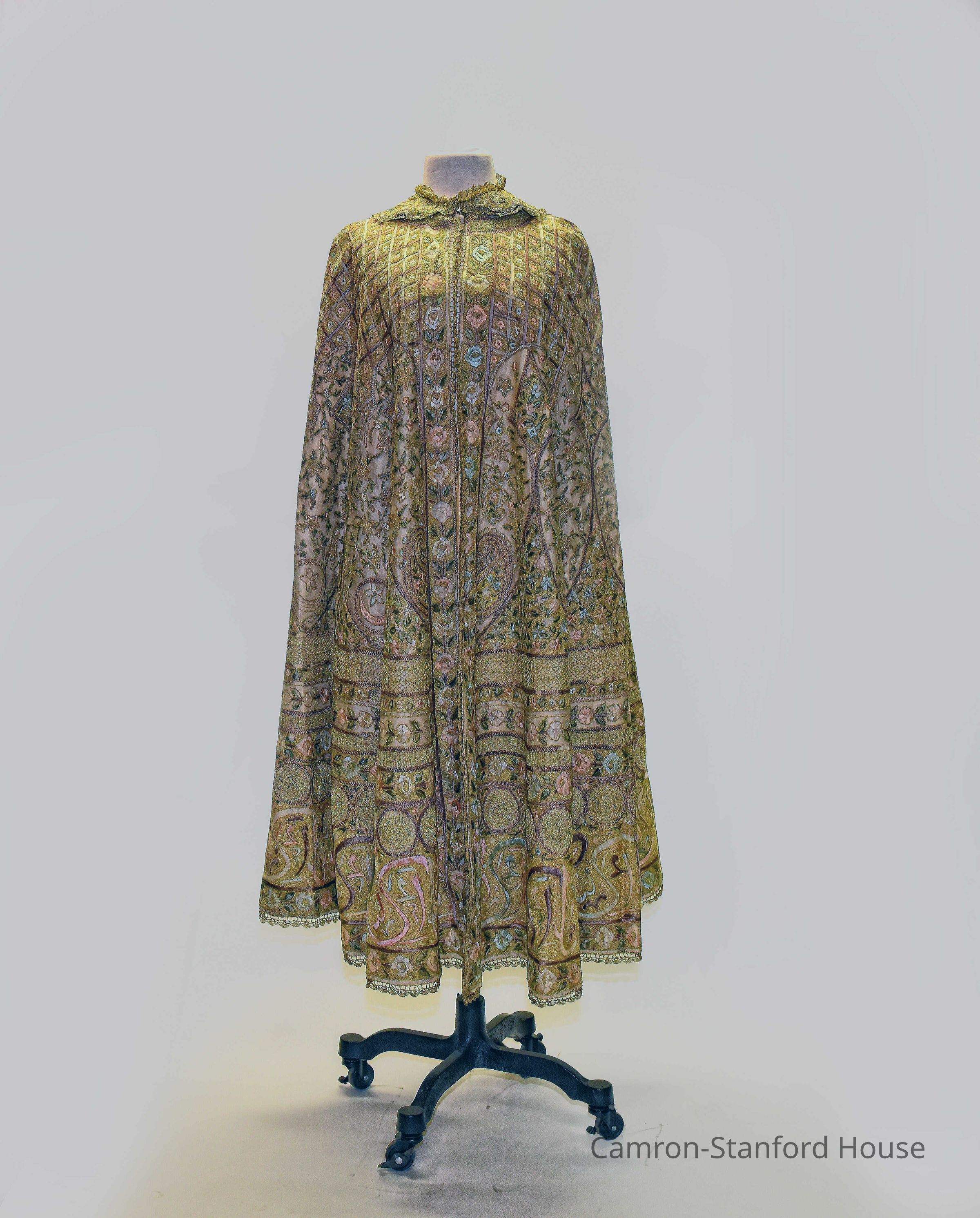 Opera cape which belonged to Franklina Gray Bartlett. Cape was purchased as part of a matching set which included a cap, vest, and belt. Purchased during her Grand Tour of Europe and the Middle East (1875-1877).Label