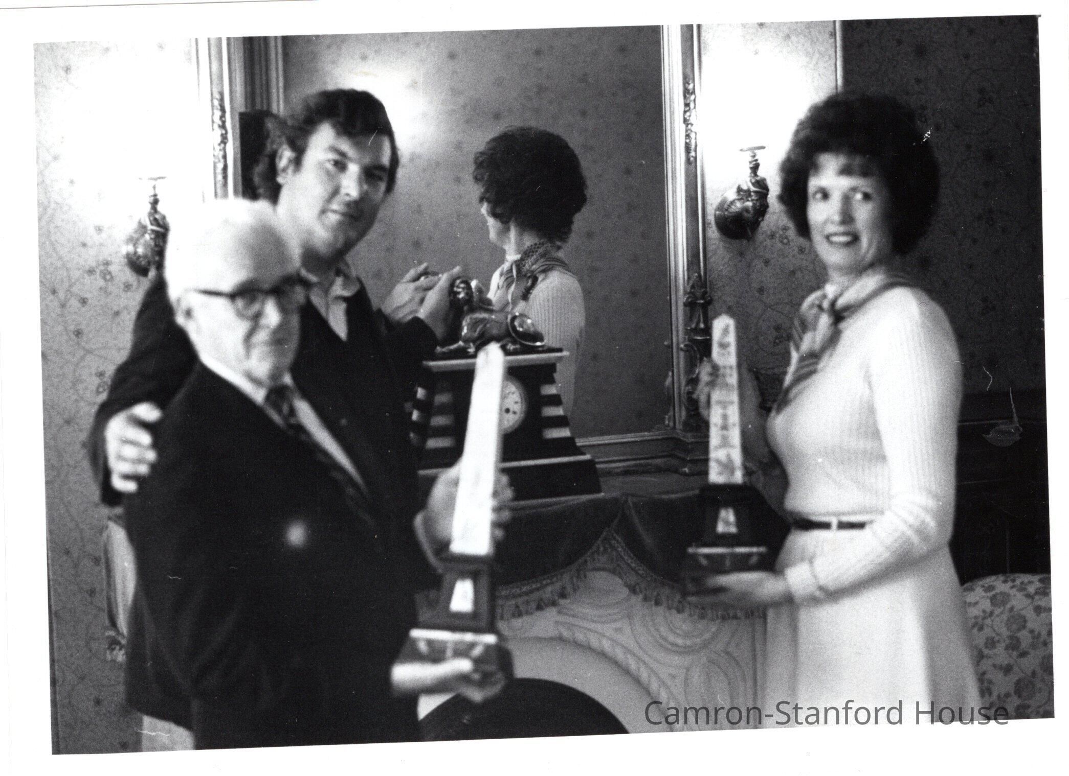 Former Camron-Stanford board president, Elaine Oldham, meets with members of the Victorian Alliance of San Franciso, including president Earl Moss and Frank Rapp. The Victorian Alliance donated the Egyptian Revival mantle clock and matching ornaments seen in this image, which are still on display in the Family Parlor today. The set matches one that was once owned and described by Franklina C. Gray in an 1875 letter.