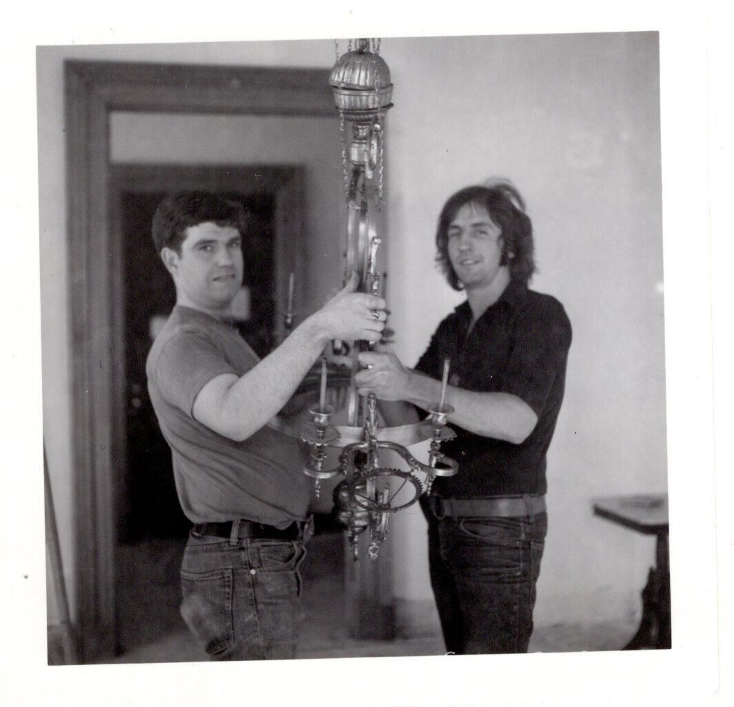 Volunteers Gabriel Sheridan and Peter Carlson installing the gas chandalier in the front parlor. The chandelier was a gift from Mr. Sheridan during the 1970s restoration period and outfitting of the period rooms.