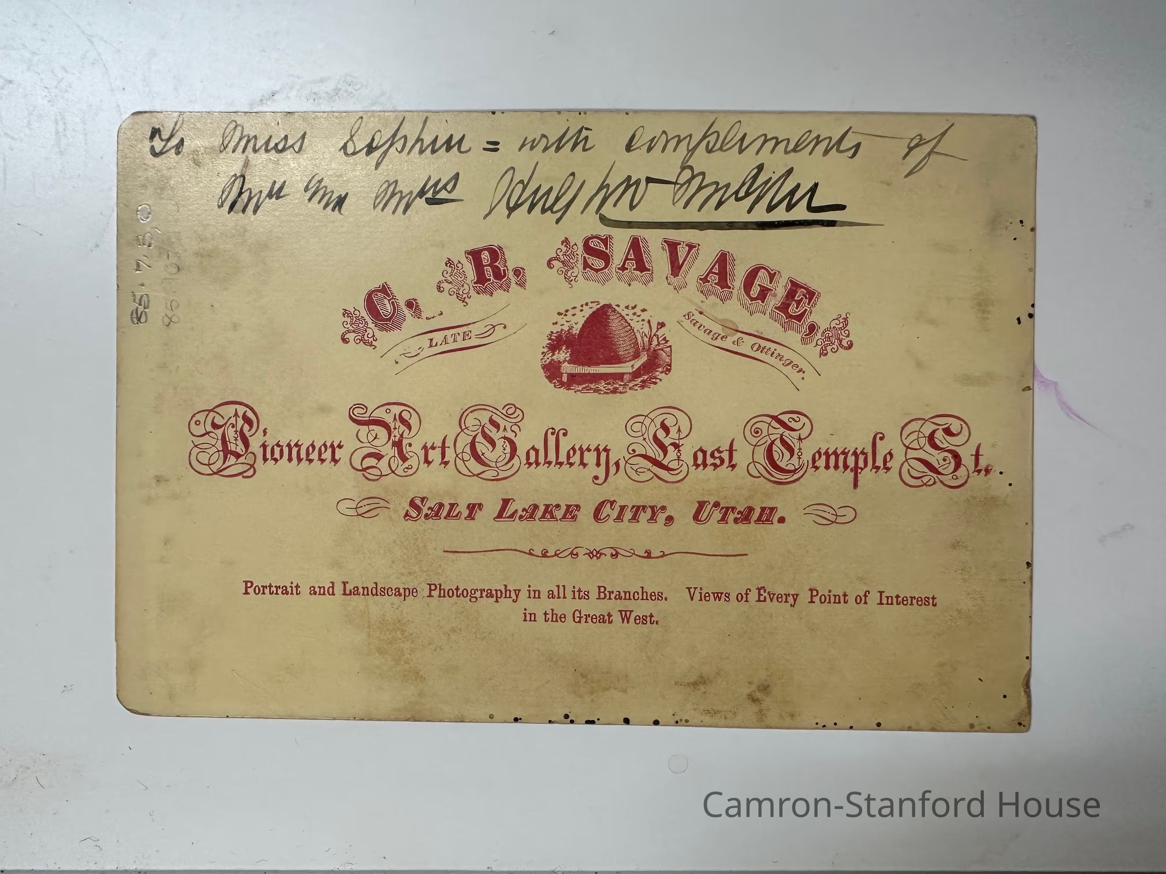 "To Miss Sophie- with compliments of / Mr. and Mrs. ---?---"