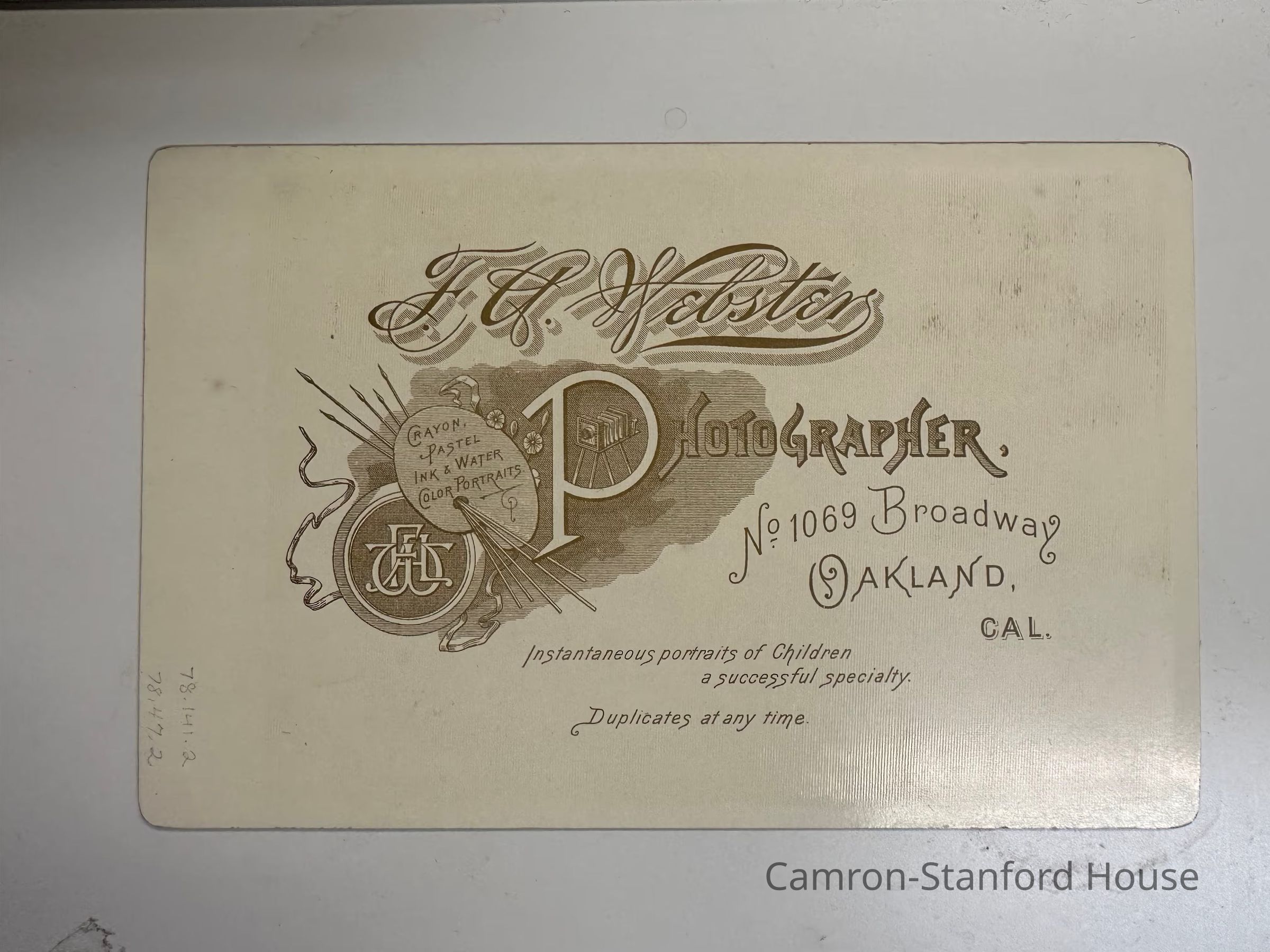 F.G. Webster Photographer, No. 1069 Bradway Oakland, Cal. Instantaneous portraits of Children a successful speciality. Duplicates at any time.