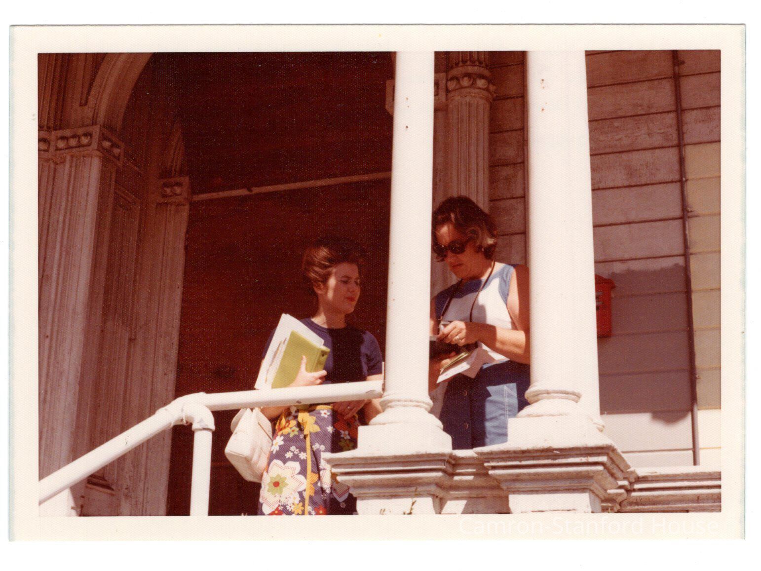 Board members (L) Frankie Rhodes and (R) Joann Sutro confer on evidence of original paint colors before 1973 painting of the Camron-Stanford House.