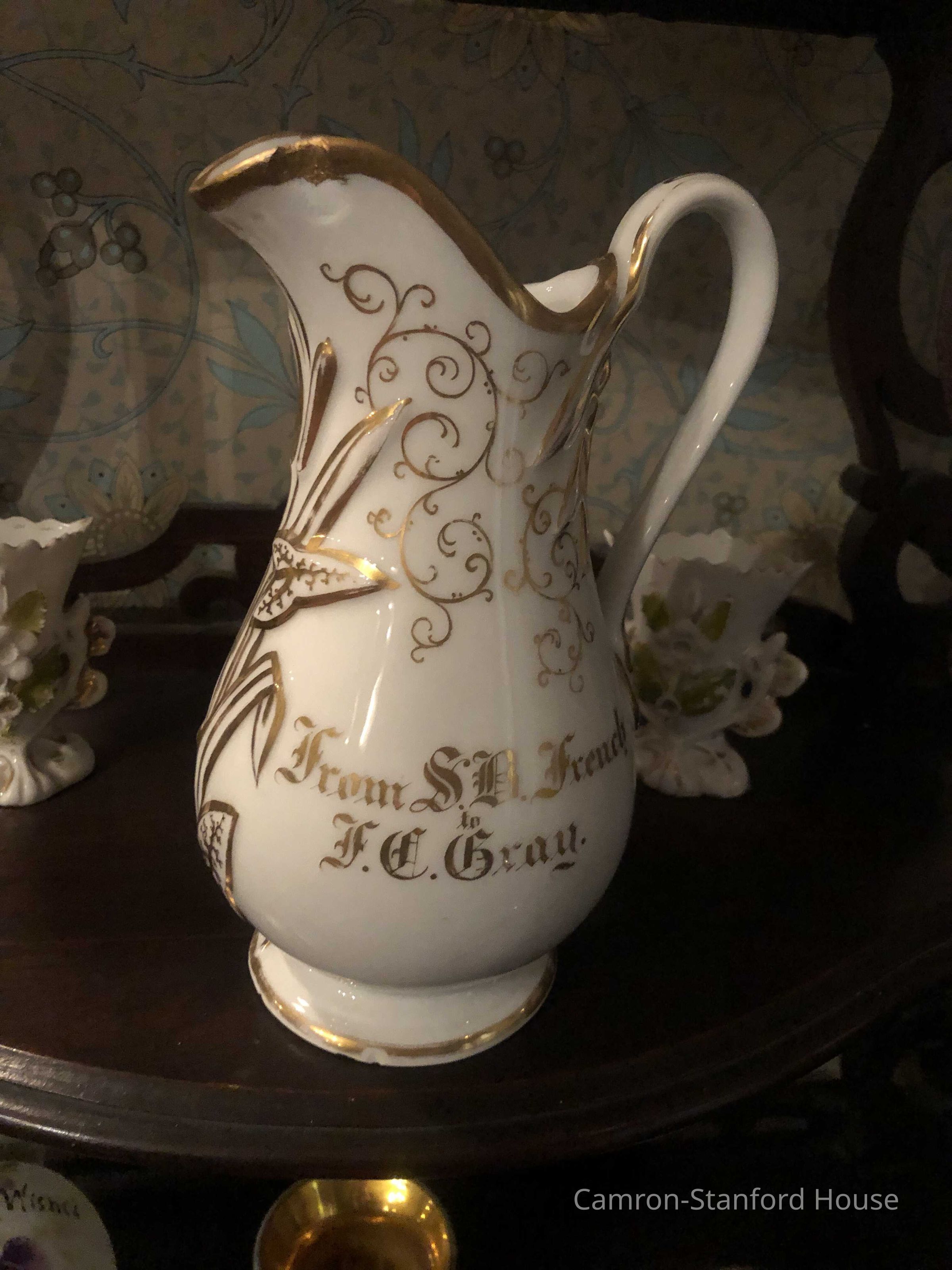 Family heirloom gift from Sara French to Franklina Gray. Gift noted in gold detailing- "From S.B. French to F. C. Gray." The pitcher is depicted in a childhood portrait of Franklina (see object #L91.061.3).