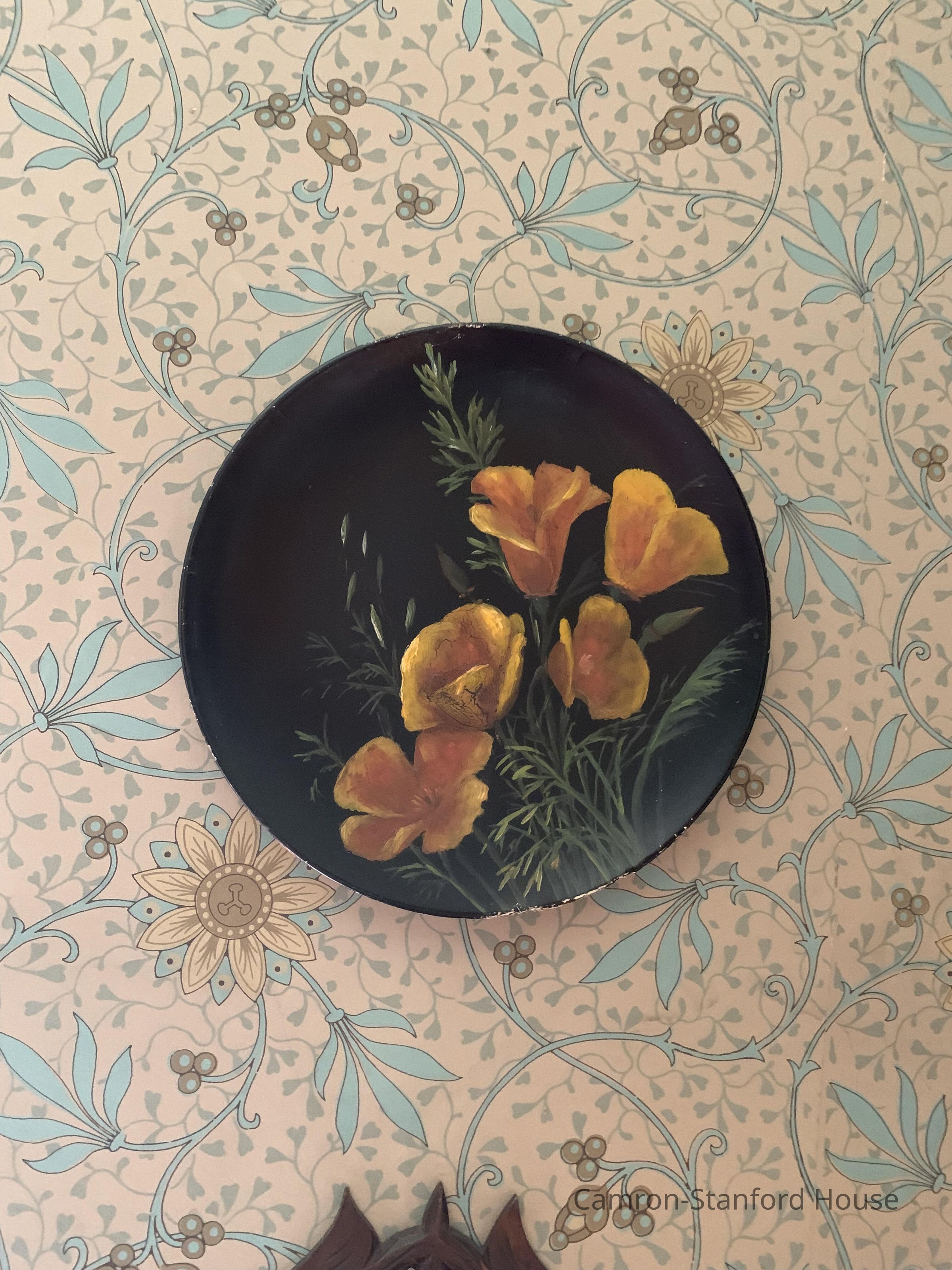Hand-painted lacquer plate with gold and orange poppies. Poppies are the state flower of California.