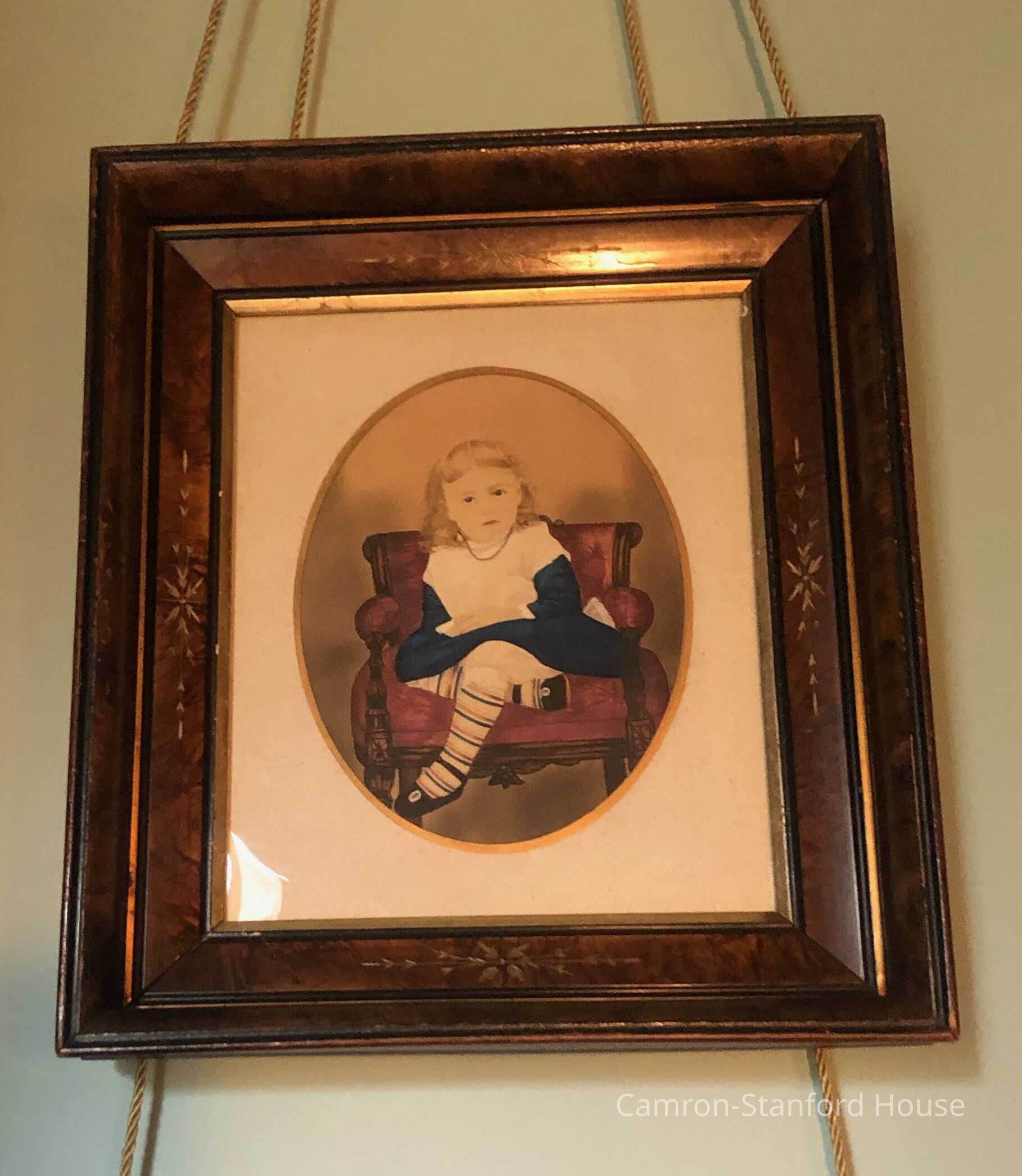Portrait of a child, Beulah Kaufman, titled "Little Pet." Painting is set in its original frame.