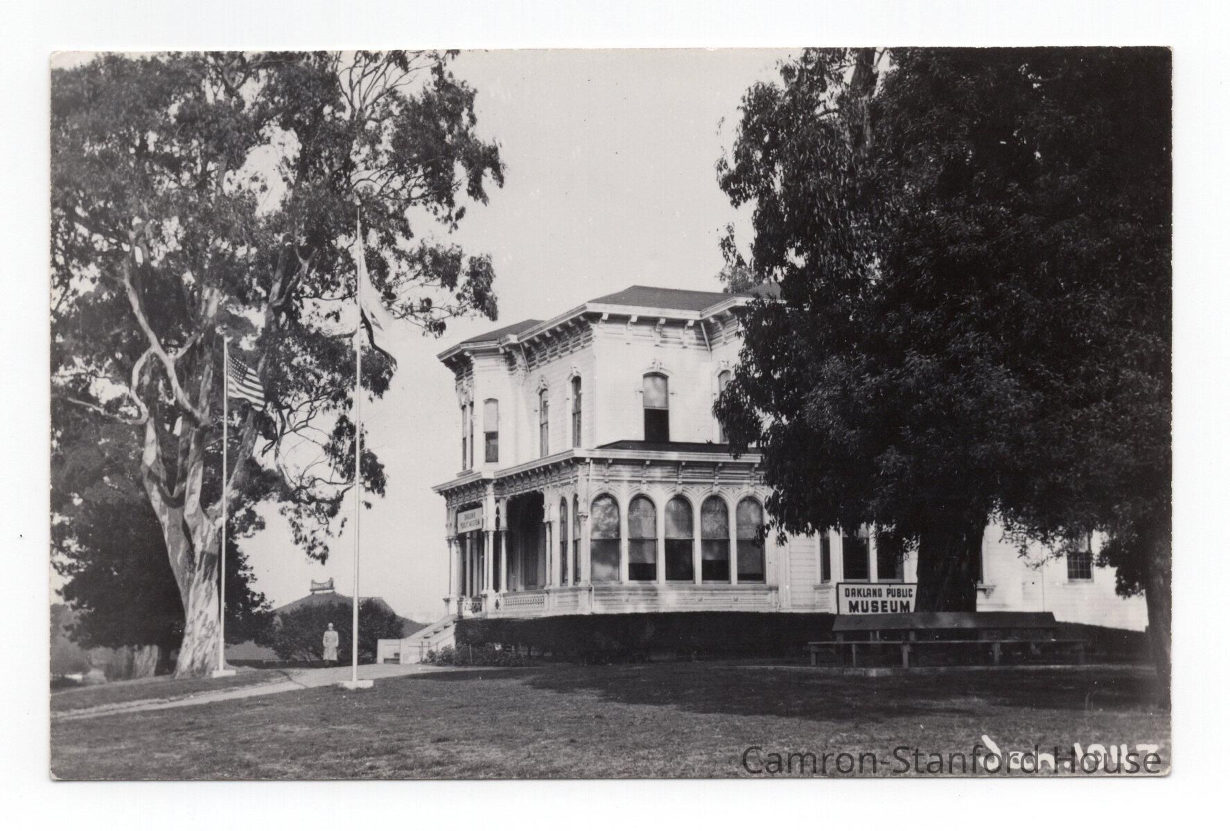Postcard showing the exterior of the Camron-Stanford House during its time as the Oakland Public Museum, in 1947.