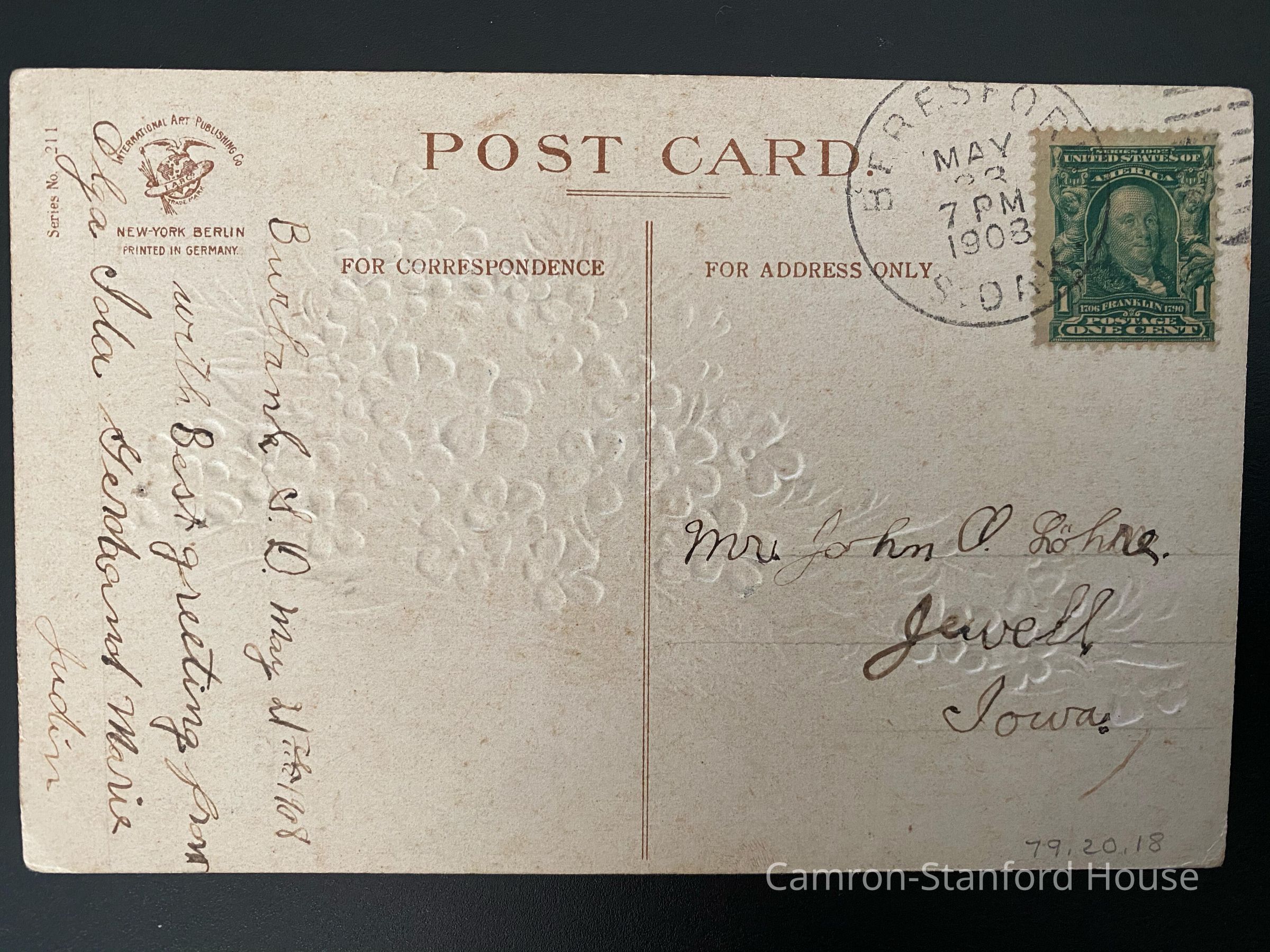 "Burbank S.D. May 21st, 1908 / with Best greetings from / Olga Ida Gendband Marie / Judin
