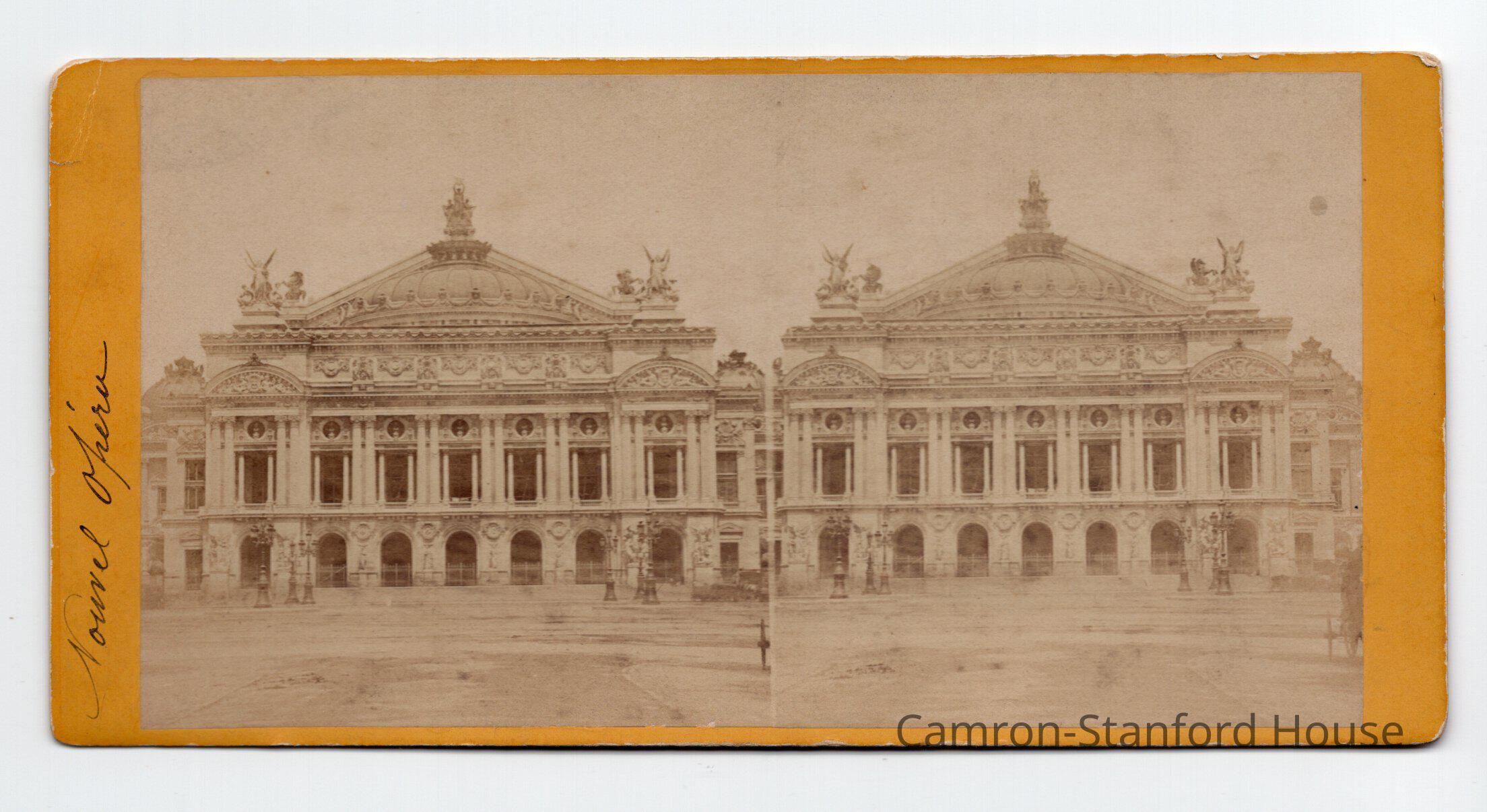 Stereograph card showing an image of Opera Nouvel, located in Lyon, France. Opera Nouvel is home to the Opéra National de Lyon. The building was designed by architect Jean-Marie Pollet in 1831.