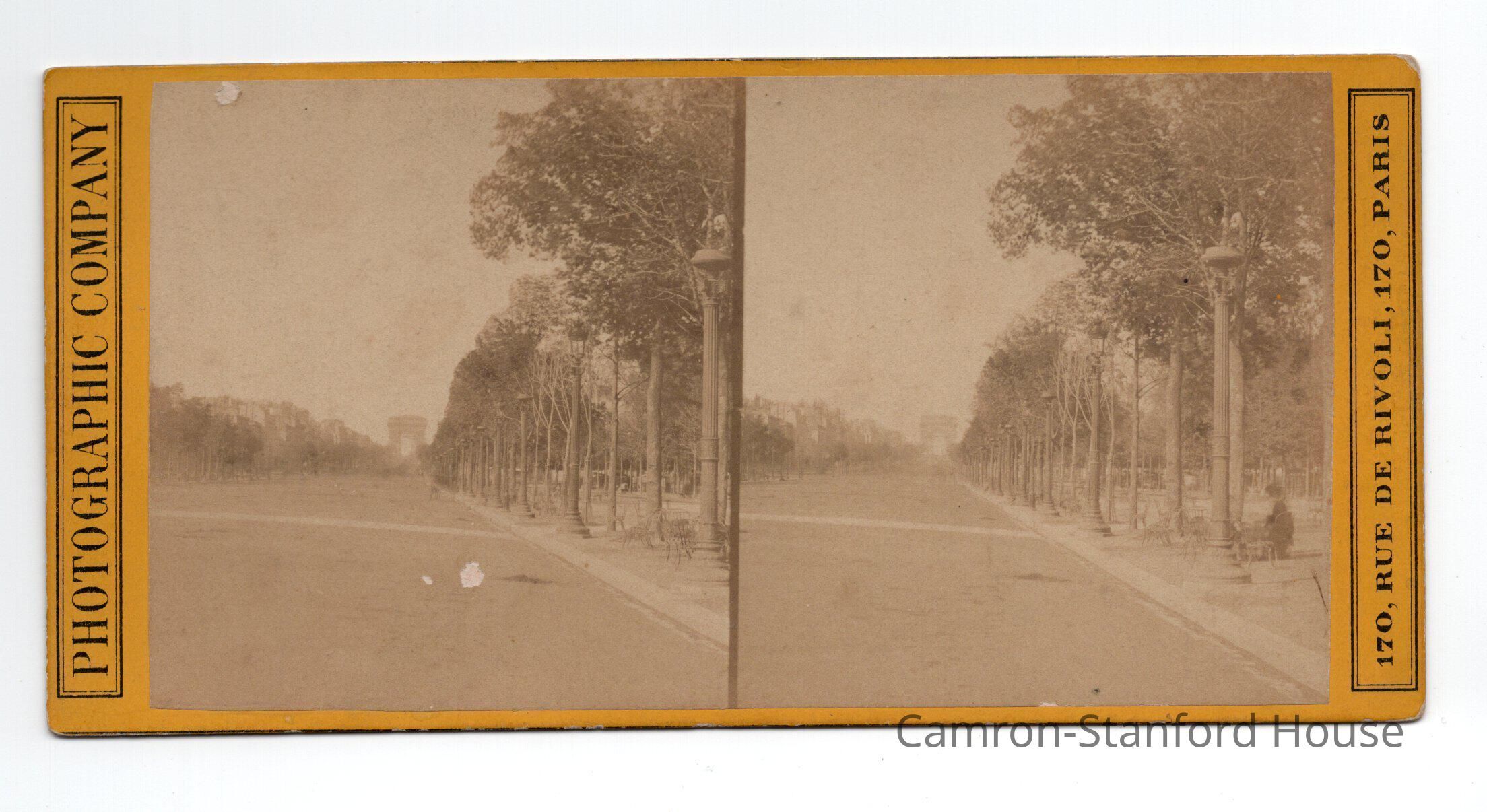 Stereograph card showing an image of Champs-Elysees in Paris, France.