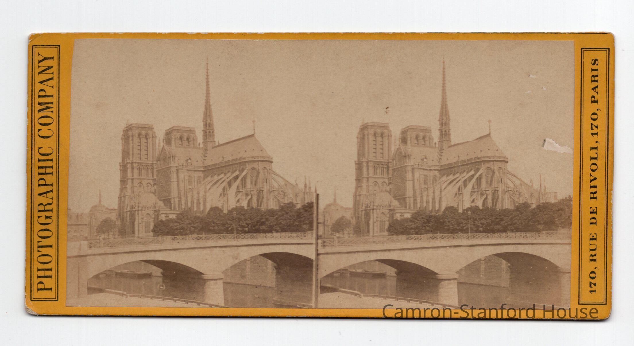 Stereograph card showing an image of Notre Dame Cathedral in Paris, France.