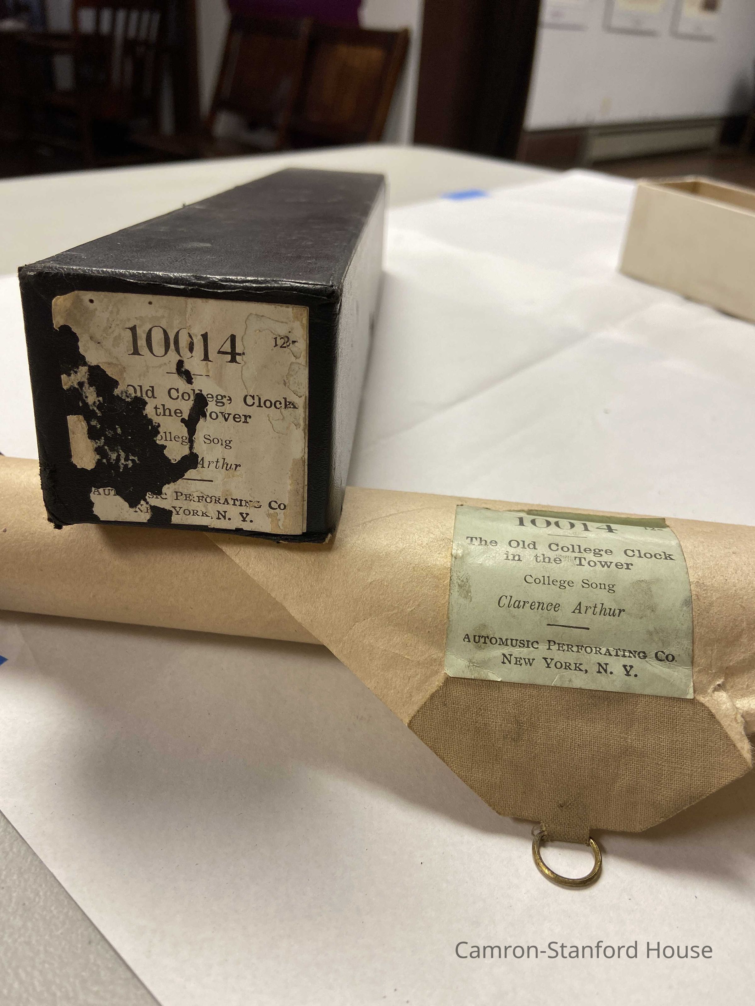 Music roll used with a player piano. Song is titled "The Old College Clock in the Tower"
