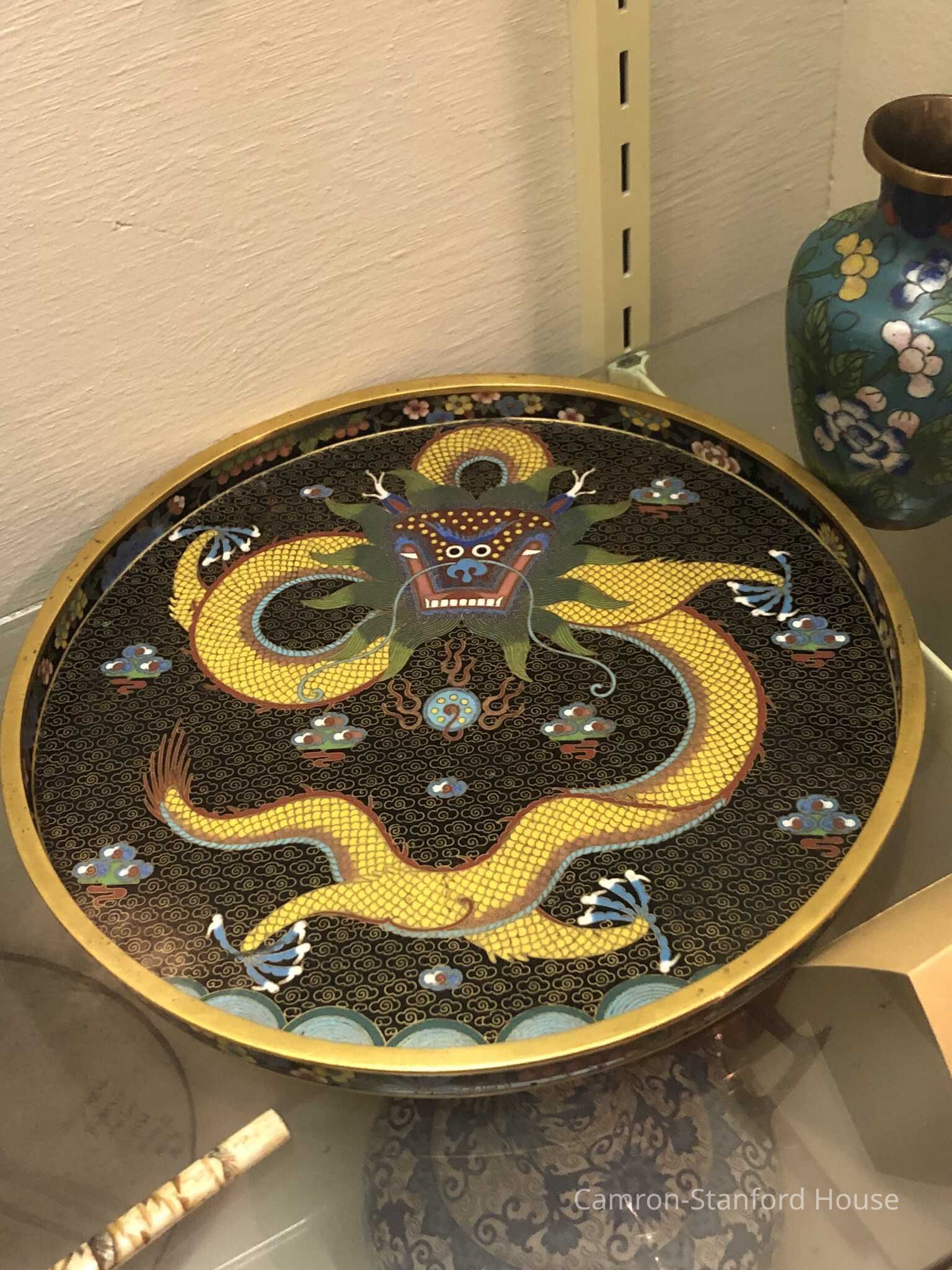 Round brass tray with cloisonne decorative work depicting a yellow dragon with green accents on head. Original PPIE customs sticker on back of object. Item sold during the Panama-Pacific International Exposition in 1916.