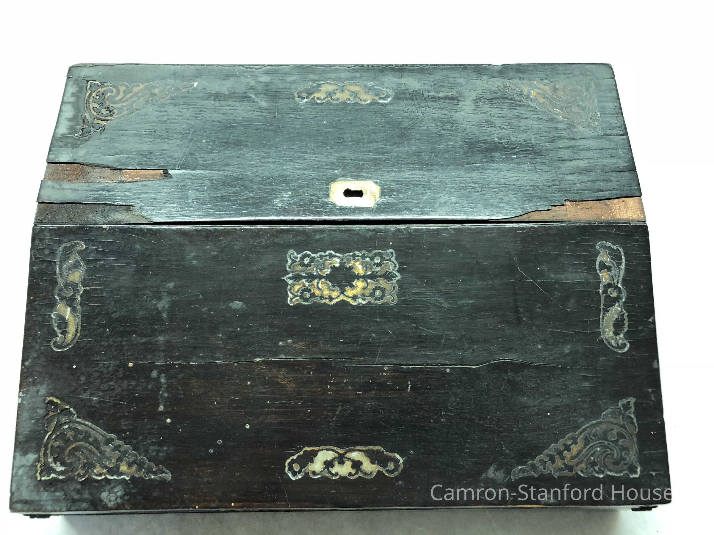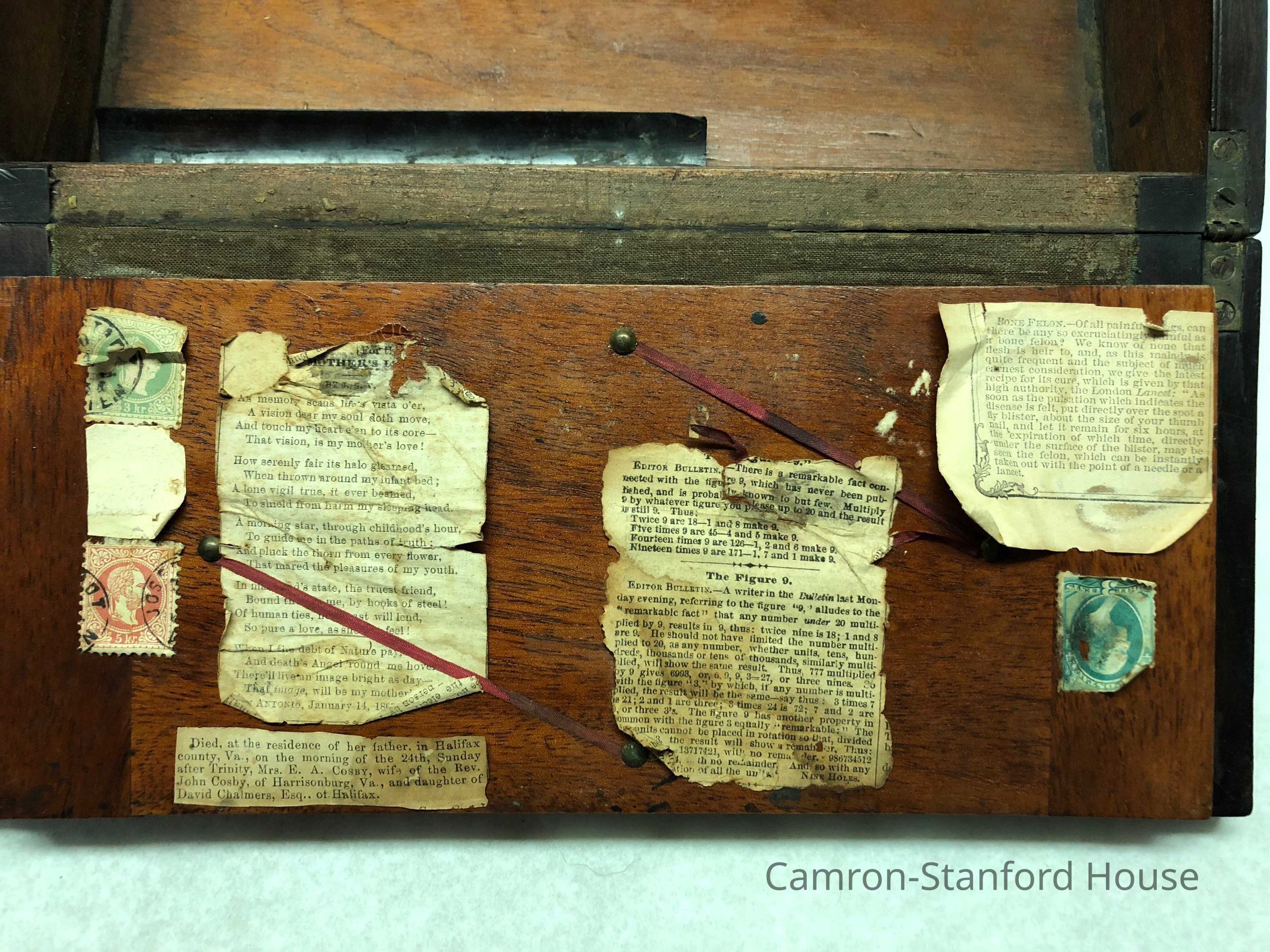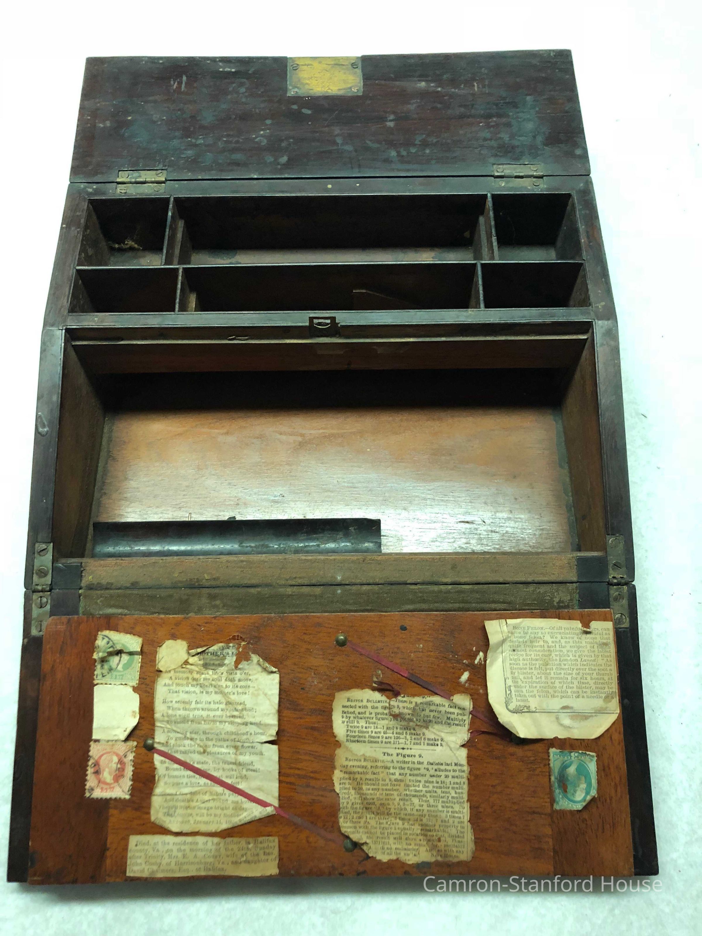 Laptop writing desk owned by Franklina C. Gray. The wooden desk top folds out to reveal a green velvet writing space and two storage trays that would have been used for paper, inks and writing instruments. The desk contains a number of newspaper clippings and ephemera collected by Franklina.