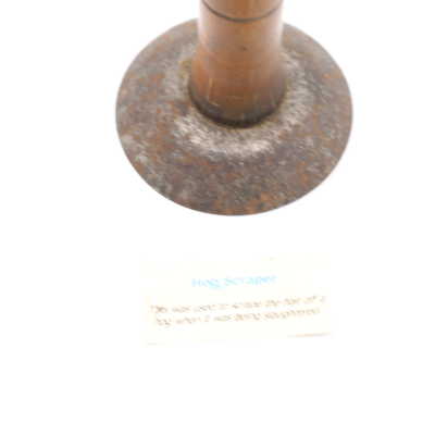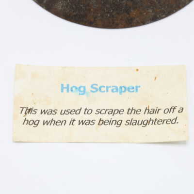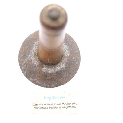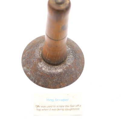 Likely dating back to the nineteenth or early twentieth century, this wood and metal hog scraper was used to remove hair from the hog's hide after it was slaughtered and immersed in hot water to loosen the hairs. Similar hog scrapers are still in use today.Location