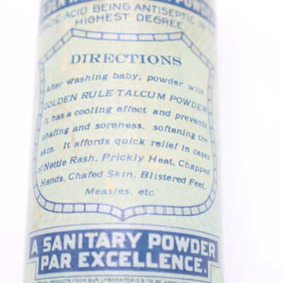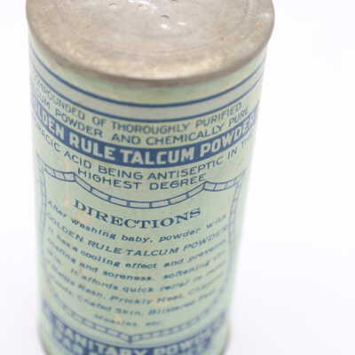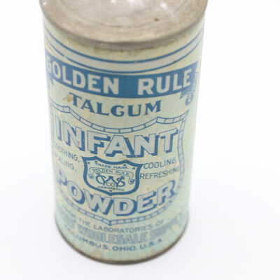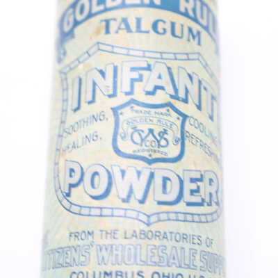 This can of Golden Rule Talcum Infant Powder likely dates back to the early twentieth century. The bottom of the can includes the text “From the Laboratories of The Citizen's Wholesale Supply, Columbus, Ohio, U. S. A. 'A Sanitary Powder Par Excellence'." The Citizens Wholesale Supply Company began in Columbus in 1895 and sold a wide variety of items, often under the Golden Rule name.Location