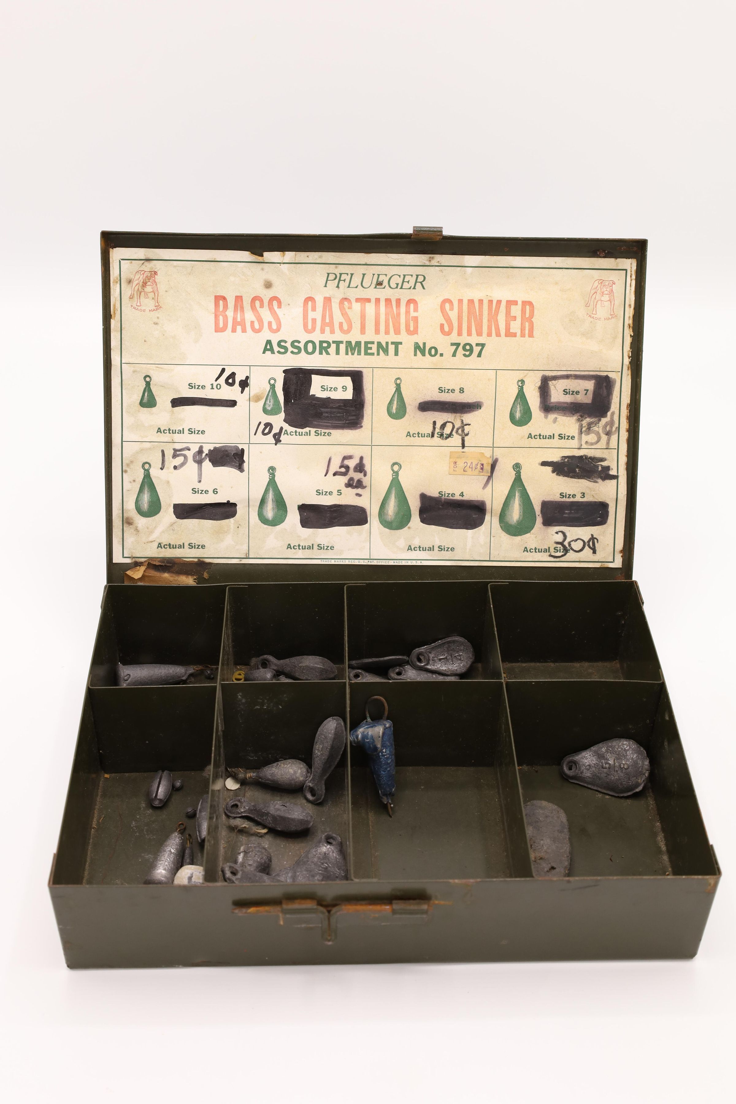 This sales box containing Pflueger Bass Casting Sinkers, Assortment No. 797, has the Pflueger bulldog trademark in the top corners and 8 sinker compartments. F. Pflueger founded a fish hook company called the Enterprise Manufacturing Company in 1881 in Akron, Ohio. His son E. A. Pflueger expanded the company and founded the E. A. Pflueger Company that is still in business today. The original prices, ranging from 4-14 cents, are blacked out and replaced with updated prices on this box.Location