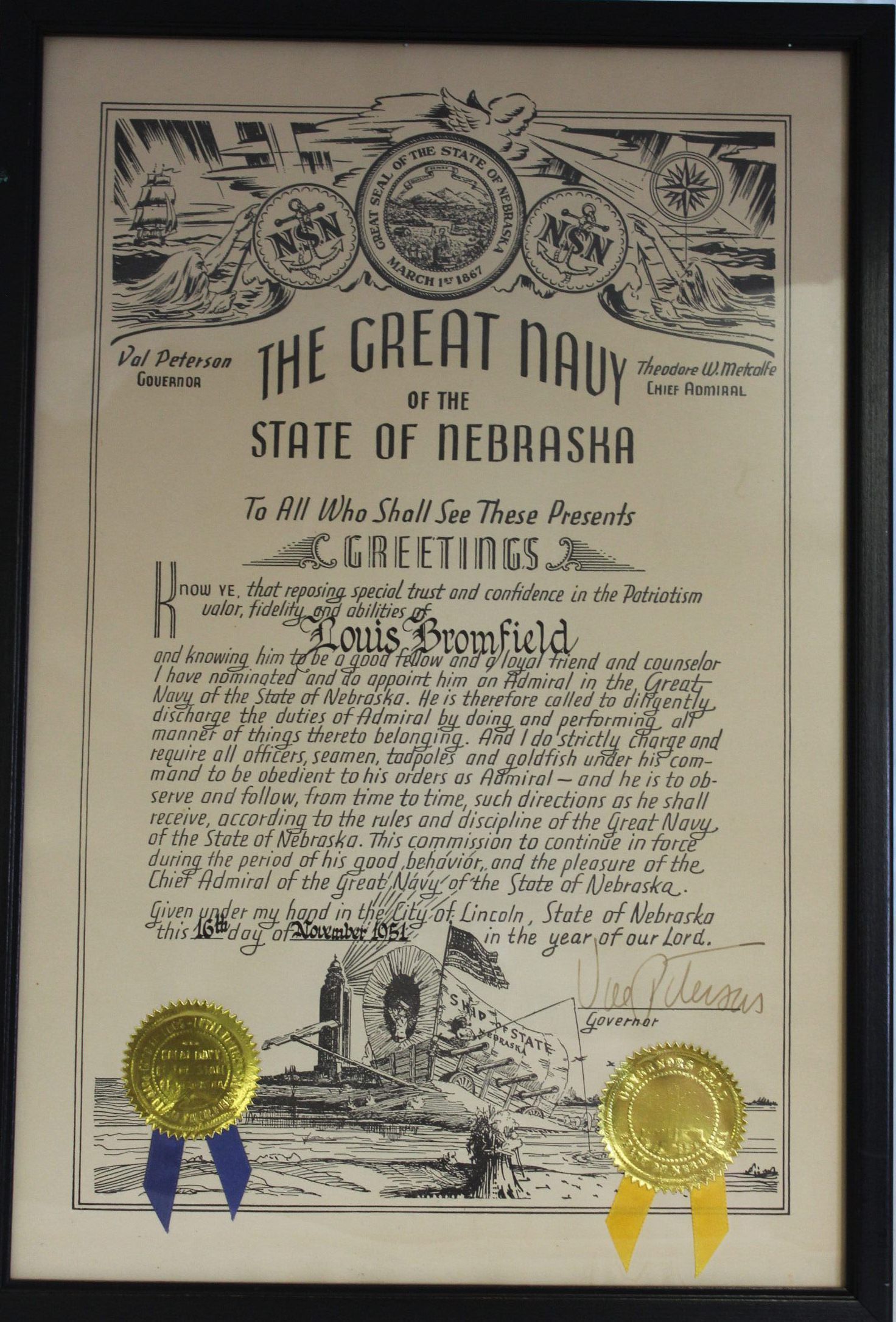 On November 16, 1951, Val Peterson, the Governor of Nebraska, named Louis Bromfield an Admiral of the Great Navy of the State of Nebraska. The top of the certificate has the seal of the State of Nebraska and two seals of the Navy of the State of Nebraska imposed over an ocean scene with a cherub blowing air across the sea, a ship with sails in the background, and Poseidon or Neptune on either side of the seals. On the bottom of the certificate, a drawing of farmland features a covered wagon with "ship of state Nebraska" written on the cover. The American flag flies in front of the wagon, and light shines from a tower in the background.Context