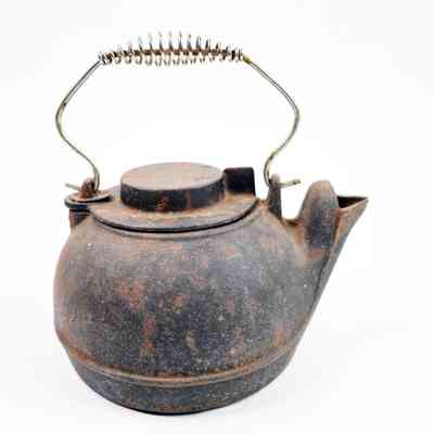Cast iron kettle, of a design common to the late 19th-early 20th century. Stainless steel coiled handle likely not original.