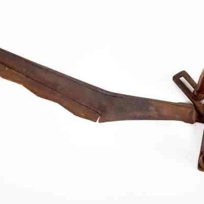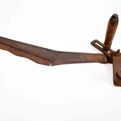 A hay knife is used to cut manageable portions of hay from a larger stack, which is especially necessary after the hay has been compacted and settled over time. The long, serrated blade was used to saw off sections of compacted hay. It typically has two handles, allowing the user to apply force with both hands. The second handle is often adjustable to allow for a comfortable grip.