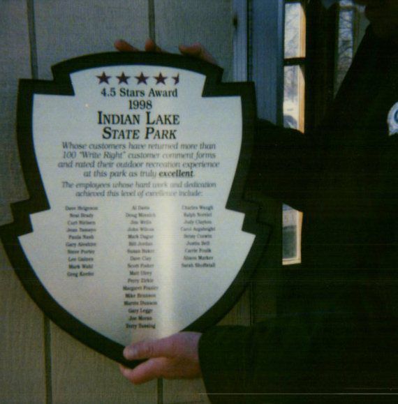 A park employee presents a plaque testifying to the overwhelming parkgoer satisfaction offered at Indian Lake State Park.
