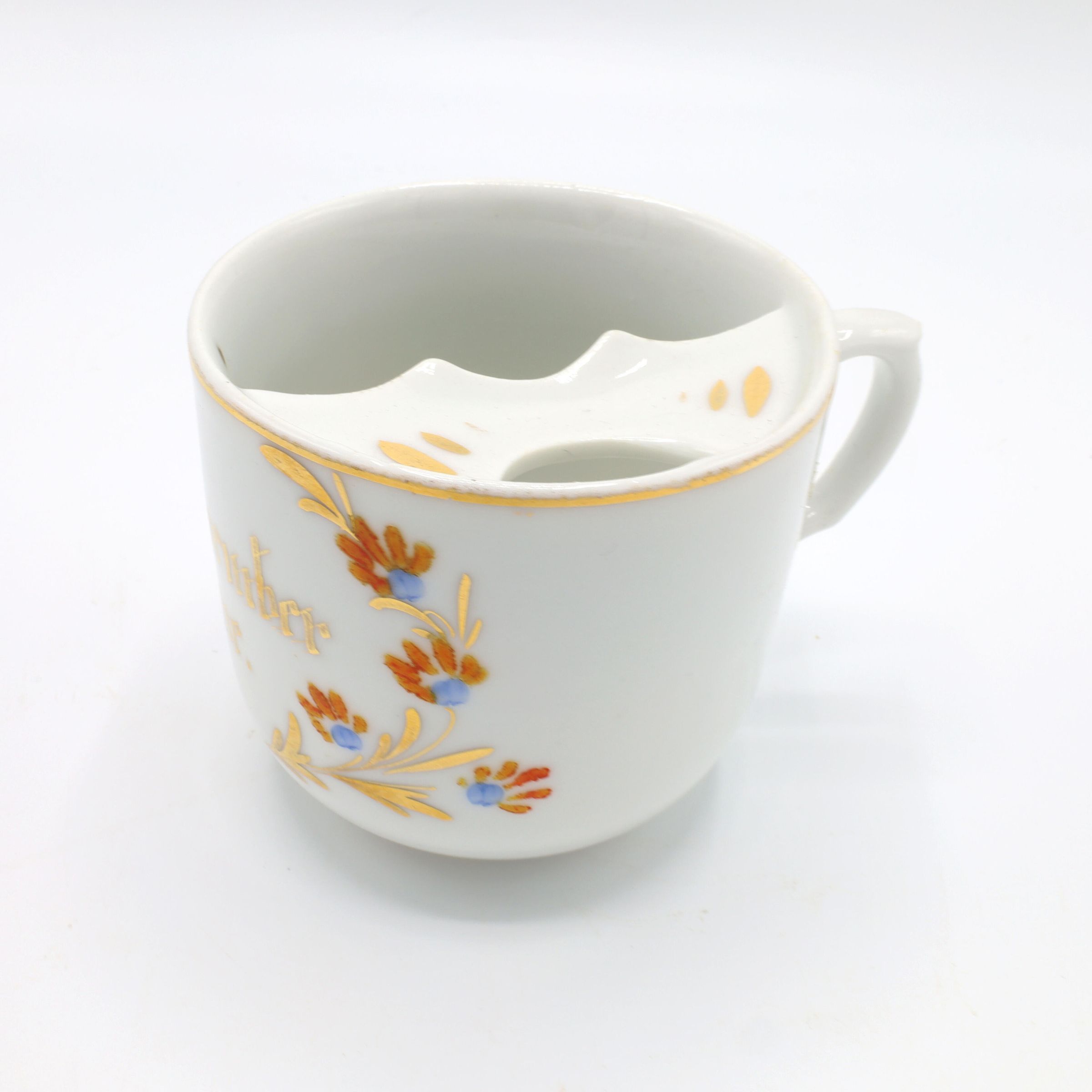This china mustache cup, glazed with gold, orange, and blue floral decoration and the phrase 'Remember Me' in gold, offers a reminder of a fleeting cultural moment. Mustache cups were invented in the 1870s to protect men's facial hair from hot liquids. Most men at the end of the century had facial hair, and those who used wax or dye on their mustaches could experience damage to their facial hair style when drinking tea. The lip on the mustache cup protected the hair from the liquid. The example of a mustache cup includes gold accents and a curved edge on the lip. There are also hand-painted numbers on the bottom of the cup.