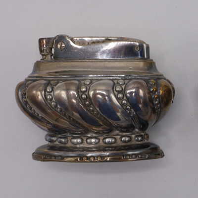 This silverplated table lighter was produced by Ronson Art Metal. It is a Queen Anne design with a simple beaded border at the top and bottom as well as vertical lines around the center.