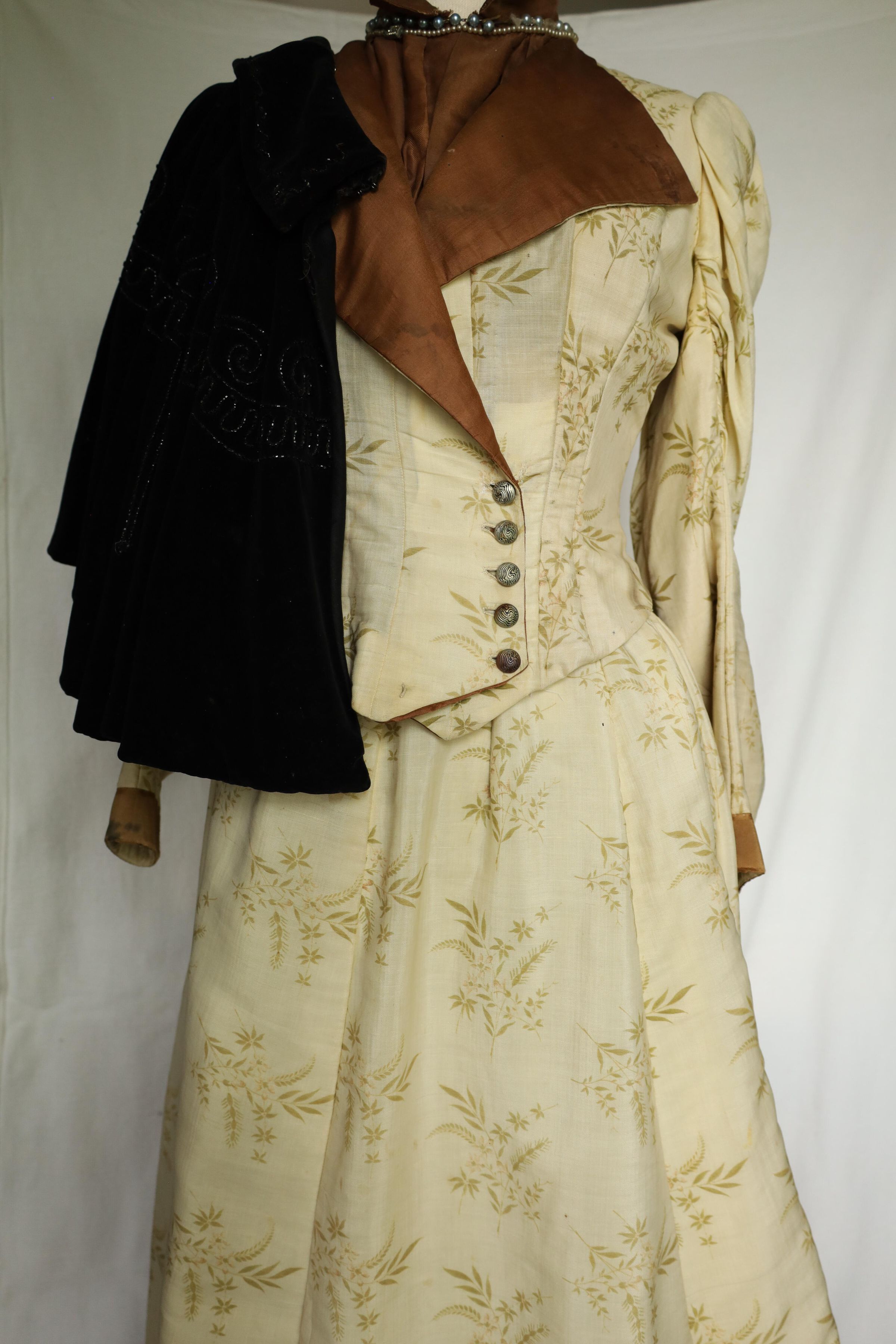 This is a 19th century woman's dress and cape with a mahogany brown inner layer to complement the off-white outer layer. The outer layer also presents a floral/leaf print. A dark brown cape is draped over the bust mannequins shoulder and two choker necklaces are worn around the neck, one adorned with small pearls and the other with larger darker pearls.Location